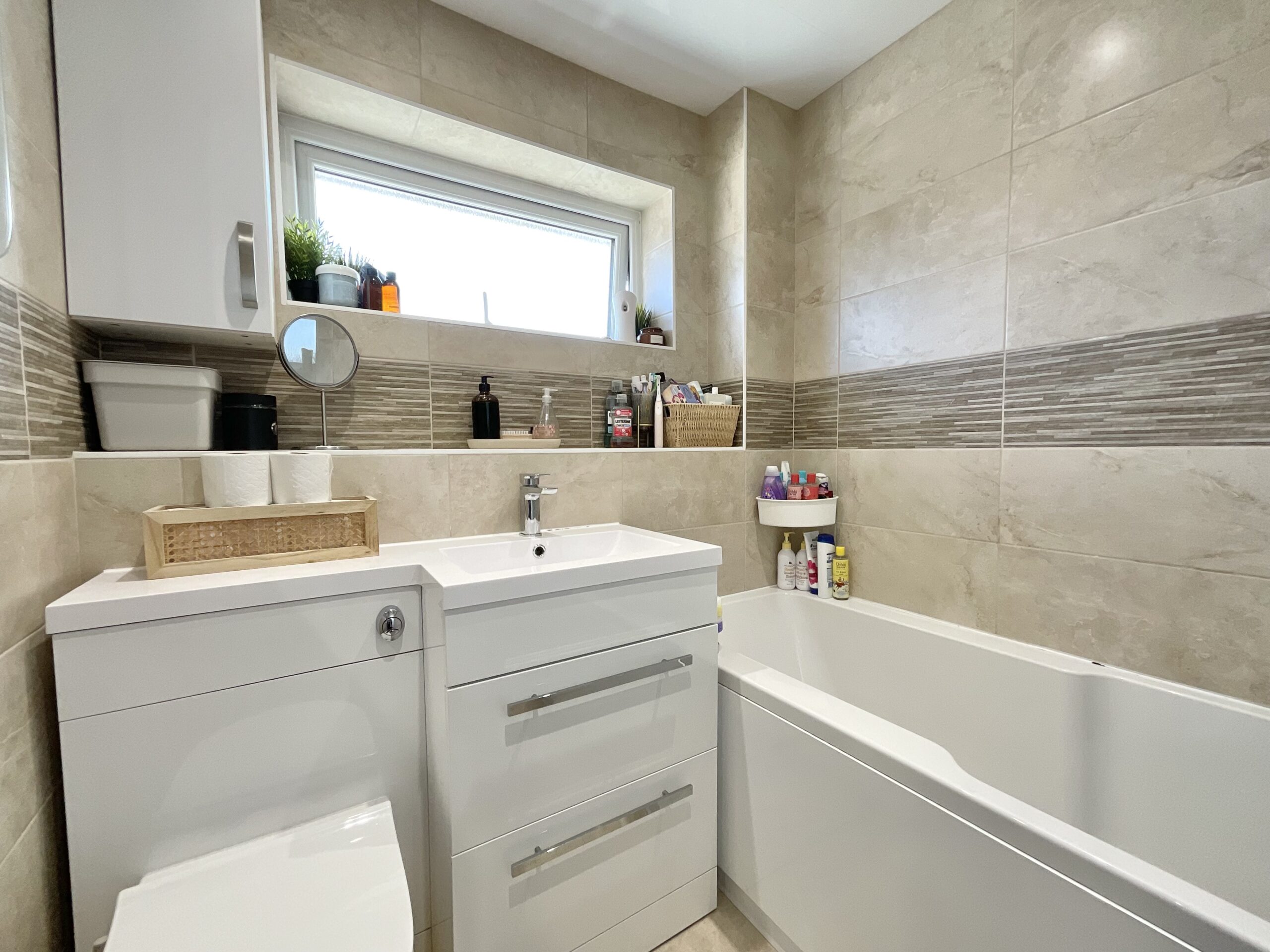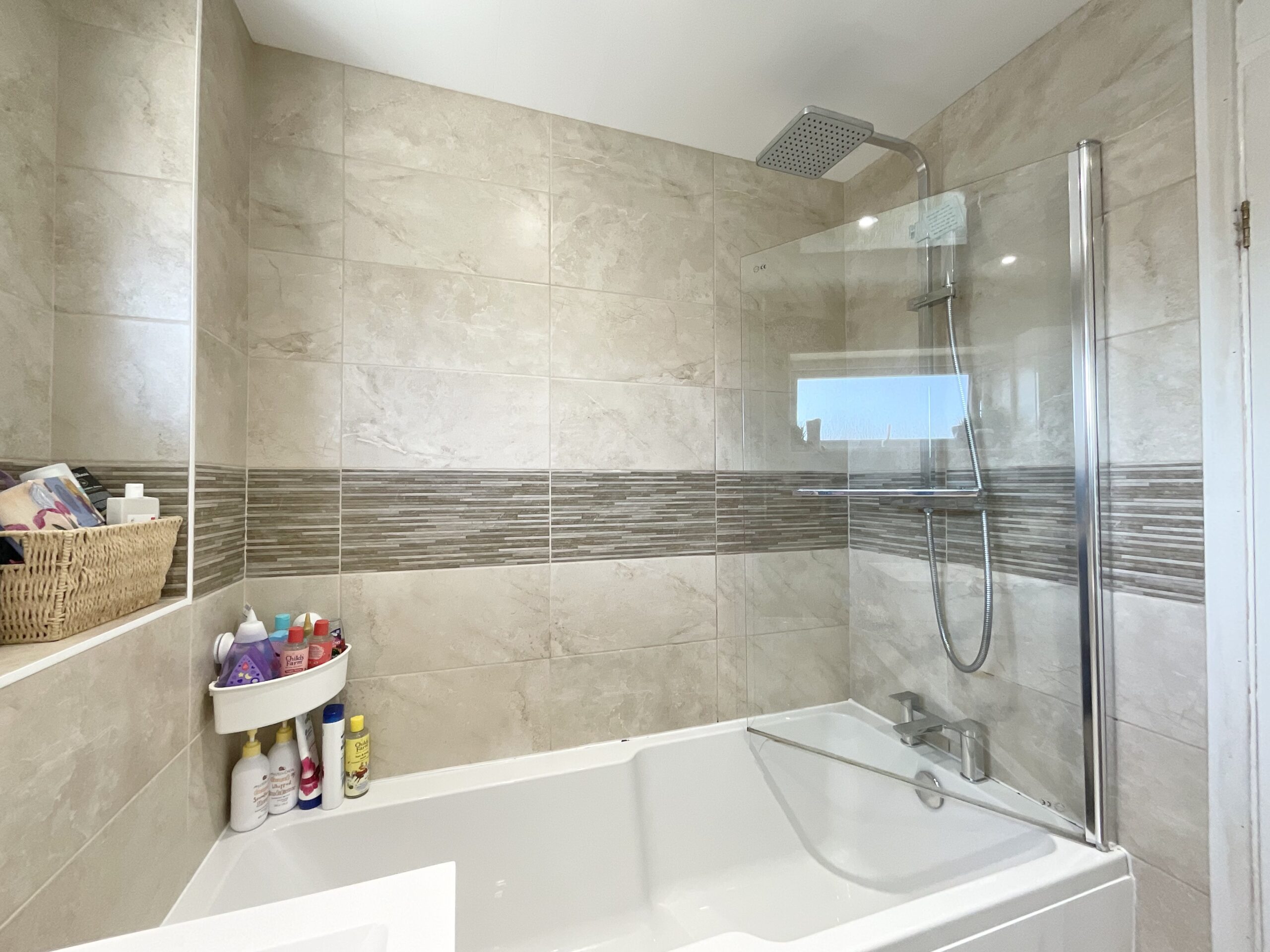 Upstairs, the property comprises three bedrooms. The main bedroom is generously proportioned and benefits from built-in wardrobes, offering excellent storage without compromising on space. The second bedroom provides a comfortable double or guest room, while the third bedroom is ideal as a child’s room, nursery, or home office. The family bathroom is fitted with a bath and overhead dual showerheads, combining practicality with a touch of luxury.