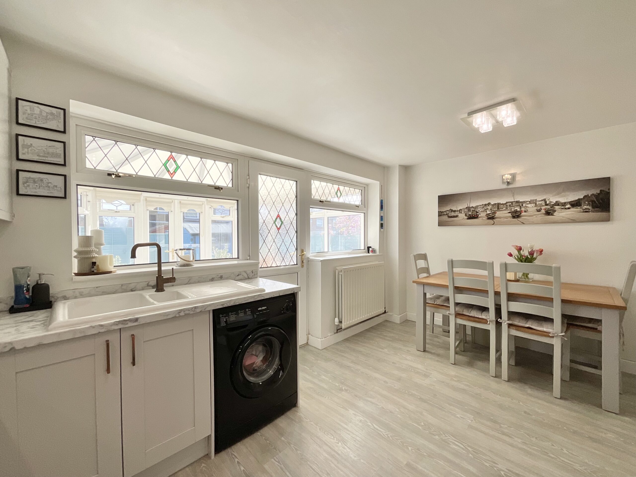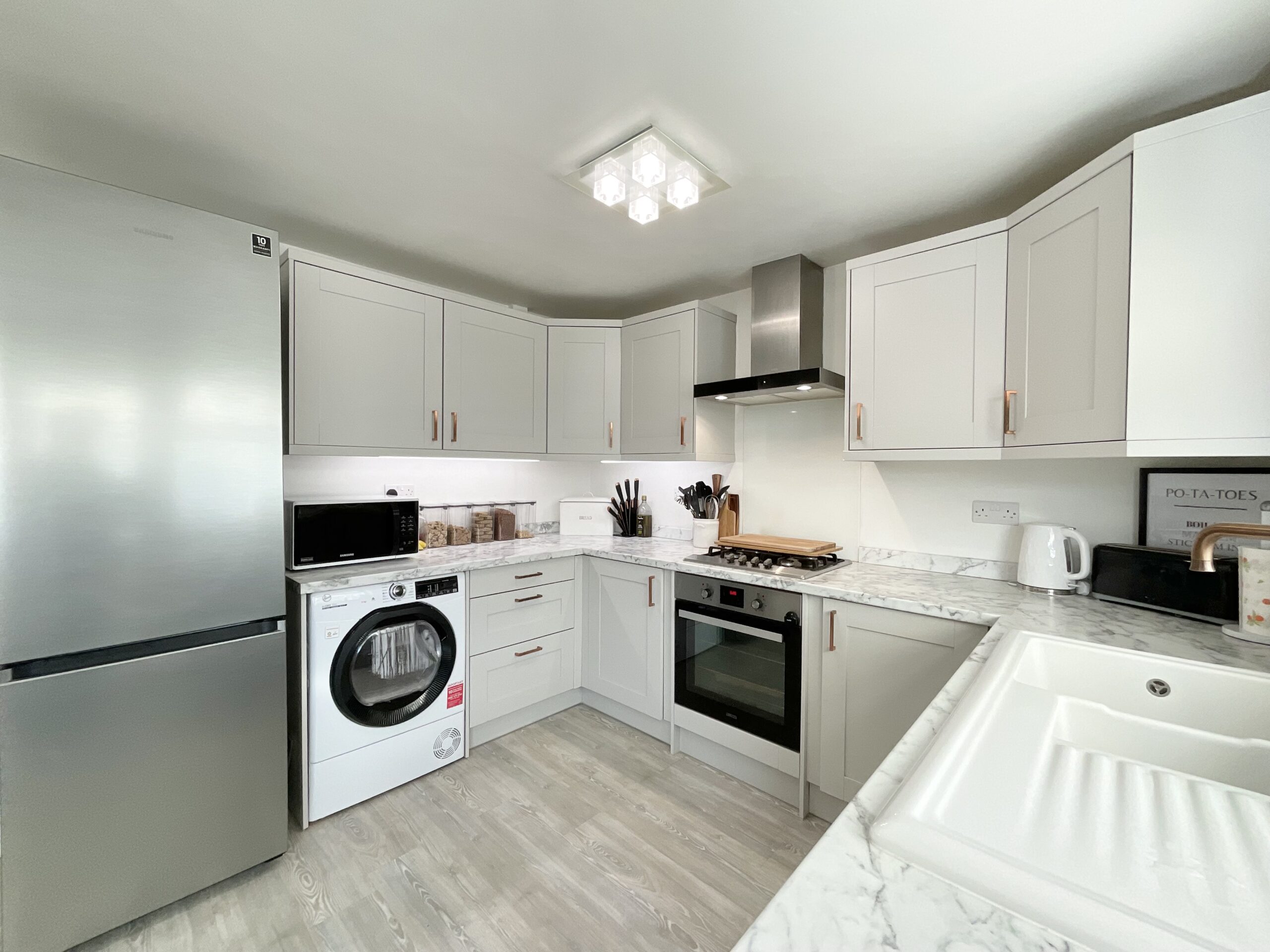1. Spacious kitchen/diner with integrated oven, gas hob, appliance space, and handy under-stairs storage cupboard.