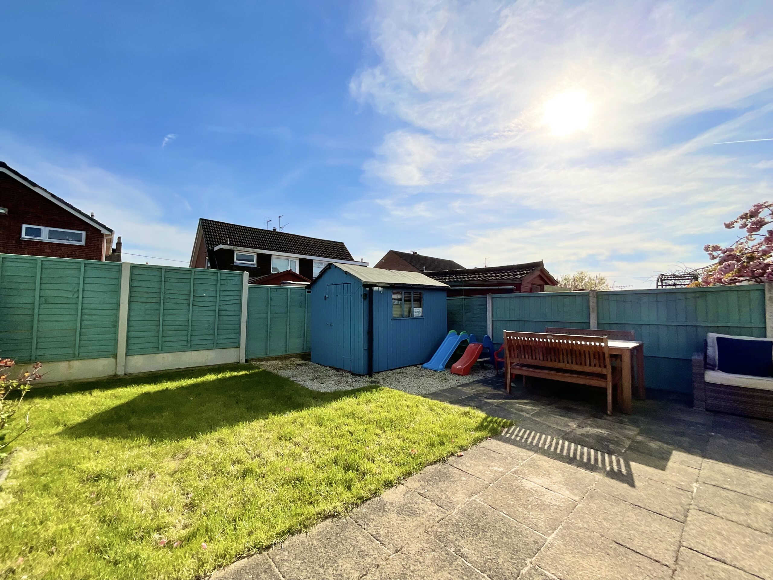 Externally, the rear garden is designed for both relaxation and entertaining, featuring a lawned area alongside a patio space ideal for outdoor seating and dining. A useful shed with electricity provides excellent additional storage or potential for use as a workshop or hobby space.