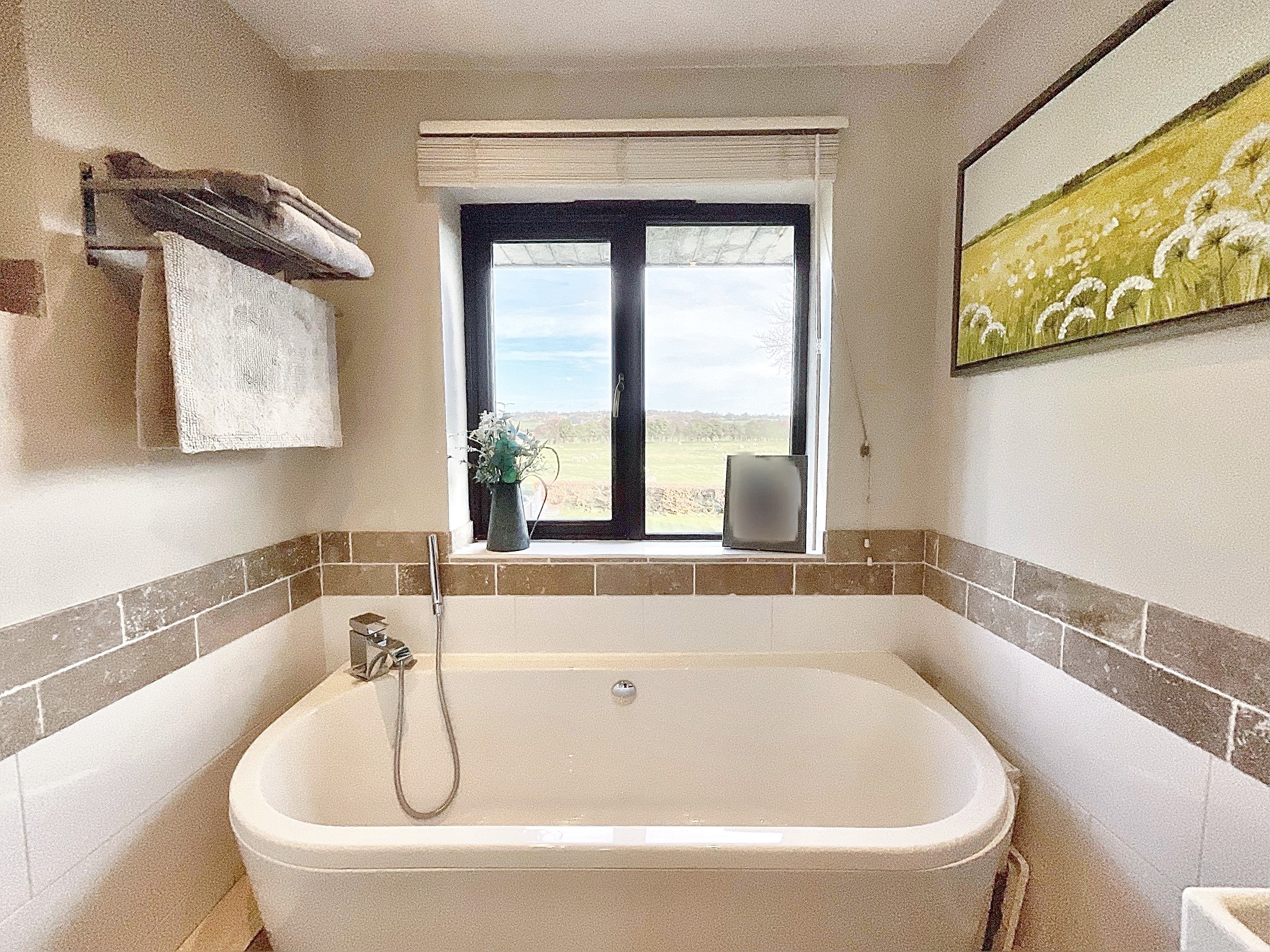 Upstairs the home offers five generously sized double bedrooms, including the master bedroom featuring vaulted ceilings and a stunning Juliette balcony overlooking miles of countryside, along with its own en-suite bathroom with a freestanding double-ended bath, his and hers sinks, and a walk-in shower. The family bathroom calls for relaxation with a sleek bath and a walk-in rainfall shower.