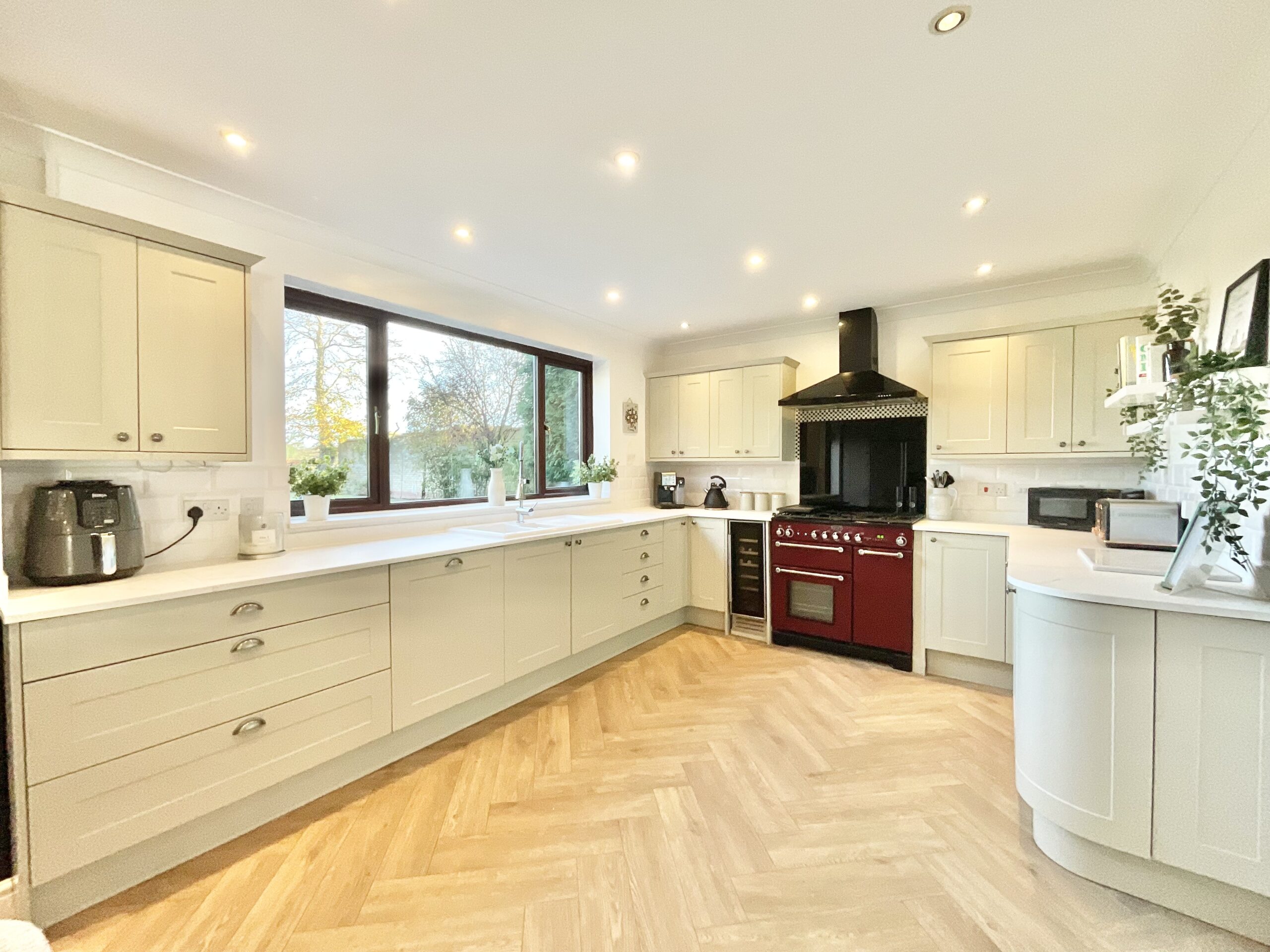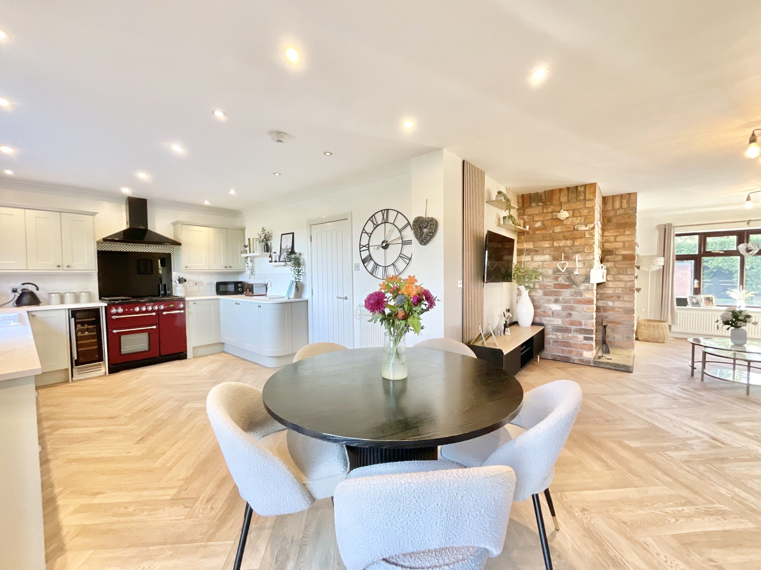 - Open-plan kitchen/living/dining, separate utility, living room with brick fireplace and log burner, plus a versatile sitting room, ideal for a bar, games room, study, or playroom.