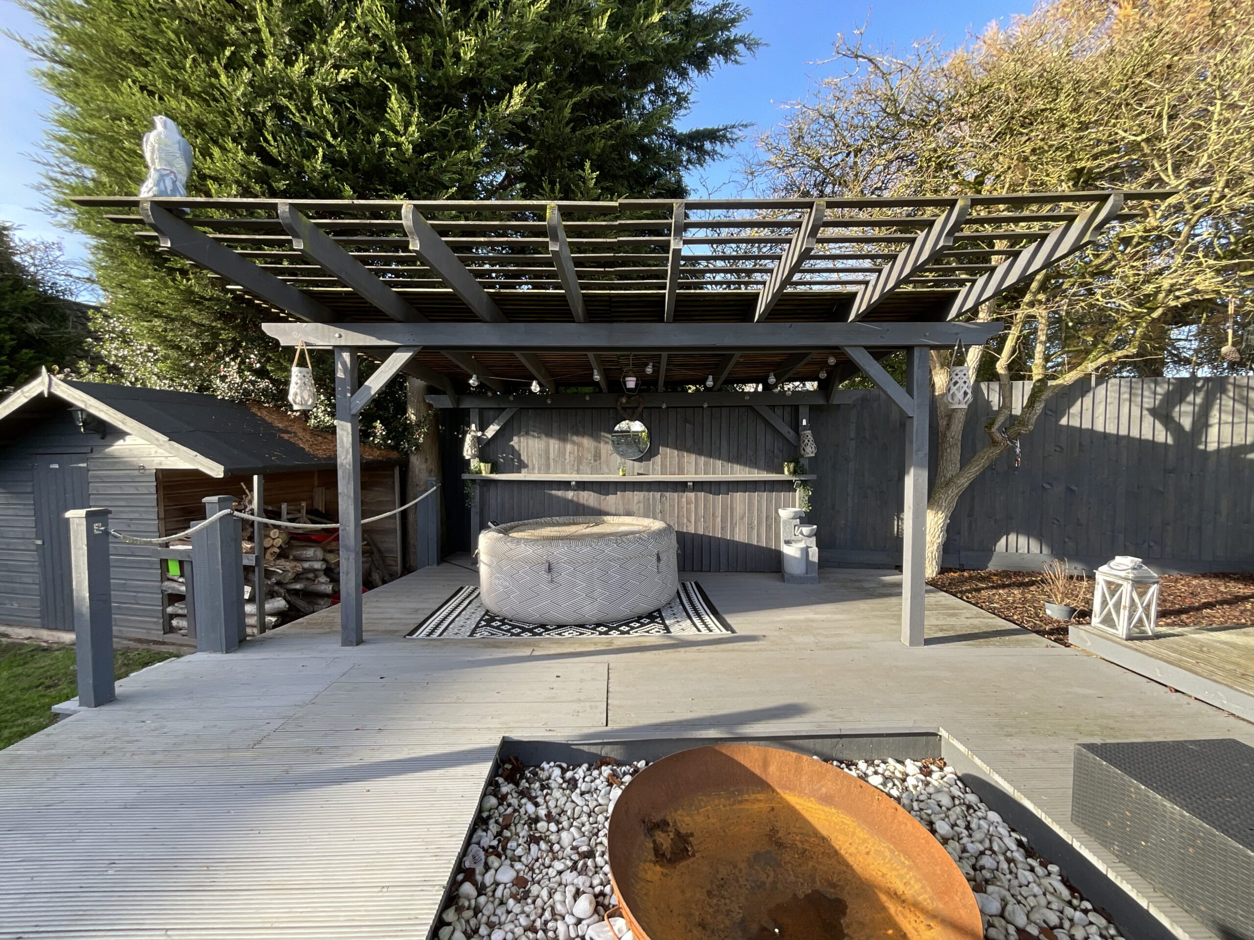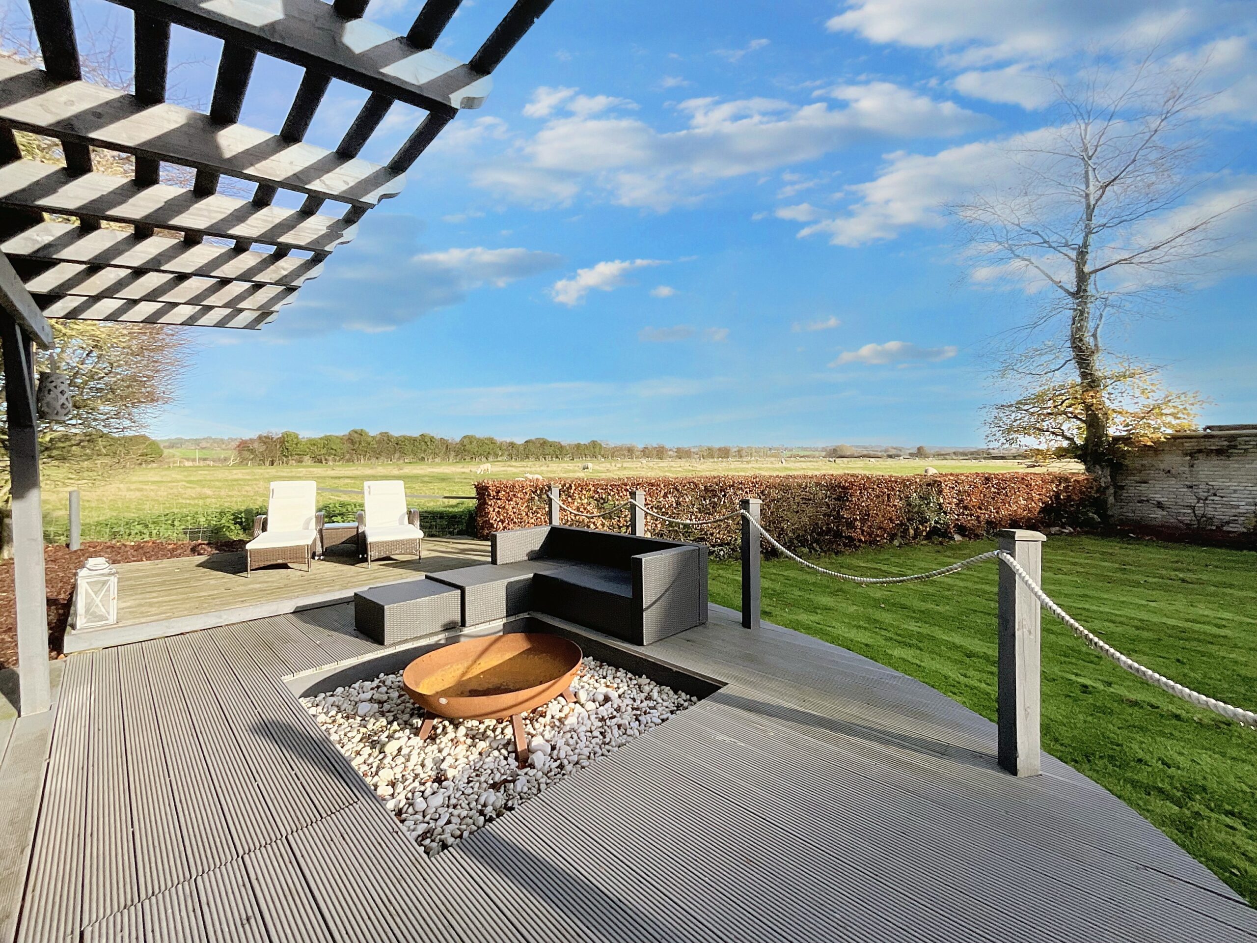 Convenient side access leads you to the rear garden boasting a large patio seating space, a beautifully manicured grass lawn, and a tiered decked seating area with room for a hot tub and sun loungers that overlook the fields beyond.