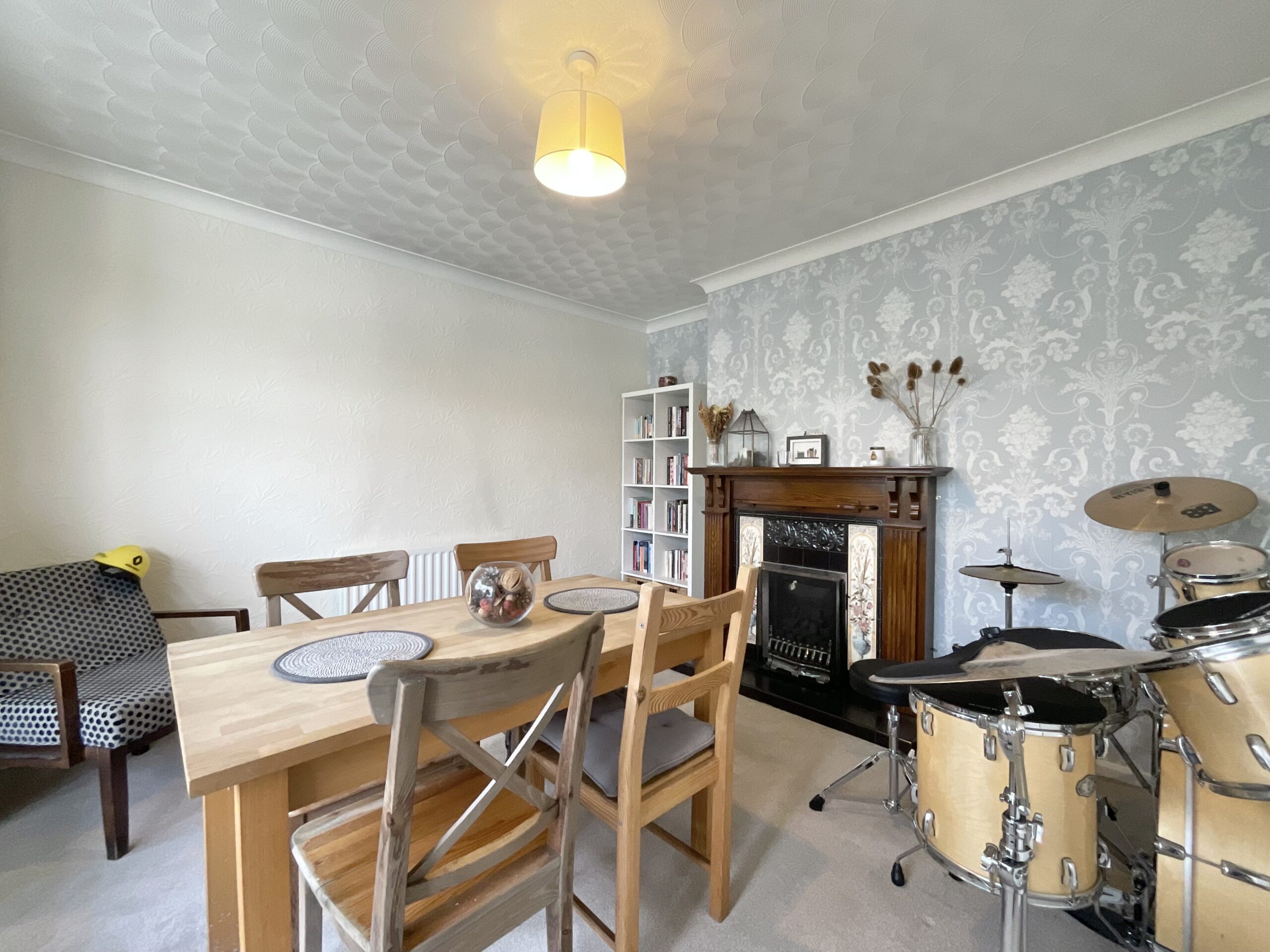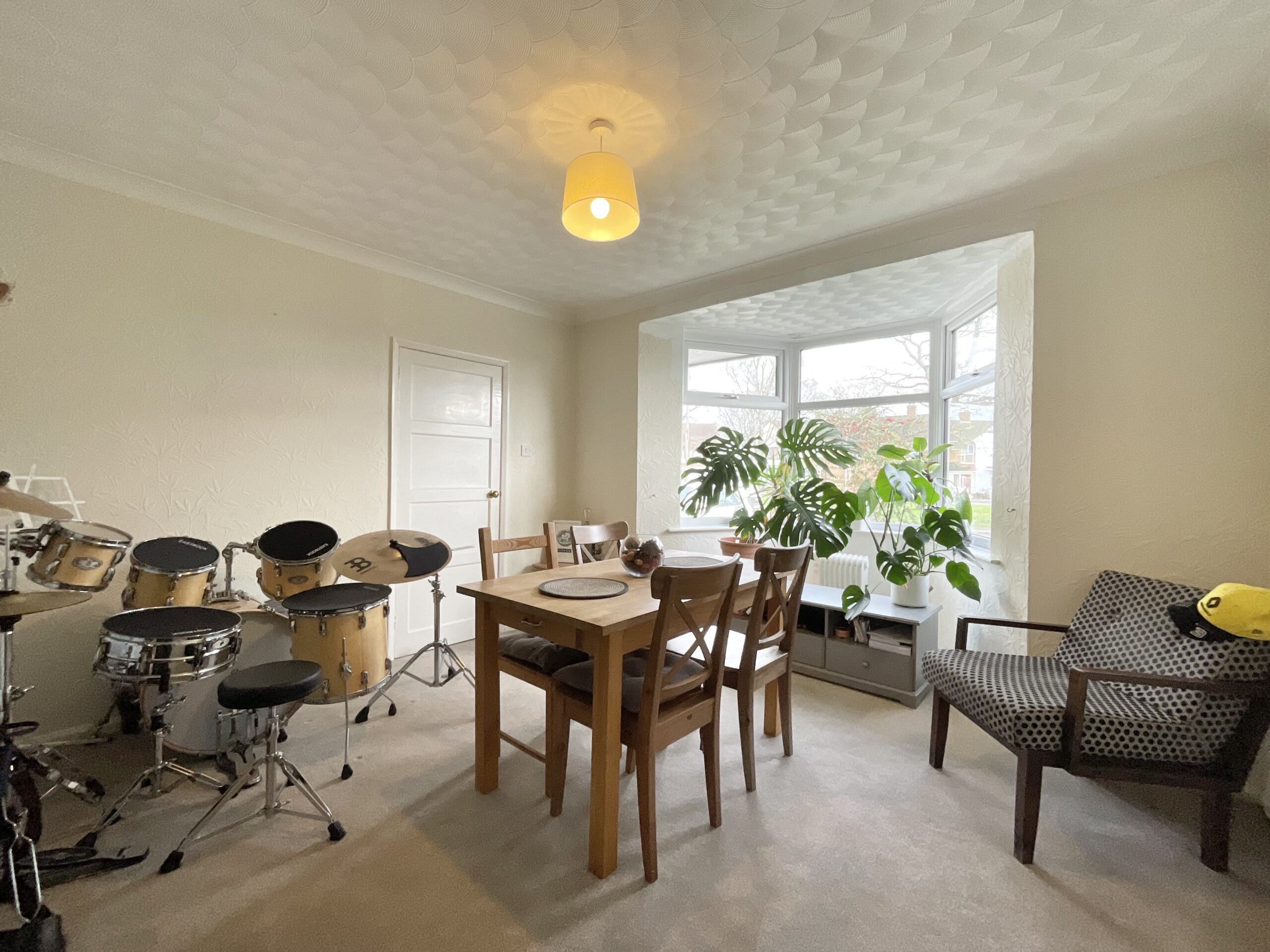 The living room is spacious and welcoming, featuring a bay window that allows plenty of natural light to fill the room, along with a cosy fireplace that creates a warm and comfortable atmosphere. Adjacent to this, the dining room is currently used as an additional lounge but could easily accommodate a dining table, offering versatility to suit a range of lifestyles. A useful storage cupboard is also located within the dining room.