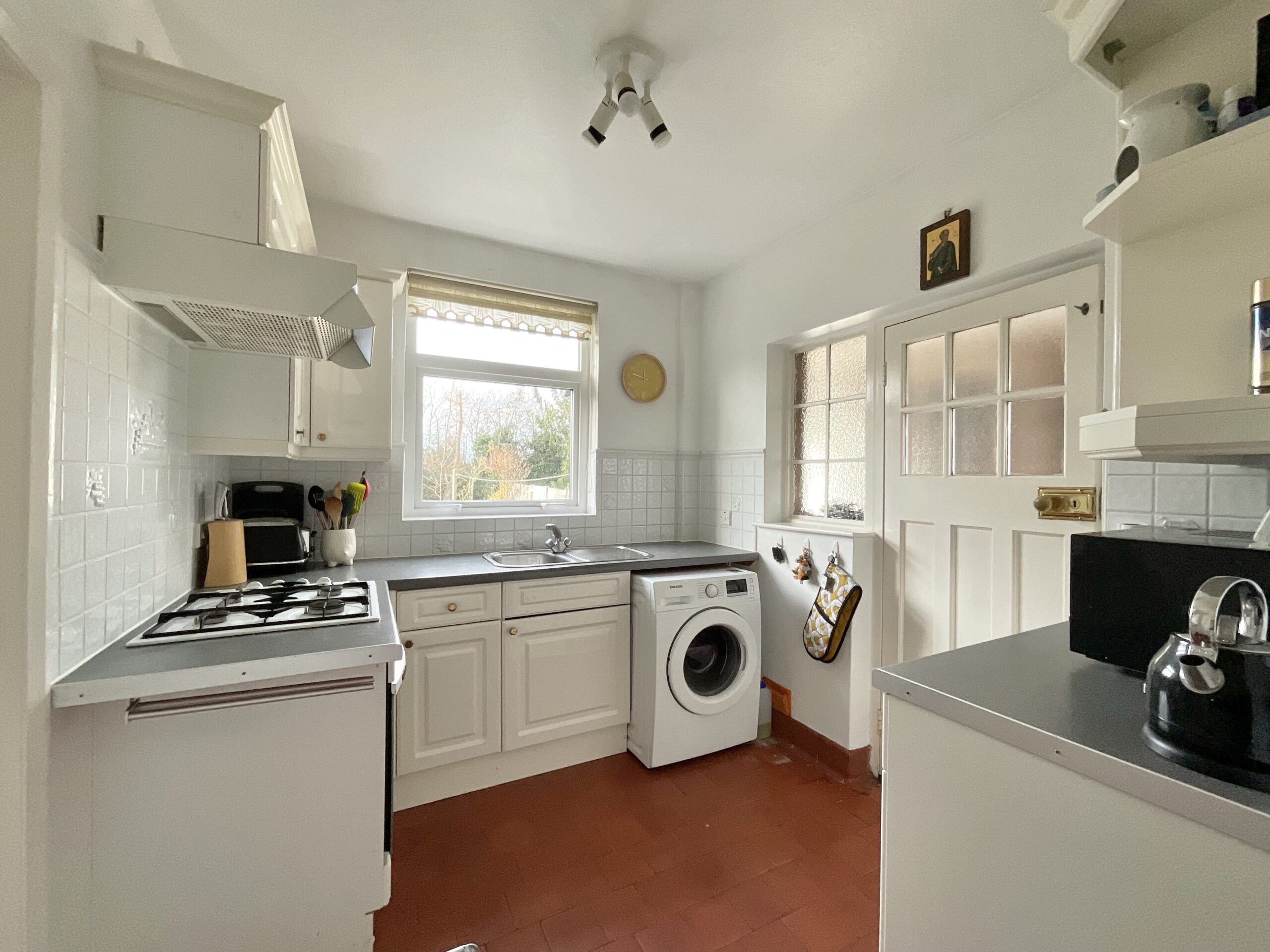The kitchen provides space for a fridge, oven, and washing machine, along with a plentiful amount of cupboard storage, making it a practical and functional area for everyday use. Connecting the main living areas is a hallway that leads to three additional rooms: a utility room, a storage cupboard, and a conveniently positioned downstairs WC.