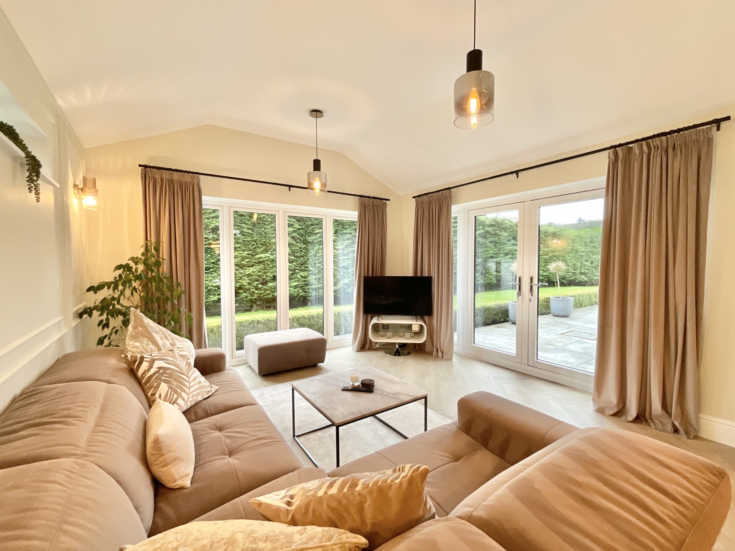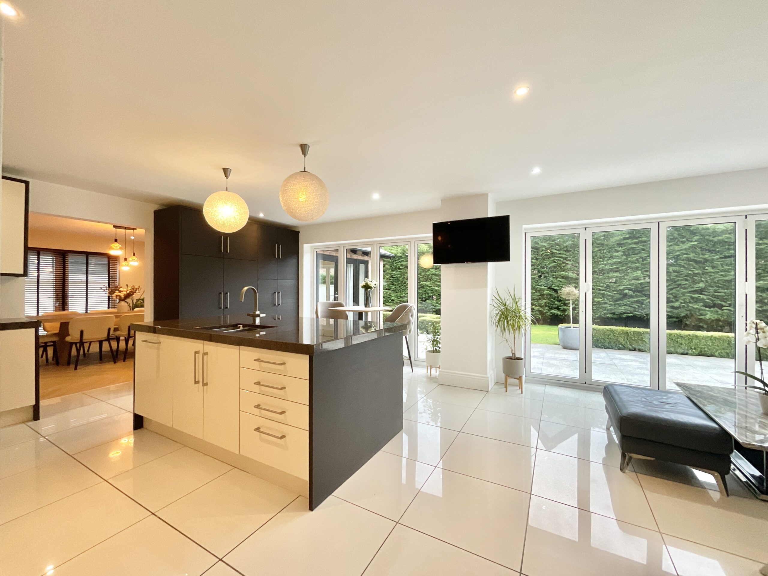 On the right, open plan to the hall is a lovely sitting room, ideal for teenagers to hang out or but may work well for you as a play room for little ones or a study, slightly separated from the hustle and bustle of the the heart of the home which is the expansive kitchen, dining and living area. To the left of the hallway opposite the sitting room, double doors open in to the luxurious lounge with a feature fireplace and large window allowing light to flood in, with another set of double doors that continue into the formal dining room. You’ll soon realise that this magnificent house has been designed for both every day family life and hosting large parties, whether that’s Christmas day with the whole family round or a big celebration. Holmecroft flows effortlessly from one room to the next with spaces for all the family to enjoy or tuck themselves away for some quiet contemplation. The formal dining room opens straight into the another sitting room, a peaceful place to sit and read a book, coffee in hand, overlooking the beautiful rear garden with French doors open right out to the patio area.
