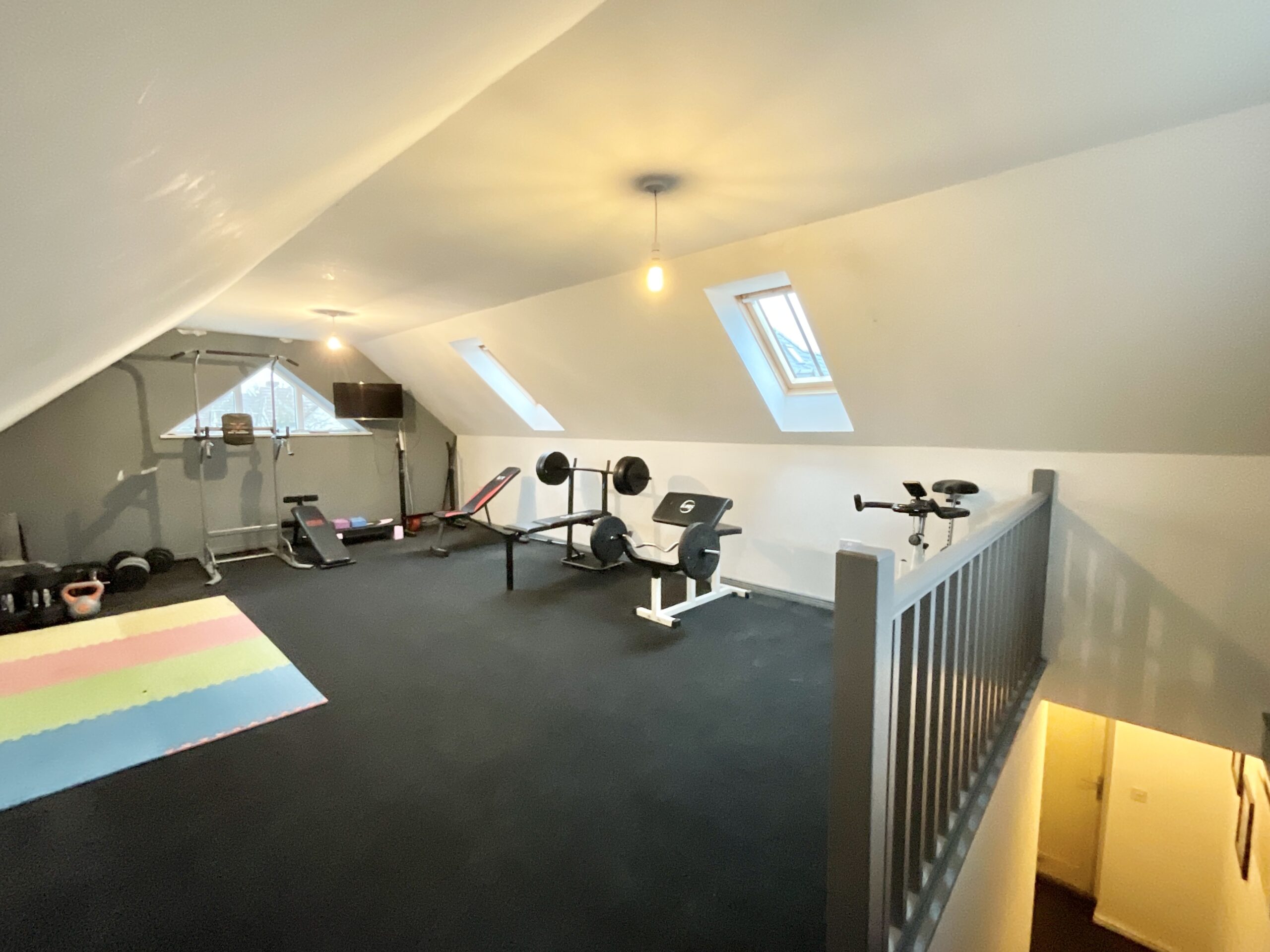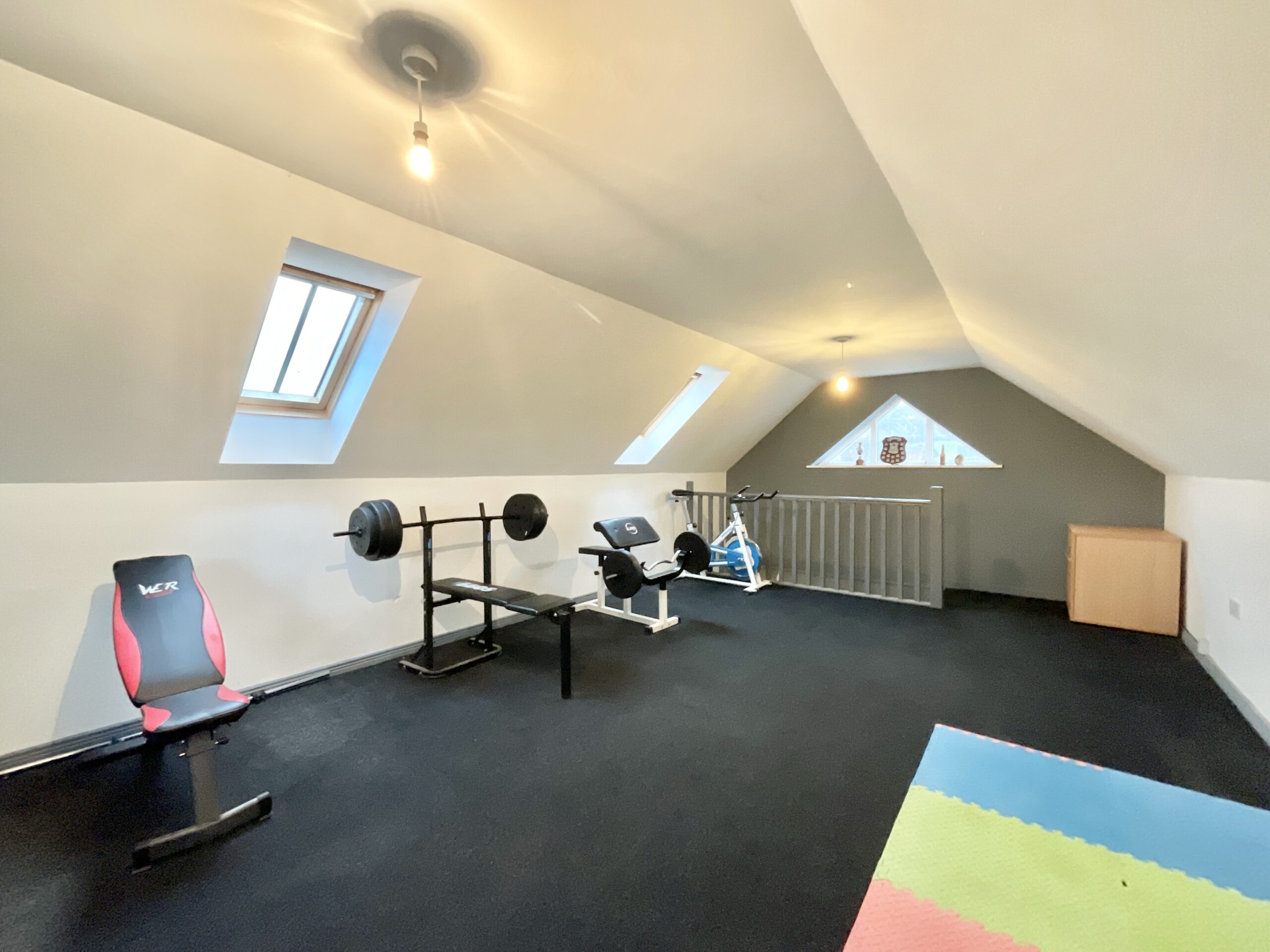 4. The huge double garage with electric up and over doors has a staircase leading to a first floor which is currently used for a gymnasium but would make the perfect play room or hobbies room.