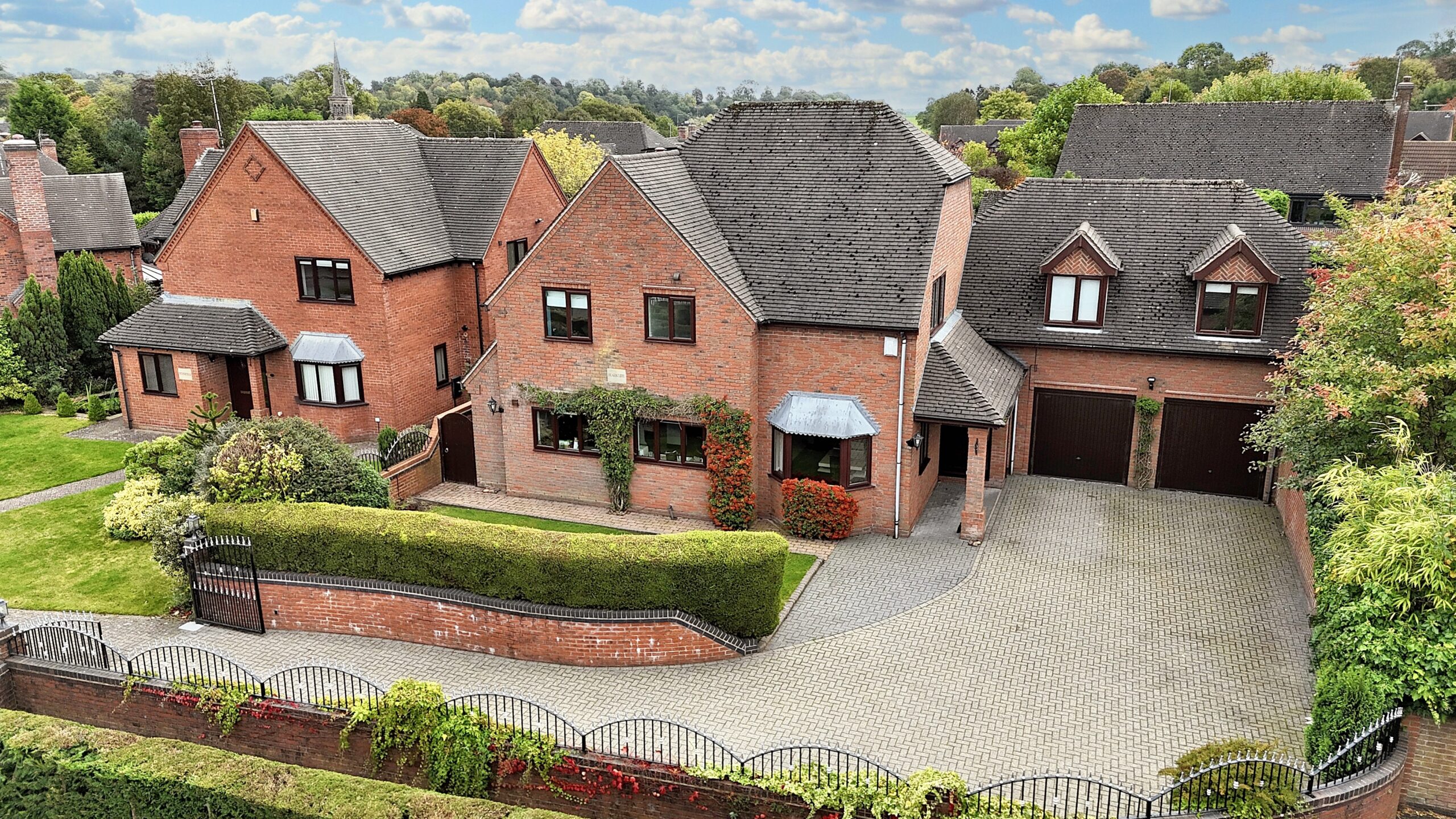 - Tucked privately behind electric gates, you'll find a generous driveway with off-road parking, a well-maintained lawn, and a double garage with its own W/C.