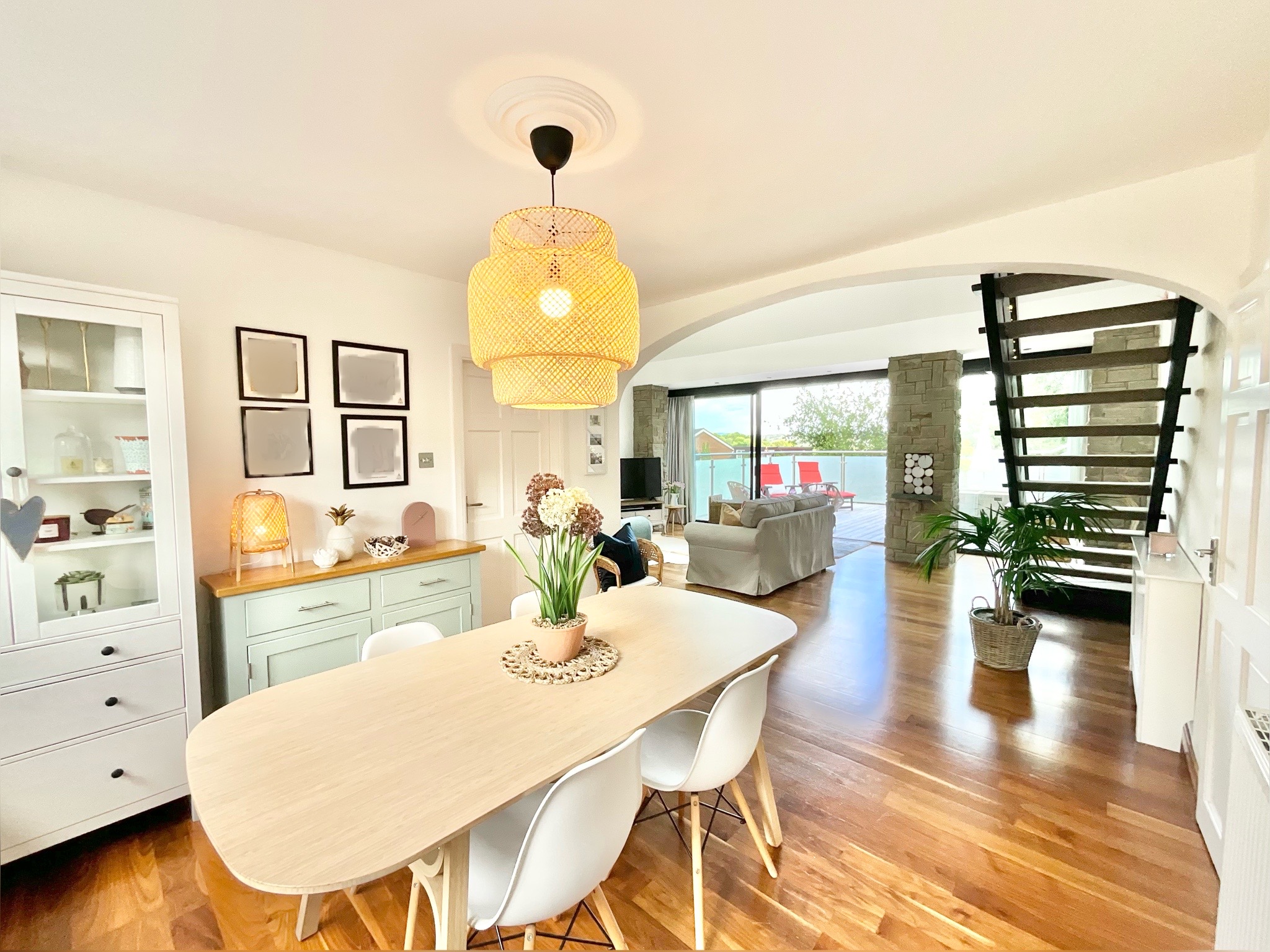 - Spacious open-plan living and dining area, striking double vaulted ceilings, exposed brick pillars, and full-width glazed sliding doors lead to the balustrade balcony. Perfect for entertaining guests.