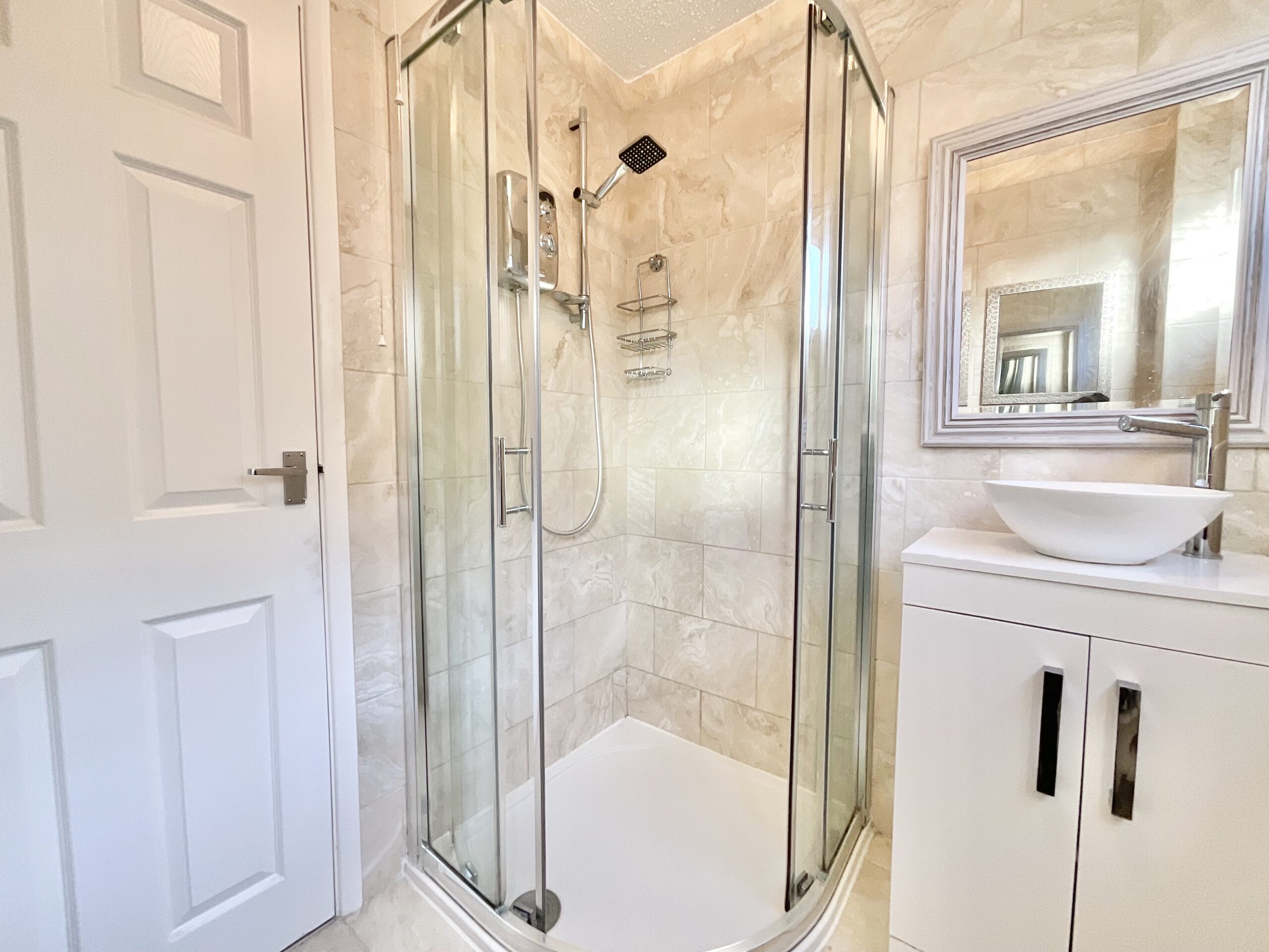 - Two spacious double bedrooms, plus a modern shower room with floor-to-ceiling tiles, a corner shower, sink, and W/C.