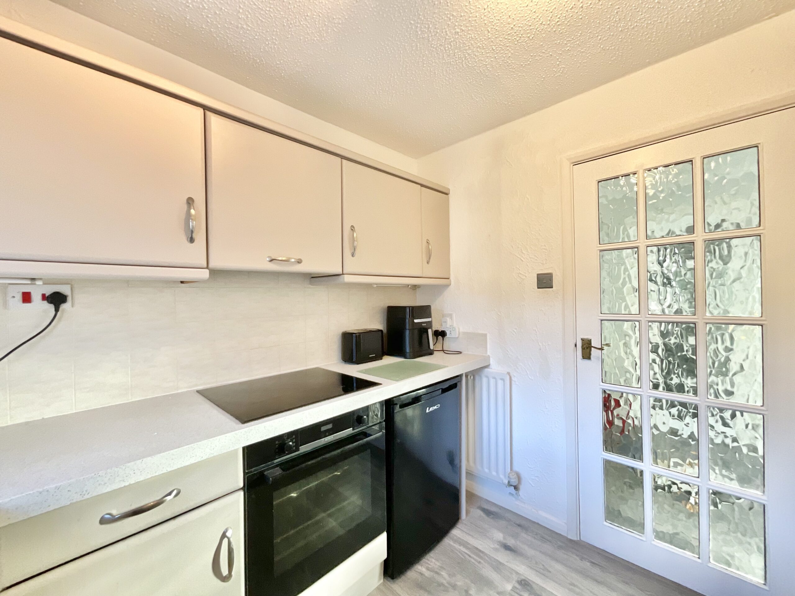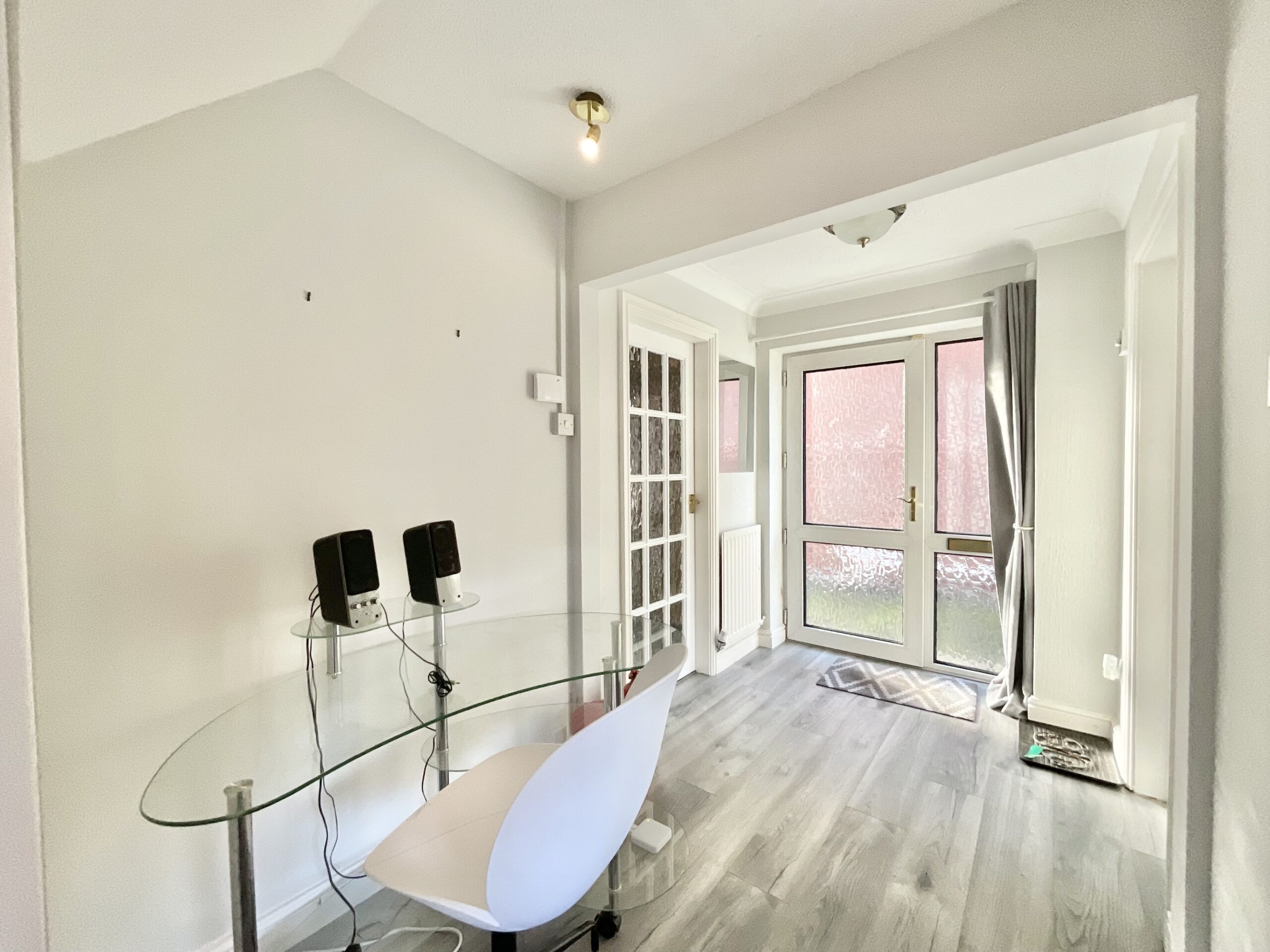 Internally, the entrance hall welcomes you in, with a seamless open flow into the dining area, offering glazed sliding doors to the rear garden. The home features a spacious living room with a bright bay window and fire surround. A practical U-shaped kitchen awaits with stylish beige overhead and base cabinetry, a ceramic hob, an integral oven, and plenty of room for additional appliances. This space offers the perfect opportunity to reconfigure into an open-plan kitchen/dining room (STNPP).