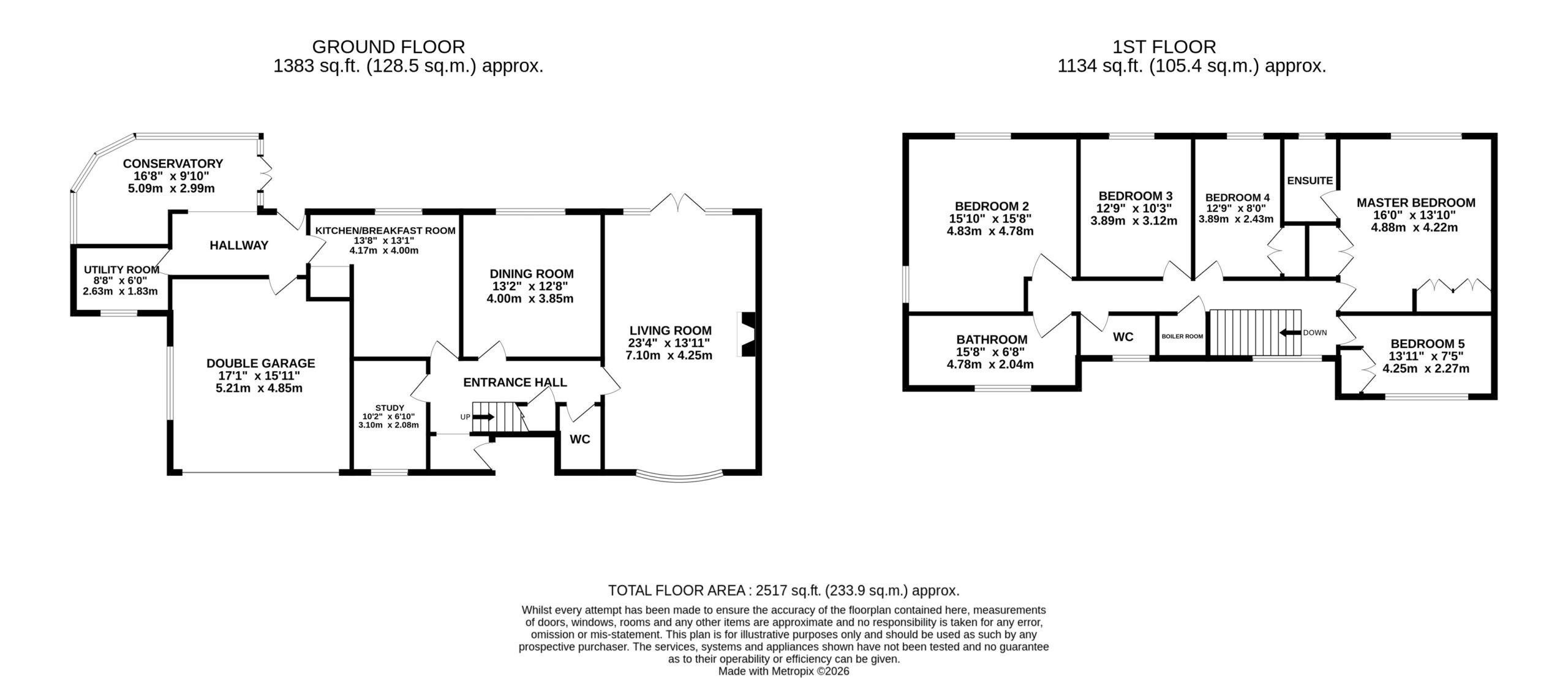 Upstairs, the master bedroom is a spacious double complete with built-in wardrobes and a private en-suite featuring a bath with overhead shower. Bedroom two is similar in size and benefits from dual-aspect windows, creating a wonderfully light and airy atmosphere. Bedrooms three and four are both comfortable doubles, with bedroom three enjoying the advantage of built-in wardrobes. Bedroom five is a single room, ideal for guests, a nursery or hobbies.