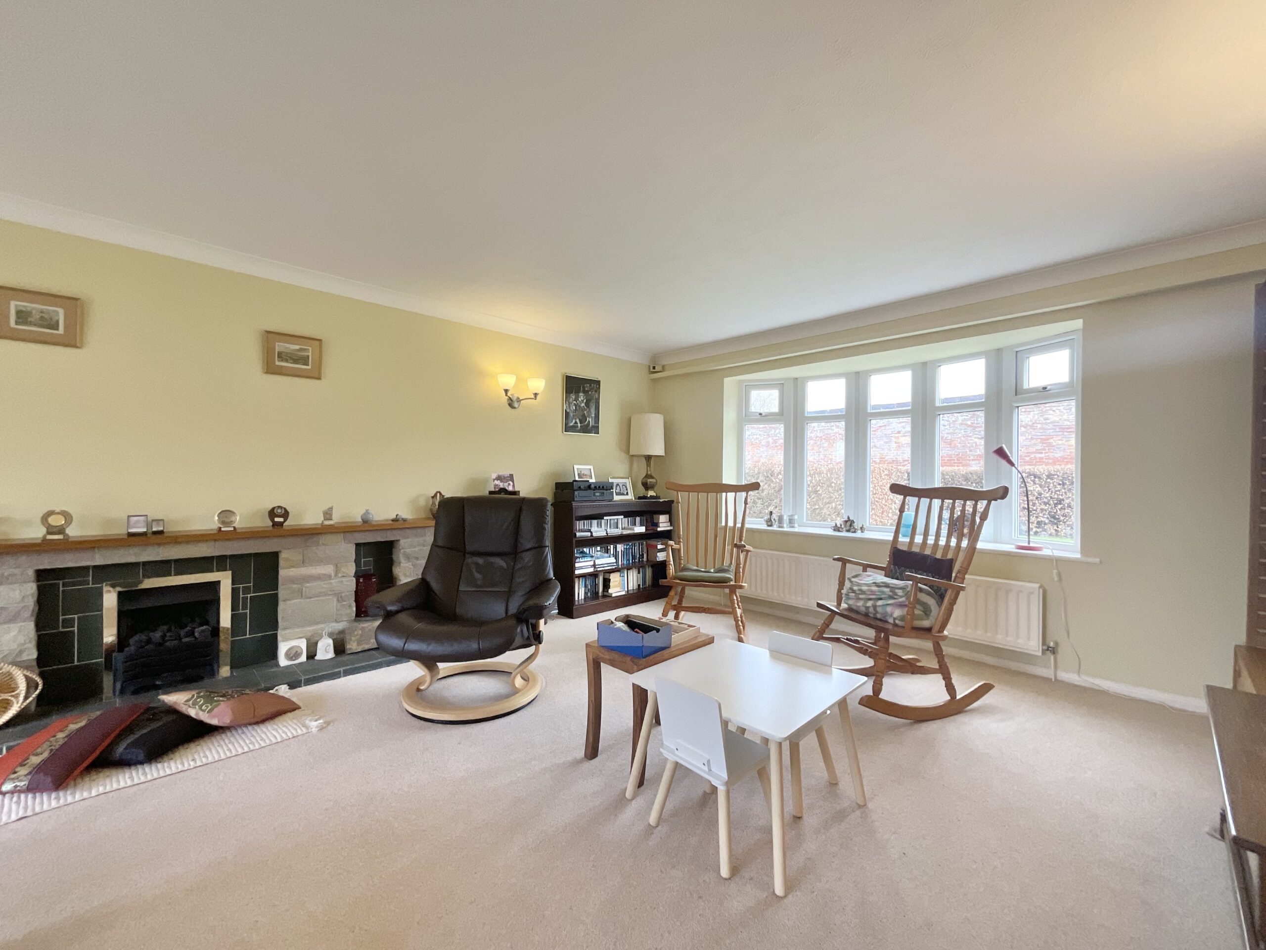 The living room is a standout feature of the home, stretching the full depth of the property. Dual-aspect windows flood the room with light, including a large bay window to the front and French doors opening onto the south-west facing garden. This layout creates a seamless connection between indoor and outdoor spaces, perfect for entertaining or relaxing with family. A feature fireplace adds warmth and character, giving the room a cosy yet spacious feel.