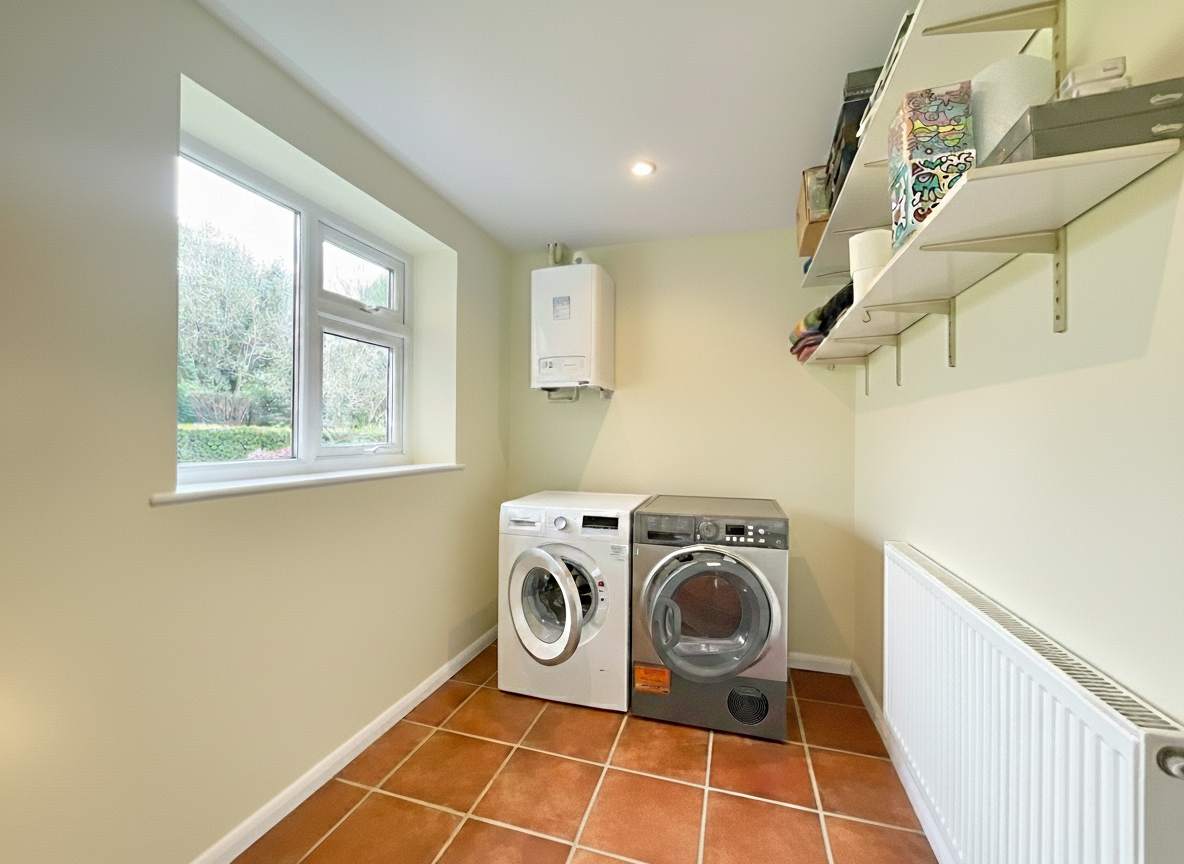 The utility room provides space for a washing machine and dryer and houses the boiler for the gas central heating system. The conservatory, accessed off the same hallway, is a bright and relaxing space with French doors opening out to the garden — perfect for unwinding while enjoying views of the outdoor space. Internal access to the double garage adds further convenience and secure storage.
