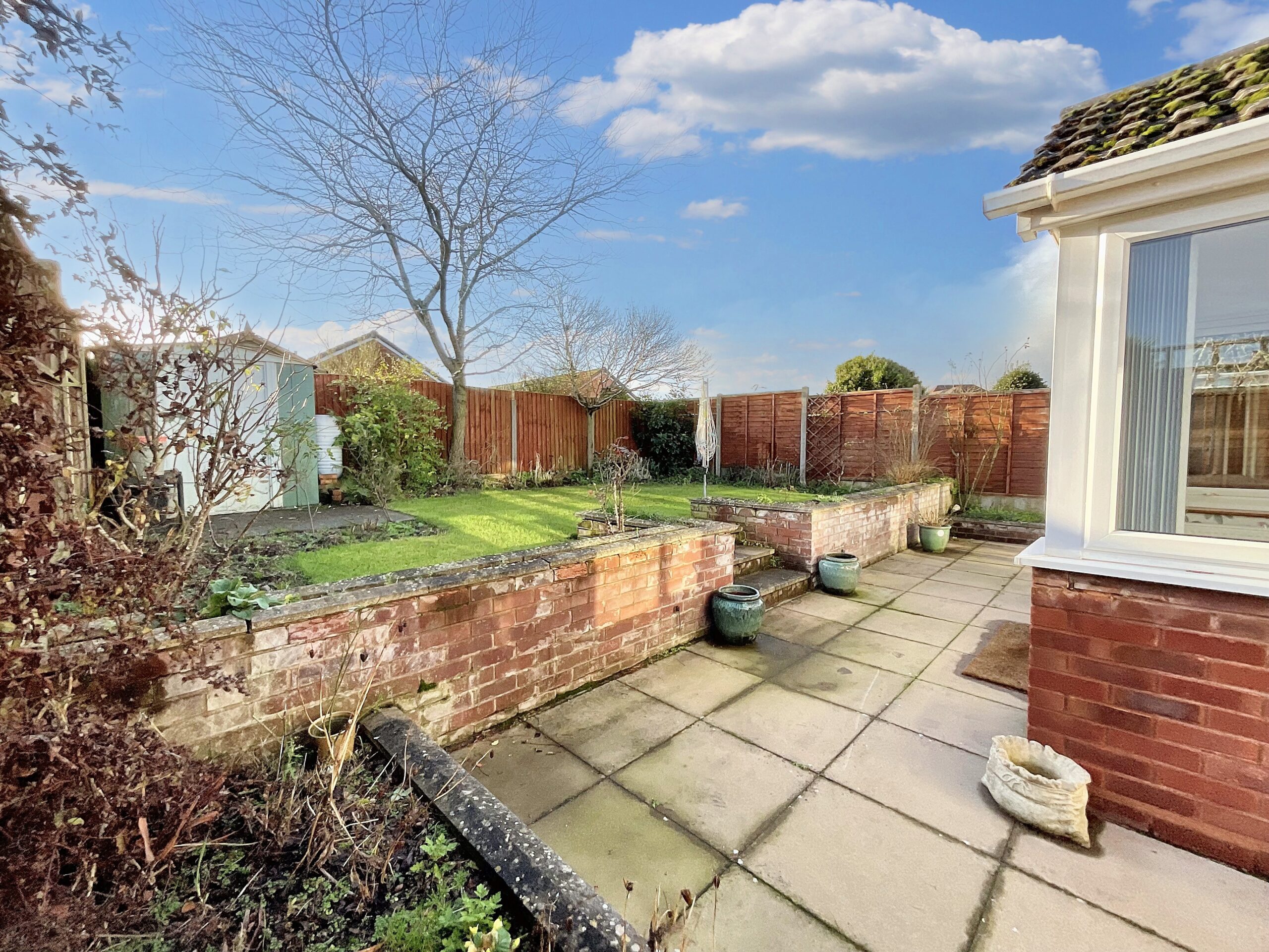 - South-West facing garden with lawn and patio, block-paved driveway framed by mature shrubbery, and a peaceful setting close to shops, eateries, bus routes and healthcare services.