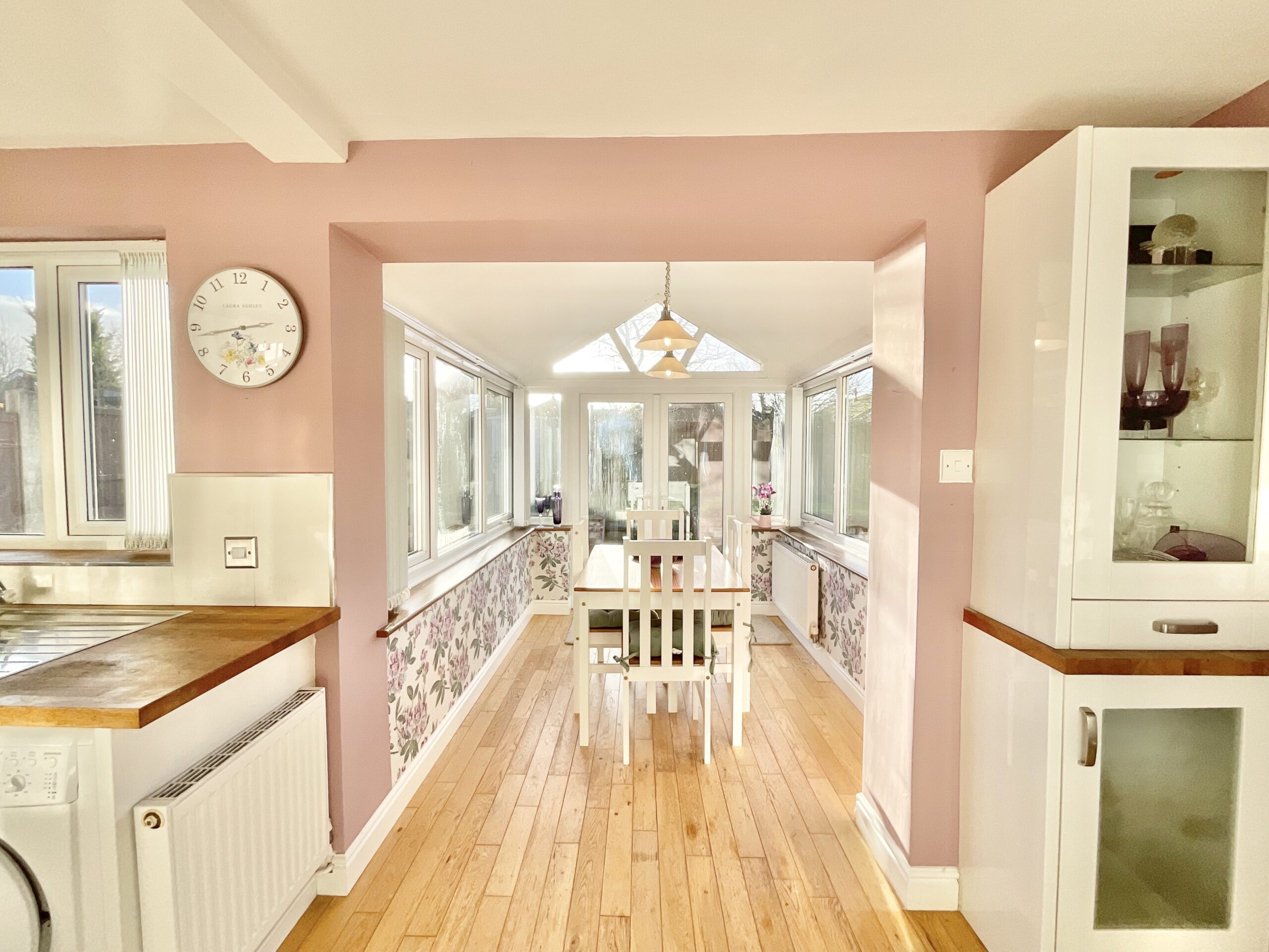 - Modern kitchen with sleek white cabinetry, oak worktops, ceramic hob, electric oven, stainless steel one-and-a-half bowl sink with drainer, and space for more, flowing into a sun-soaked orangery.