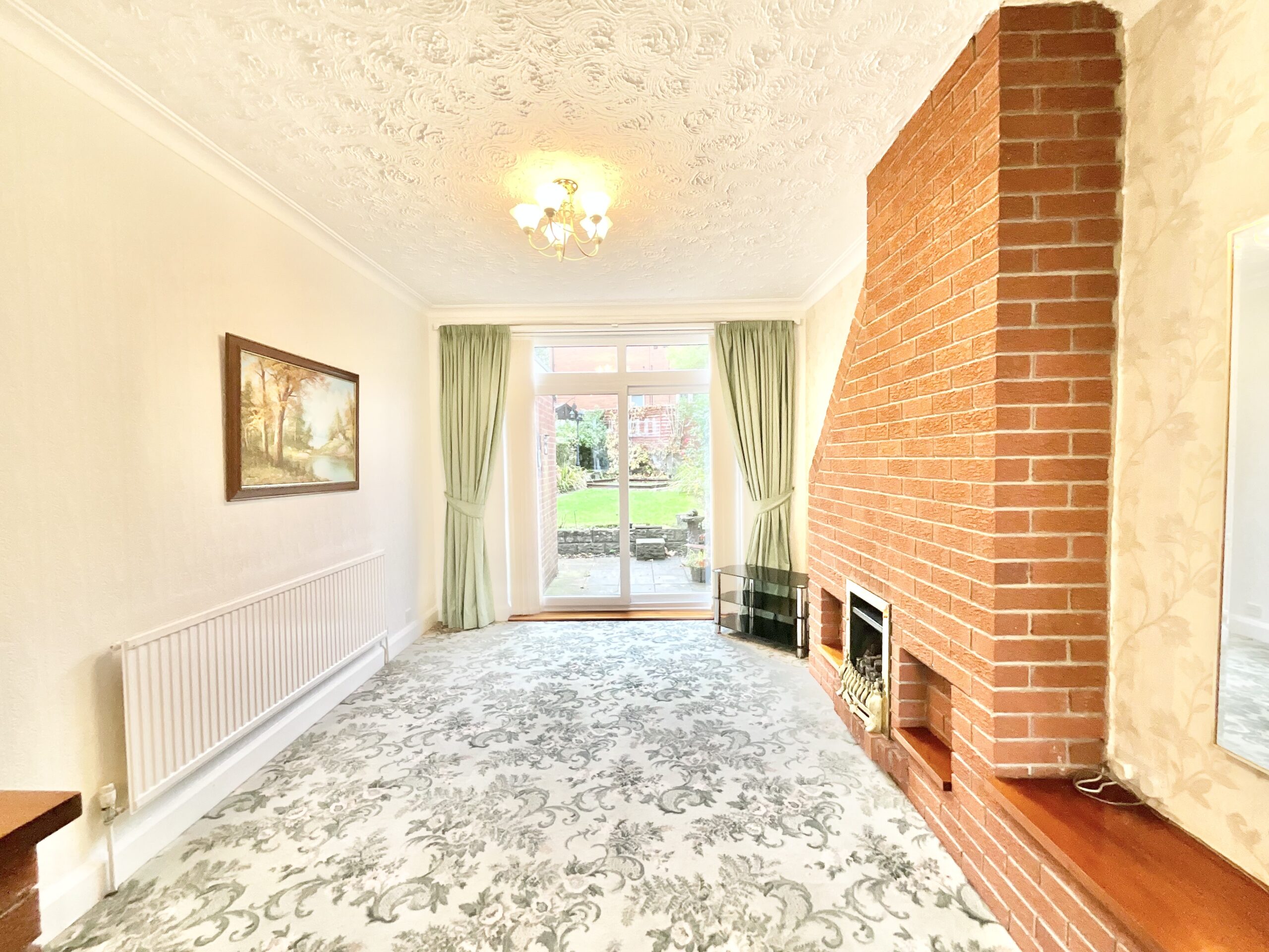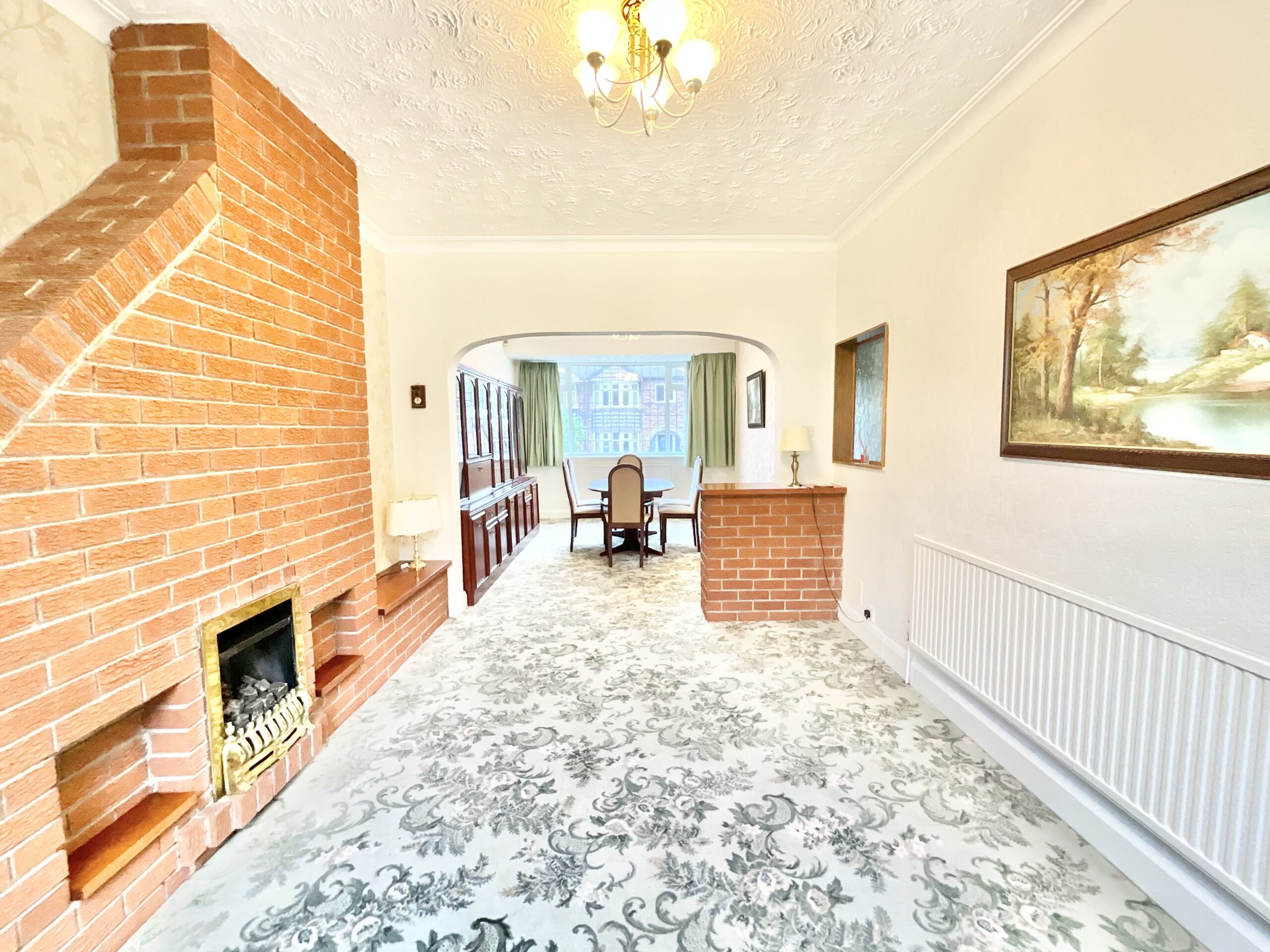 - An open plan living room diner. Spacious and bright with a character brick fireplace surround for a cosy touch. With room for a large dining table and sliding doors leading to the garden beyond.
