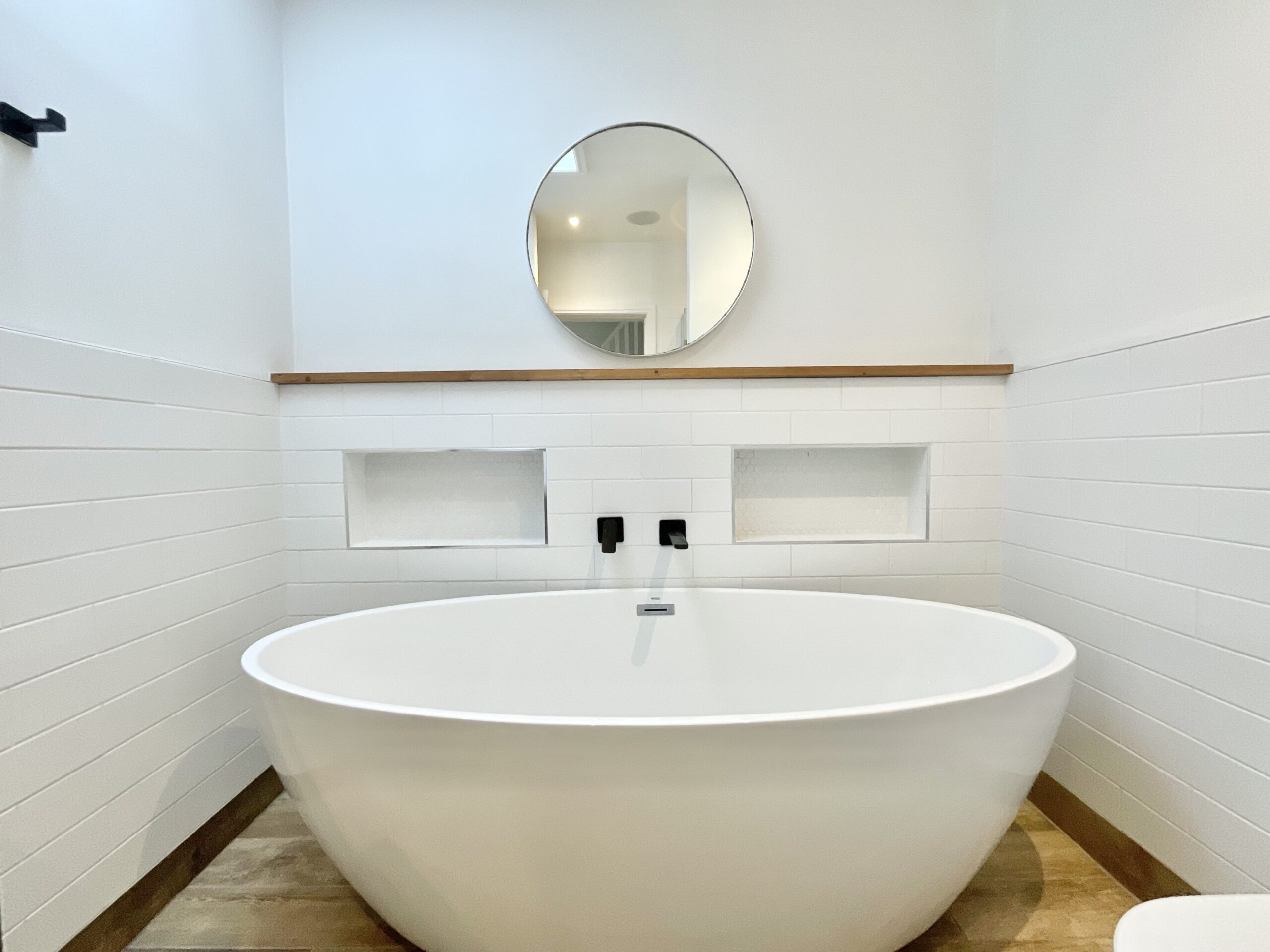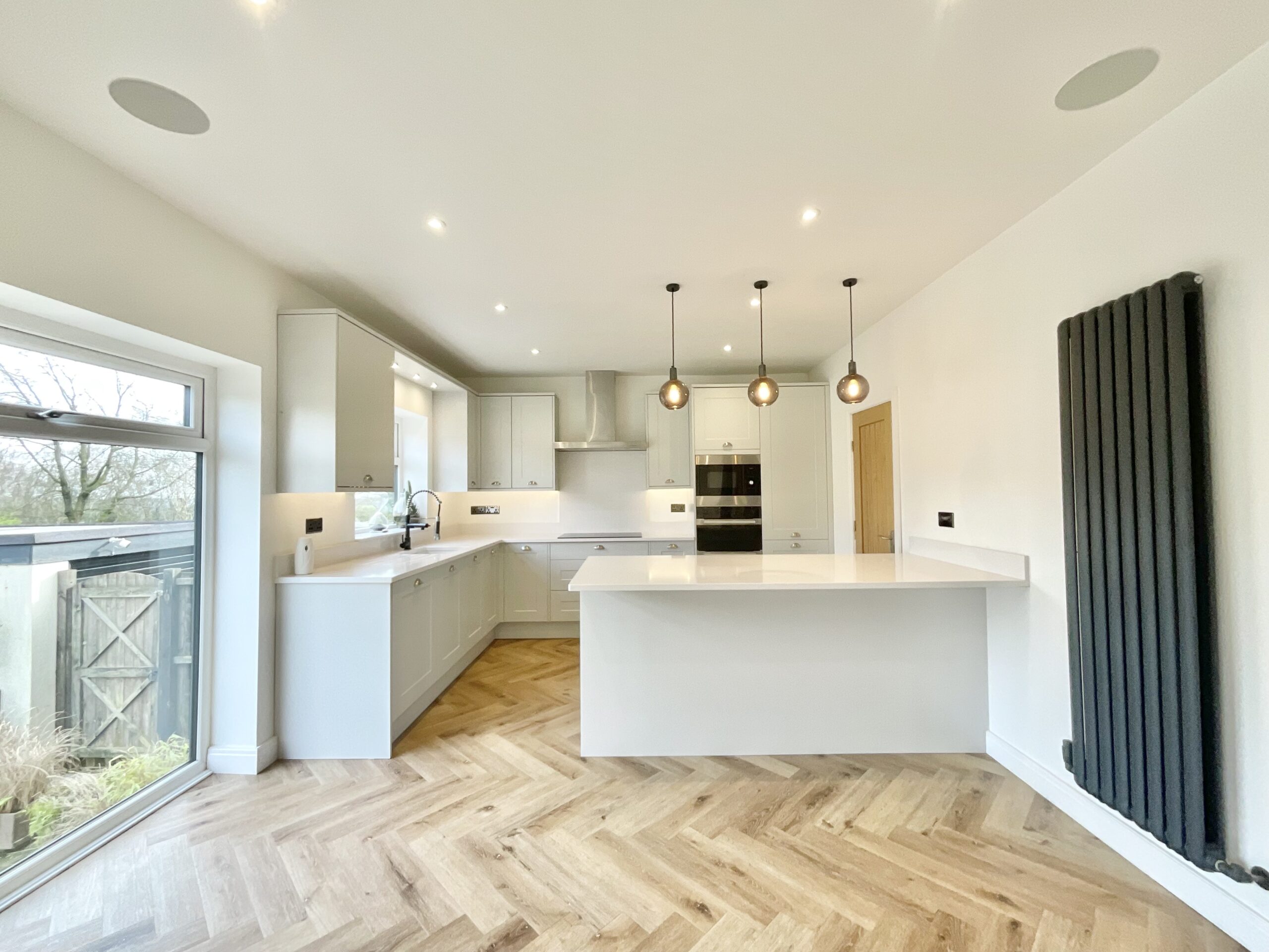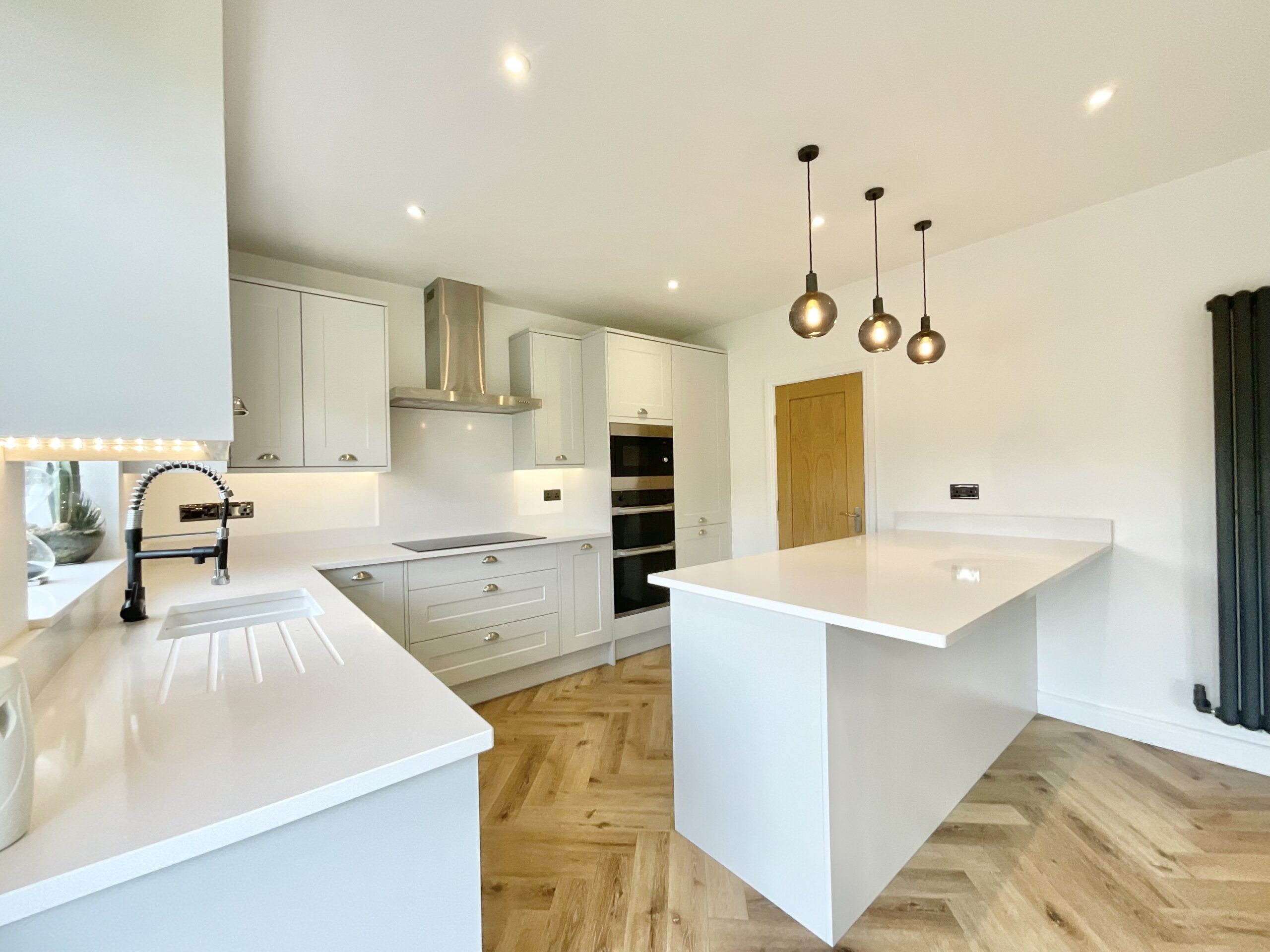 1. Bright, open-plan kitchen/living/dining space with herringbone flooring, a neutral shaker-style L-shaped kitchen, integrated appliances, breakfast bar, utility, and living space with media wall.