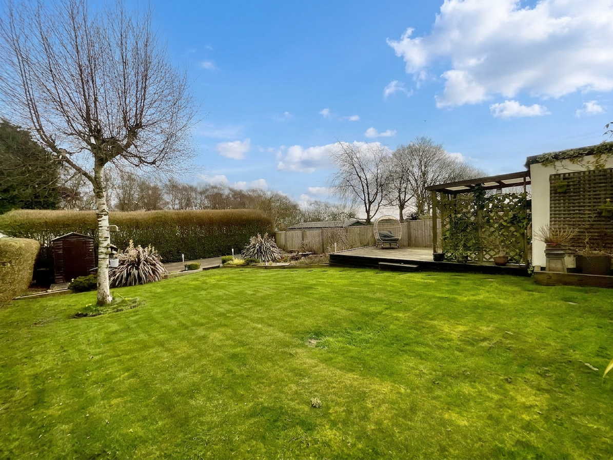 An expansive tiered rear garden awaits with raised decked seating areas, further patio seating space, an archway leading to a stunning grass lawn with mature borders and two further decked seating areas. This is the ideal spot for everyone to enjoy, no matter the occasion. To the front, a further well-maintained grass lawn awaits, along with a generously sized driveway with off-road parking for several vehicles, leading to a single garage.