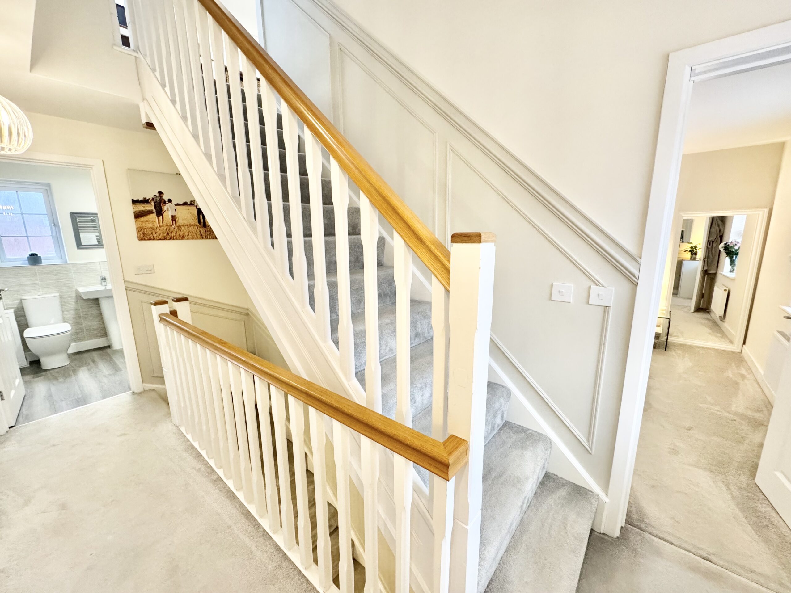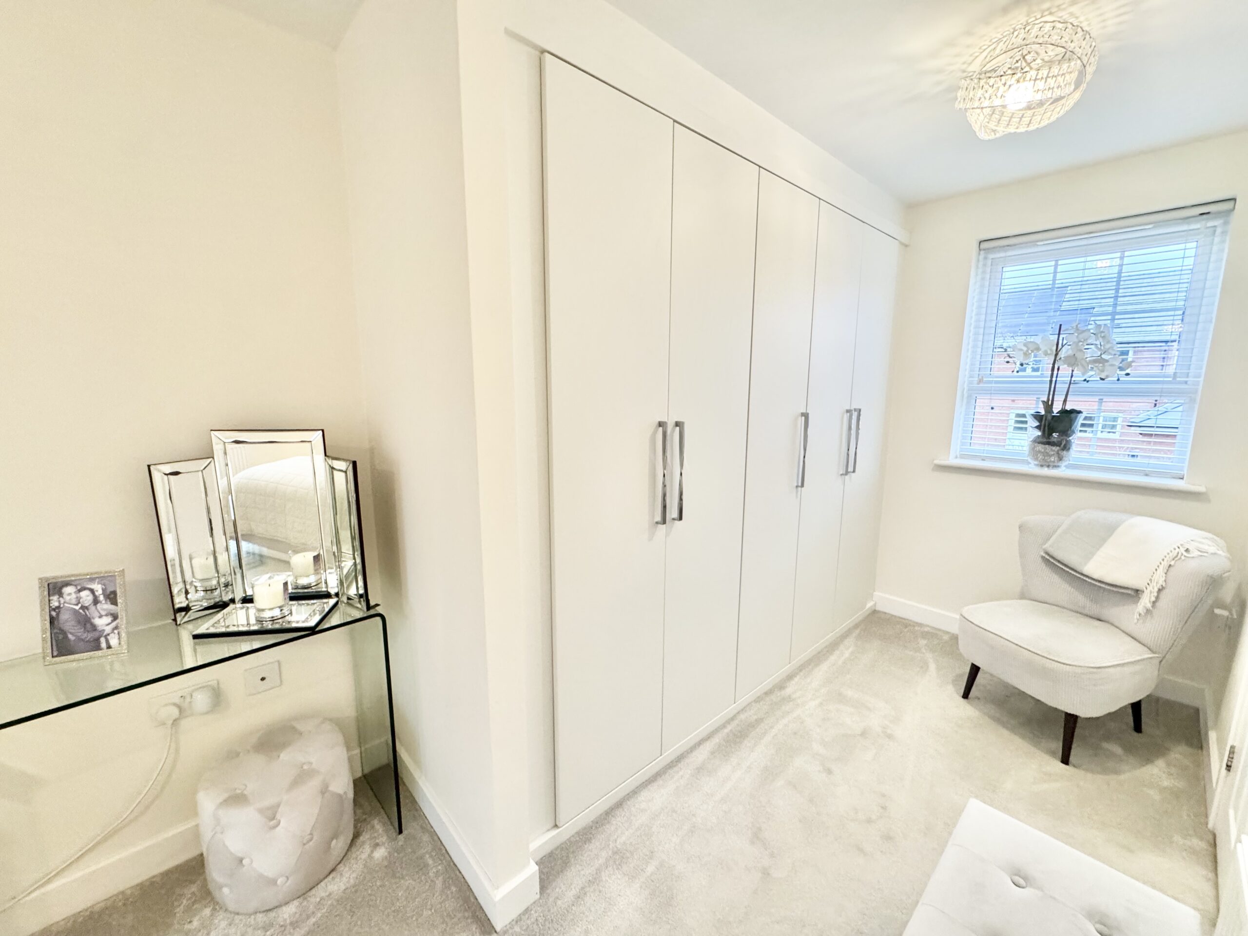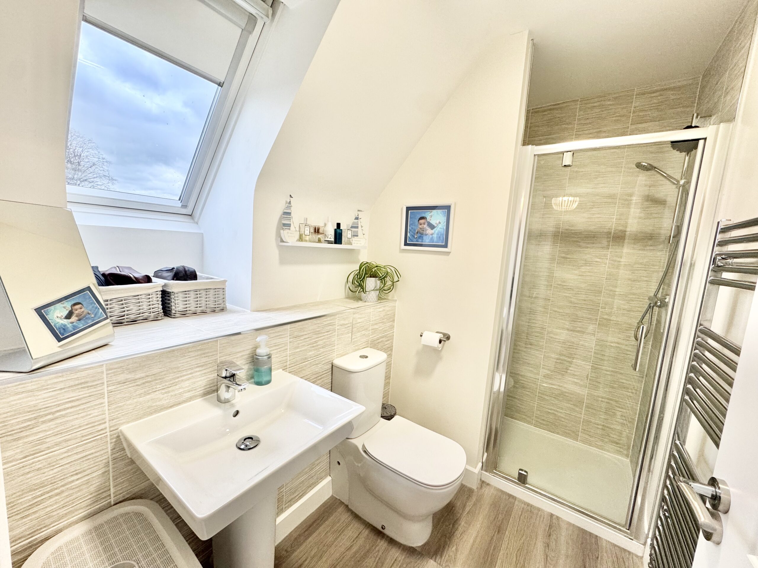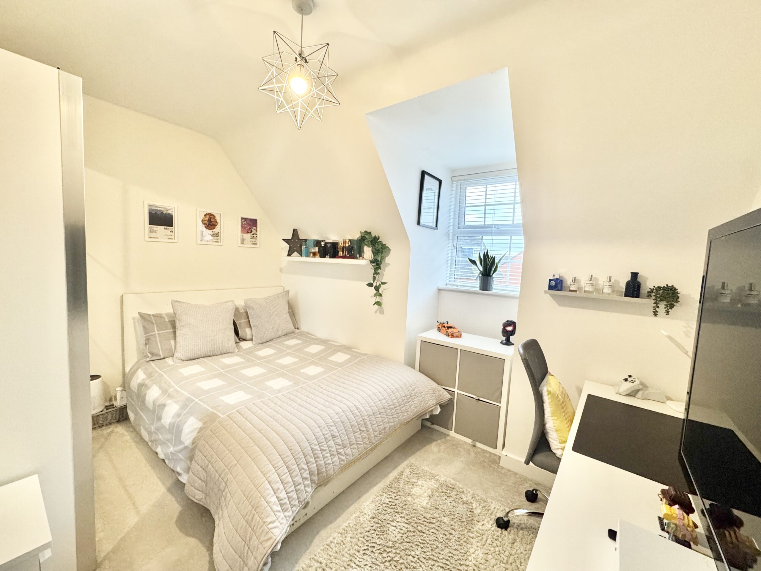 The second floor offers even more flexibility, with two generous additional bedrooms, including a particularly spacious second bedroom with dual aspect views, alongside a modern shower room. A central landing area provides the perfect nook for a home office or study space, ideal for today’s flexible lifestyles.
