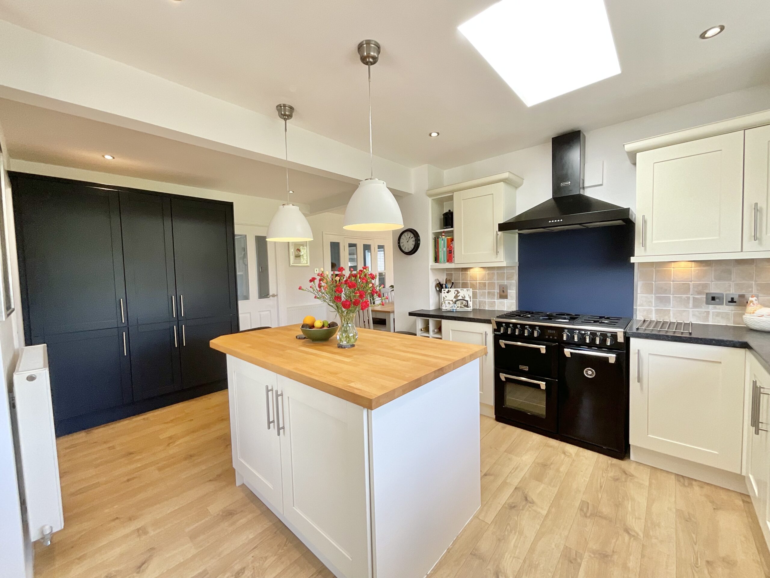 - Contemporary open-plan kitchen/diner with shaker-style units, central island, breakfast bar, and integrated appliances.