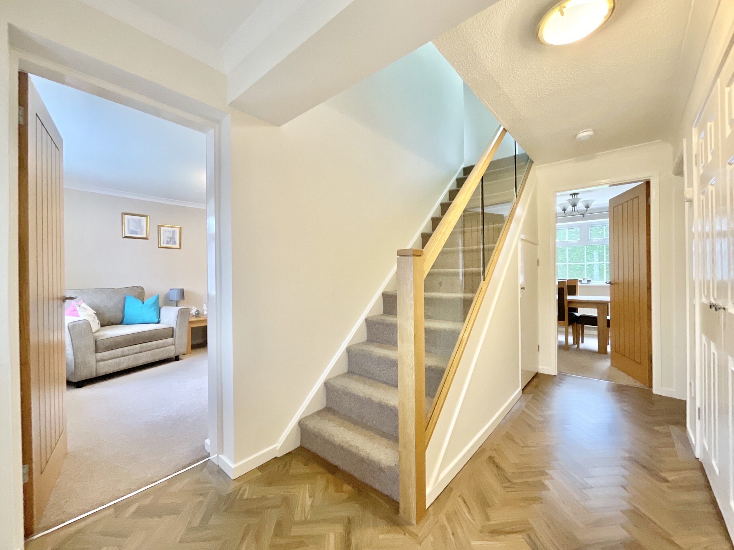 The four bedrooms that sit to the first floor are bright and welcoming, with three of them providing a view over the rear garden. The main bedroom provides ample storage space with fitted wardrobes and a “secret” door leading to the well appointed ensuite bathroom with floor to ceiling tiles, a bath with shower over, heated towel rail, W.C and sink. Next door is a recently modernised shower room with sleek grey tiles, a sliding glass door to a walk in shower, heated towel rail, sink and W.C, ready and waiting for you to relax after a long day. Another large double bedroom sits to the opposite side of the landing also benefitting from fitted wardrobes and to complete the first floor are two more bedrooms, one currently dedicated as a home office with built-in shelving and a large window provides the perfect environment for remote work or study.