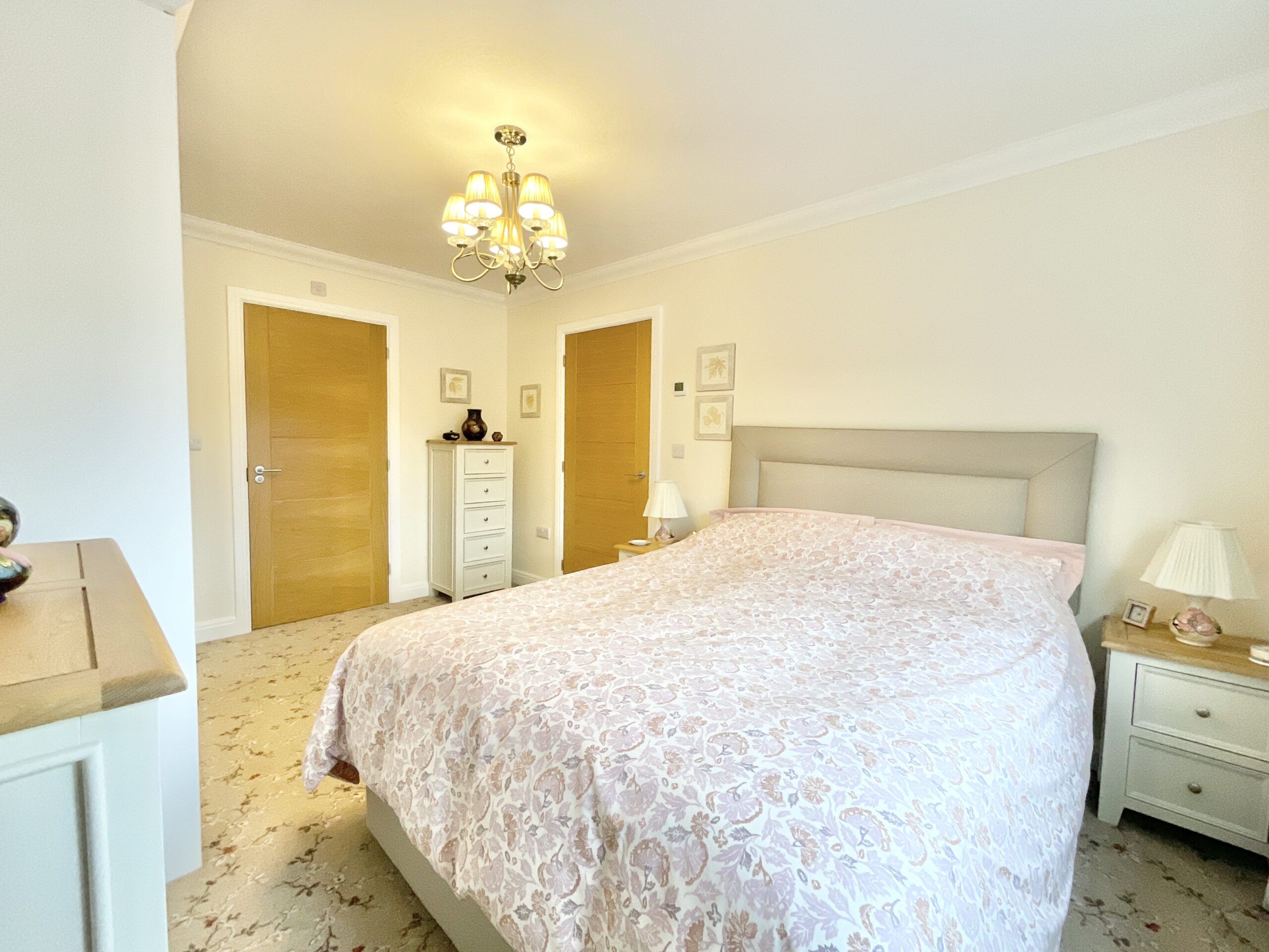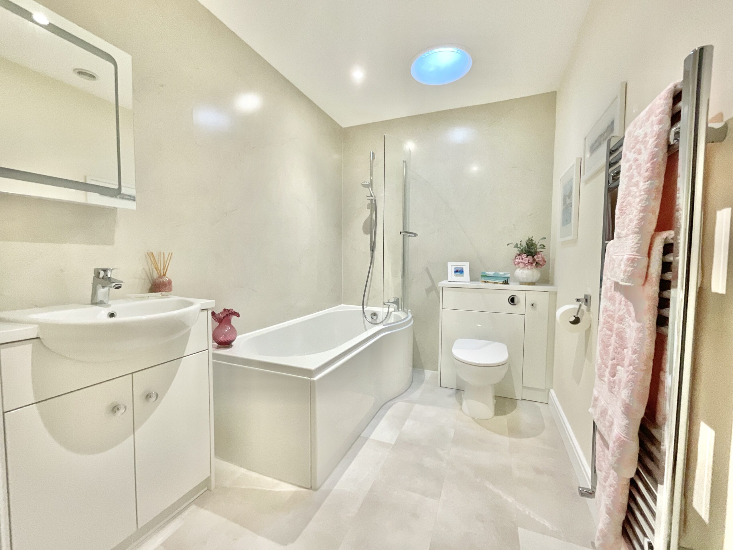 When it’s time to retreat, two spacious double bedrooms offer calm and comfort in equal measure. The master bedroom is a true haven, complete with built-in wardrobes, plush Ulster carpeting and space for a king-size bed. Its stylish ensuite adds a touch of luxury, with a walk-in shower, quartz vanity unit, WC and a sleek towel radiator. Bedroom two is equally inviting, overlooking the front of the property and featuring its own built-in wardrobes, perfect for guests, family or a peaceful home office. The family bathroom mirrors the home’s elegant style, offering a full bath with overhead shower, quartz finishes and modern fittings.