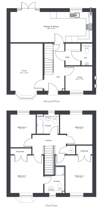 The Canterbury is a four-bedroom detached home benefitting from separate rooms on the ground floor creating plenty of space for the family to enjoy independently or together. The ground floor is divided into a lounge with front front-facing bay window, a dining room accessed from the kitchen with French doors opening out into the rear garden and a study from the main hallway. The kitchen is fitted with a range of base and wall units and also benefits from having a separate utility room to provide further storage and space for the washing machine away from the kitchen. The ground floor is finished with a guest WC. Upstairs four double bedrooms occupy each corner of the house giving everyone plenty of privacy with wardrobes to bedrooms one and two and both an ensuite shower room to the master bedroom and a family bathroom accessed from the landing.