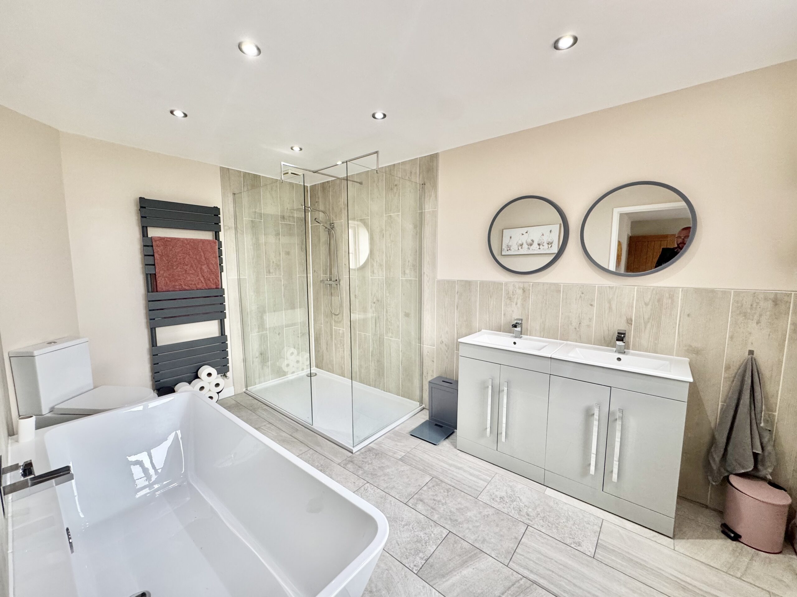 Bedroom two also overlooks the front elevation and benefits from its own ensuite, fitted with a three-piece suite including a wash basin, WC and double shower with rainfall showerhead, along with a double glazed privacy window.