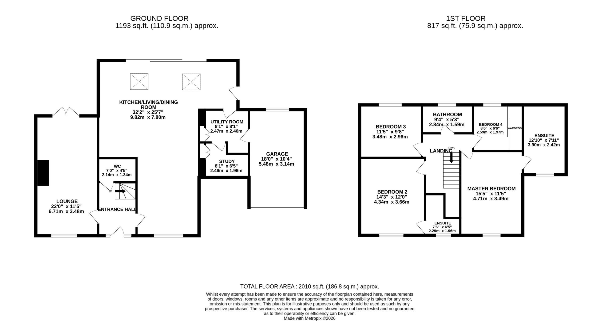 The utility room offers additional practicality with base units, a Belfast sink with mixer tap, space for both a washer and dryer, and a useful storage cupboard with double doors. A further door leads through to the study.
