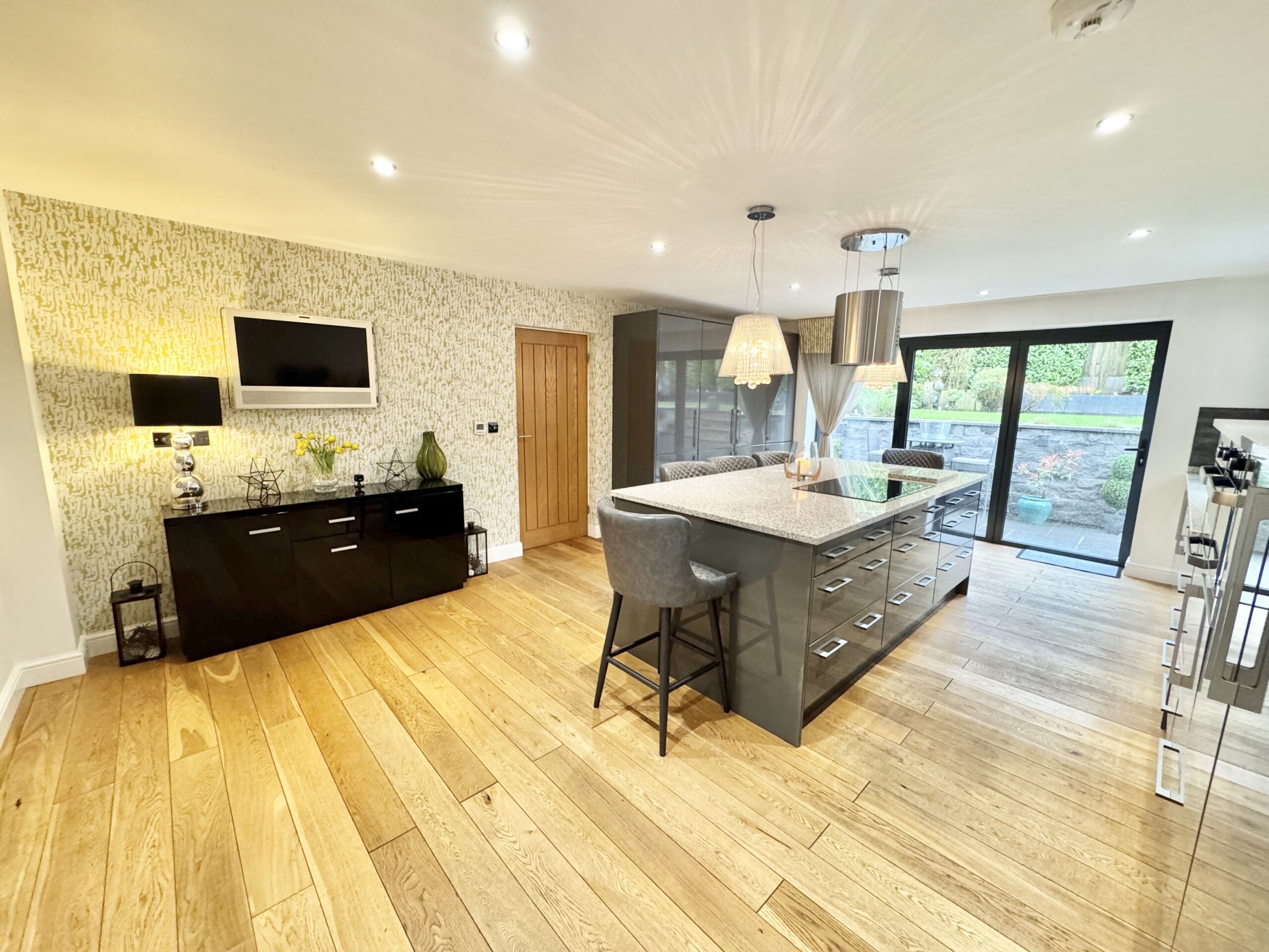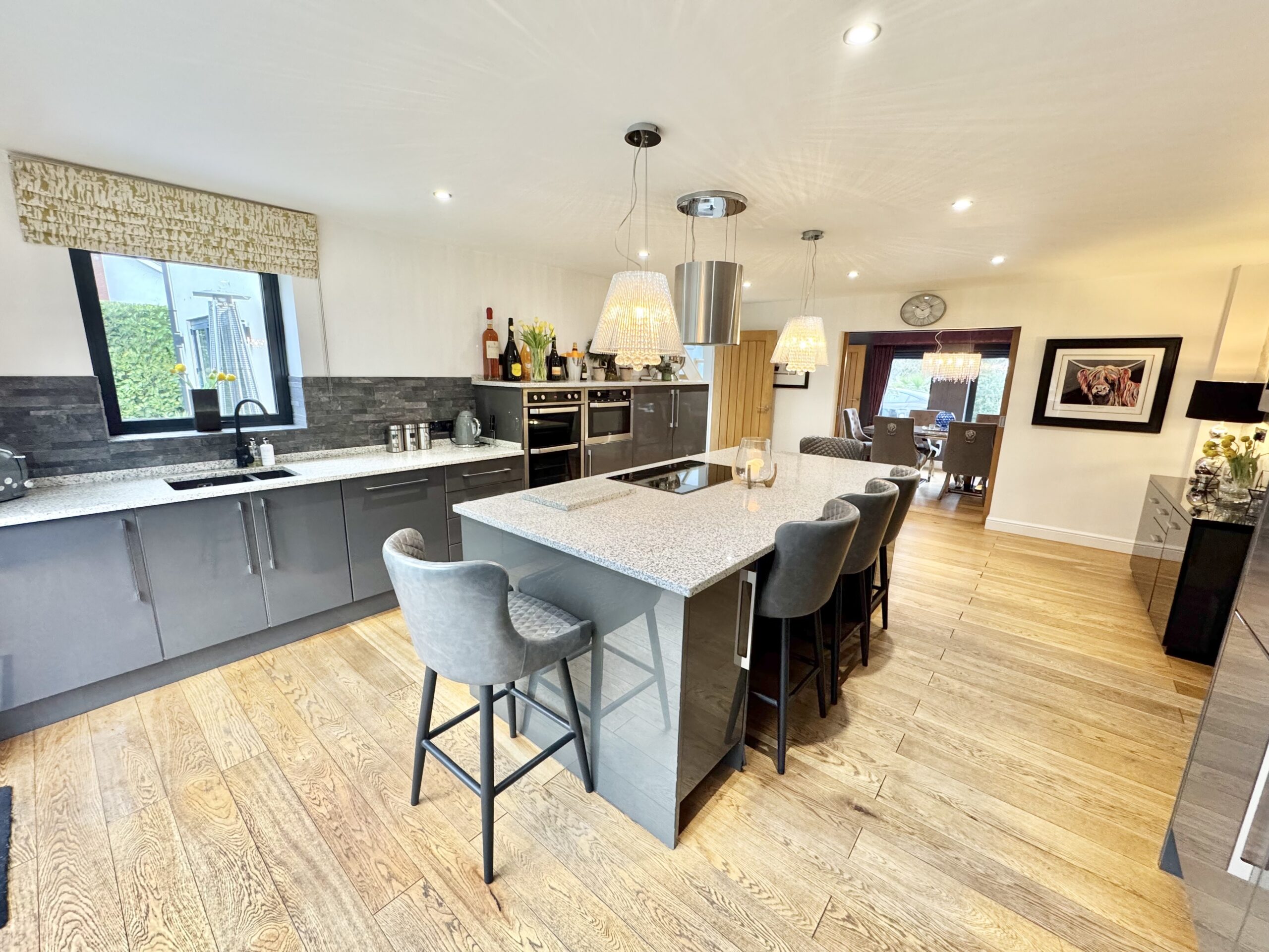 Stepping inside this remarkable home, you are greeted by a grand entrance hallway that leads to all principle ground floor rooms and a plethora of inviting spaces, along with a stunning contemporary staircase that winds up to a galleried landing overlooking the glass gable window on to the pretty front garden landscape.First on the left from the hallway is a dining room which can also be accessed via the kitchen. On the right you’ll discover a very impressive lounge accessed through a set of double doors which immediately showcase the modern fireplace with bi-folding doors on the left which allow you to spill out on to the patio when socialising with friends and family. Next door to the lounge is a study which would also make a great play room for the kids or hobbies room, and the final door takes you through to the magnificent kitchen/dining/living space. Central to the kitchen area is a large island with grey cabinets beneath the luxurious granite worktop with a handy breakfast bar area for family to sit and chat with you whilst cooking up a culinary delight. Along with many more ground and eye level cabinets there are integrated appliances for your convenience together with another set of bi-folding doors leading out to the expansive patio area which is perfect for alfresco dining. As we mentioned earlier the lovely, opulent dining room is located just off from the kitchen through a sliding door meaning this room can be sectioned off day to day if you so wish or opened up when you’re hosting lavish dinner parties or sitting down for a cosy meal with family, the entire house and it’s rooms are versatile enough to please the most fastidious of buyers out there.
