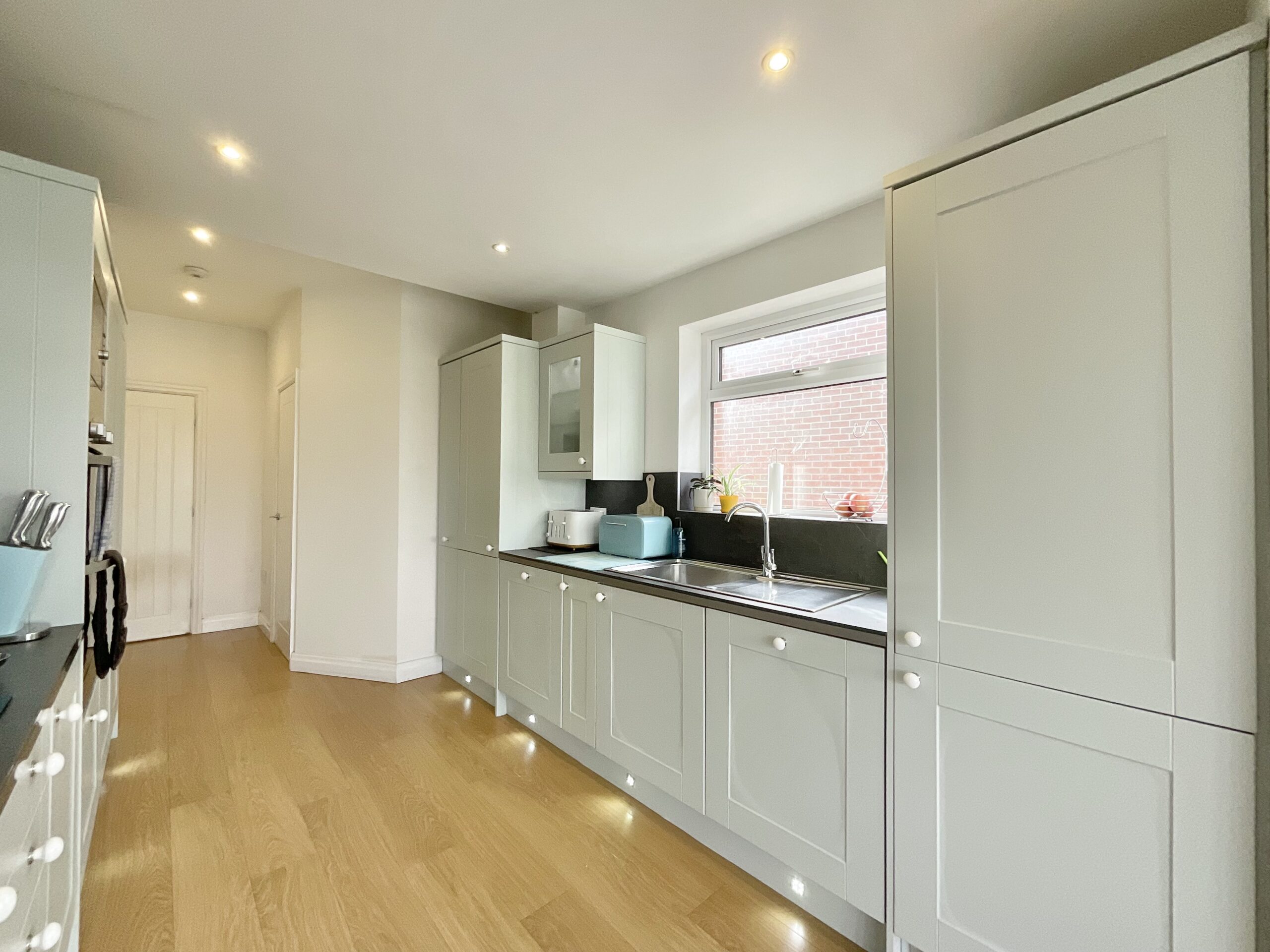 The kitchen is thoughtfully designed with an abundance of storage cabinets and generous counter space, and is also accessed directly from the hallway for added convenience. Integrated appliances include a double oven, microwave, induction hob, fridge, freezer, and dishwasher, providing both practicality and a sleek, modern finish. A downstairs WC also offers space for a washing machine and dryer, further enhancing the home’s functionality.