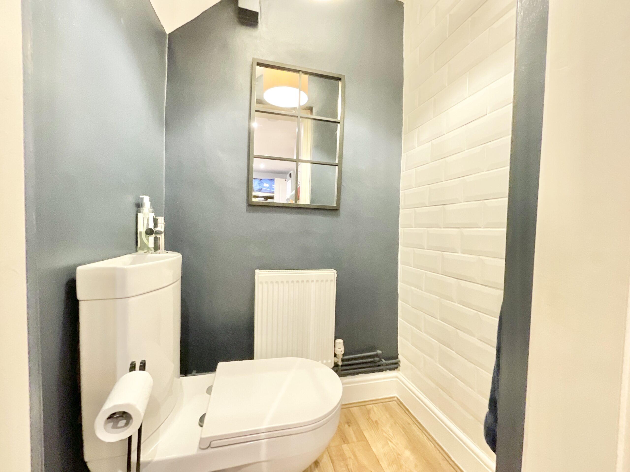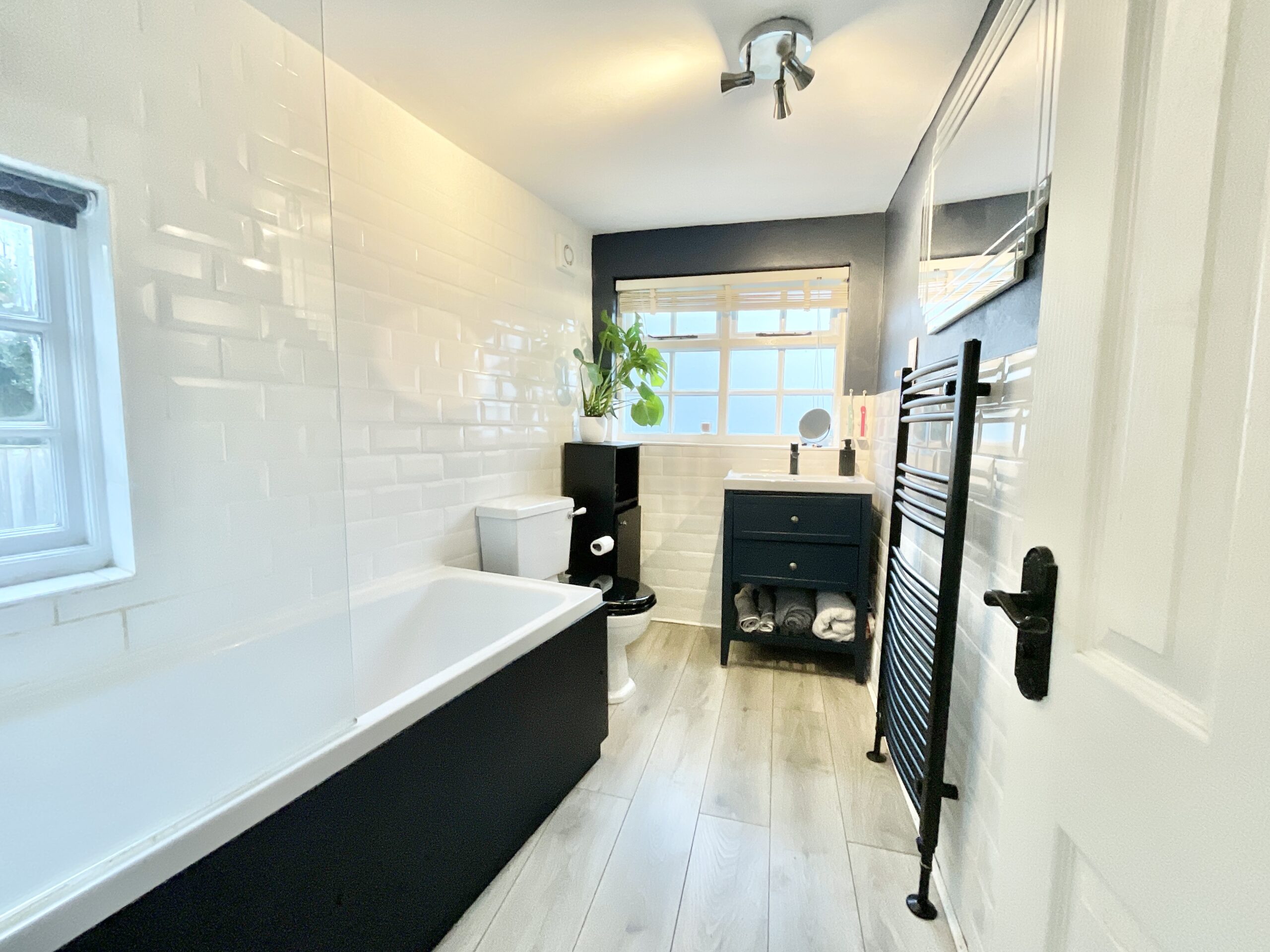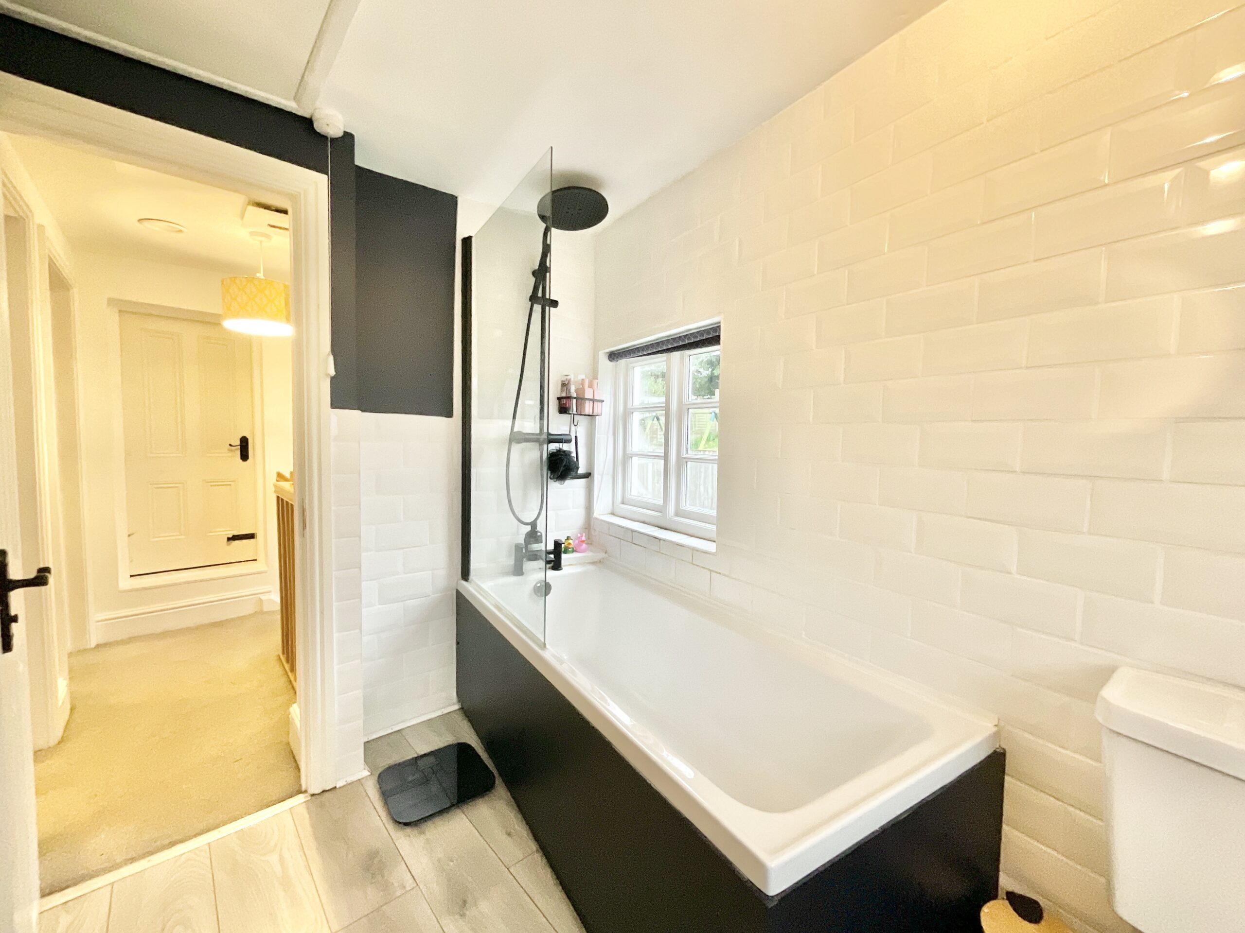 Upstairs, both bedrooms are bright, inviting sanctuaries, spaces where sweet dreams happily ever after. The modern bathroom features a bathtub with shower overhead, elegant tiling and a heated towel rail, all resting on wood-effect flooring. And for a little extra magic, a door on the landing opens onto a roof garden/balcony, a serene perch perfect for morning coffee, evening stars or hosting intimate gatherings under open skies.
