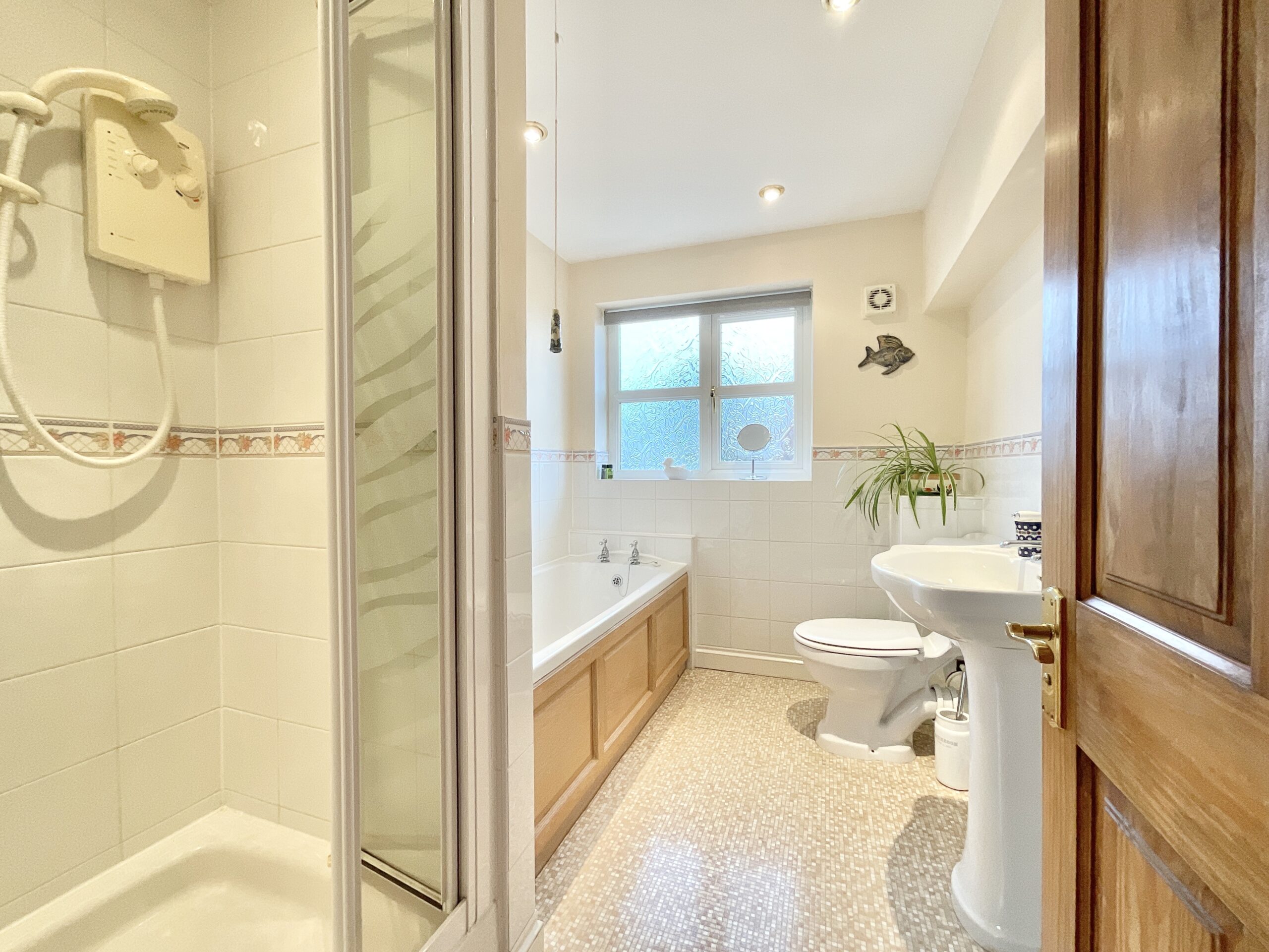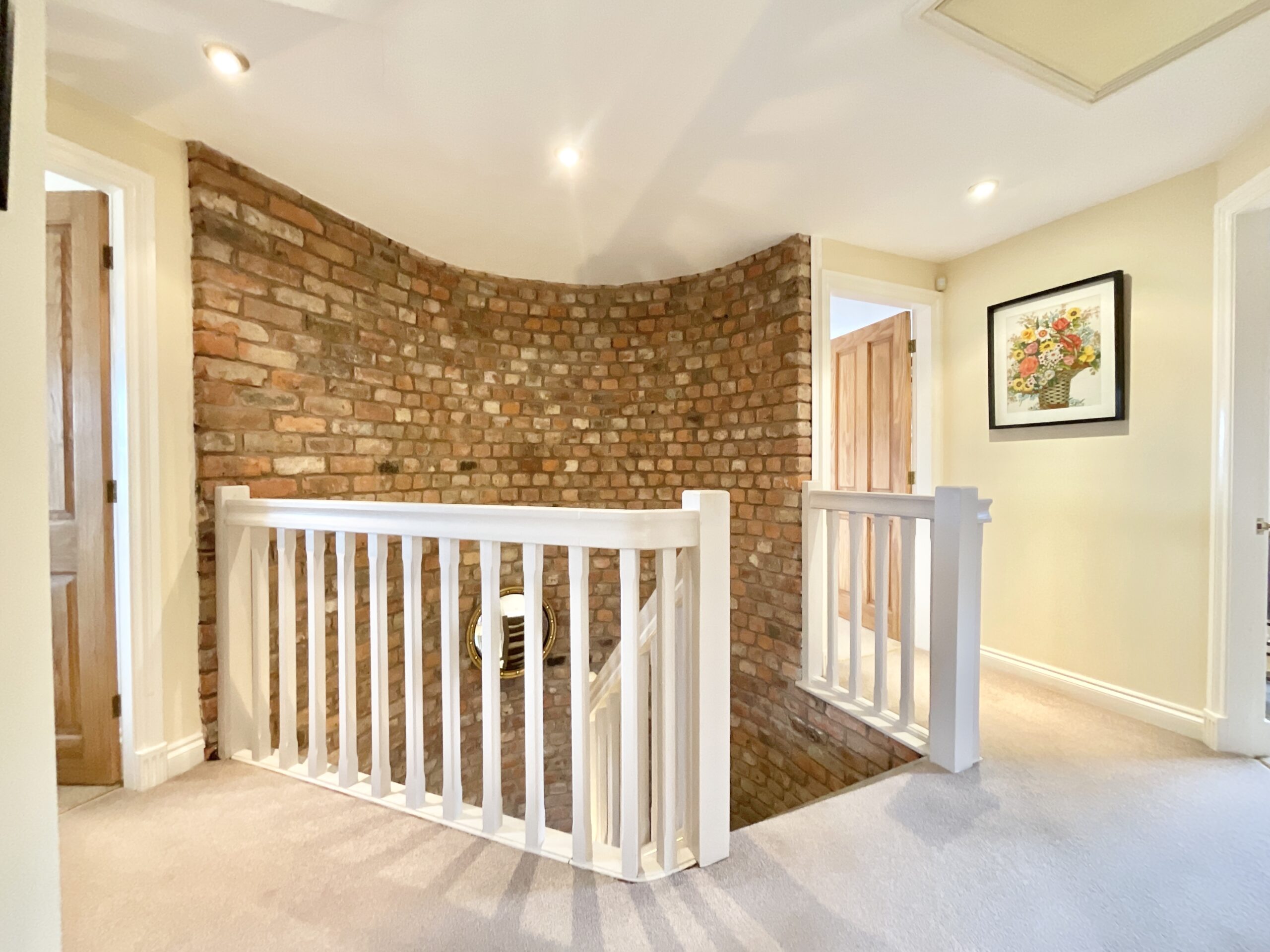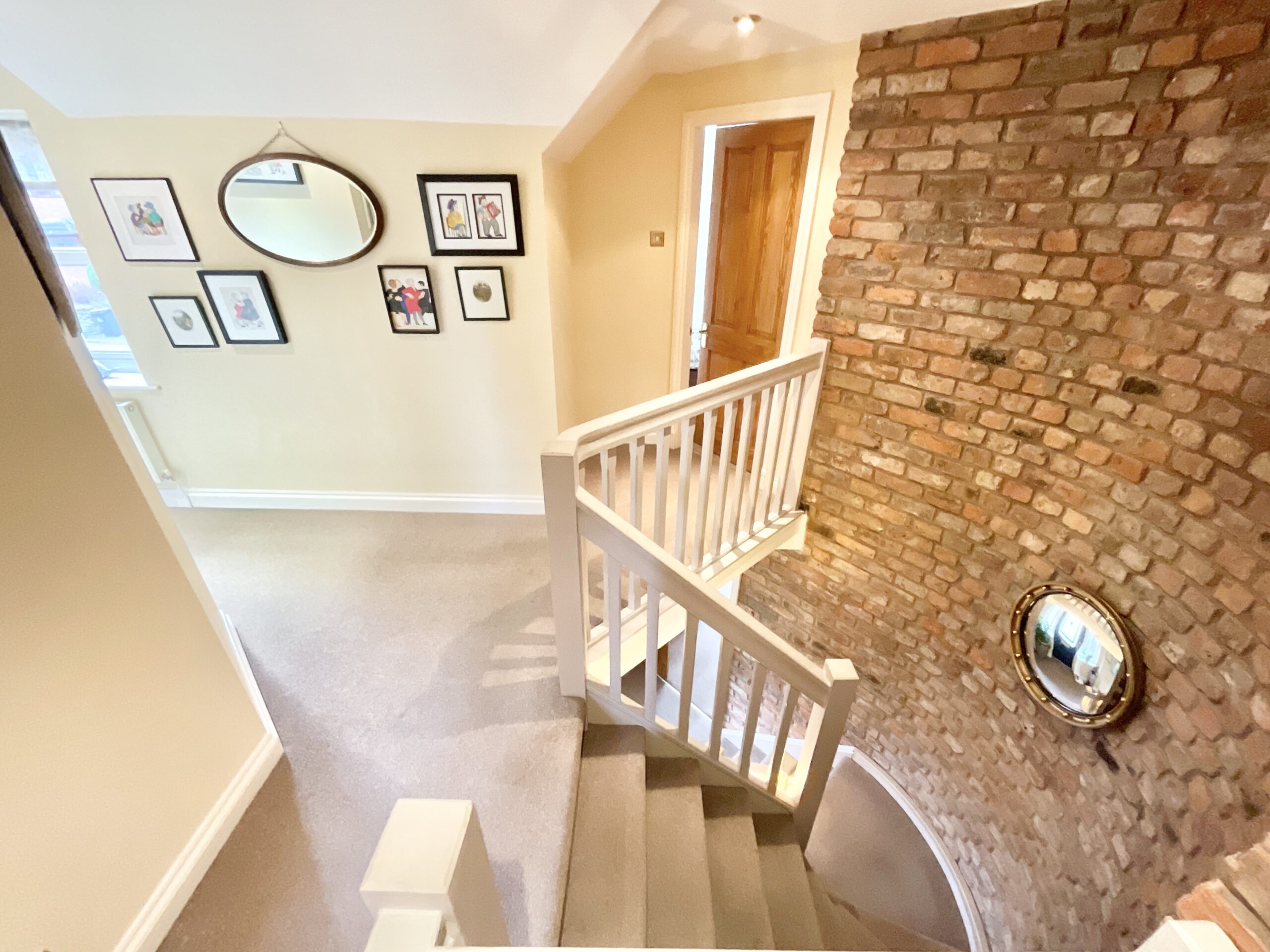 Back through the hall and up the winding staircase lined with a featured exposed brick wall to the first floor landing. To the left you’ll find bedroom three, a spacious double with a view to the rear garden. Next door is bedroom four, an L-shaped room perfect for both a bedroom or a home office complimented with a fitted wardrobe. Across the landing is the main bedroom, a lovely “hotel suite” style bedroom with fitted wardrobes, complimented by a modern ensuite shower room. Head down the landing where you’ll discover the family bathroom comprising a separate shower enclosure, bath, W.C and pedestal sink. The final double bedroom is adjacent which is of a very impressive size also.