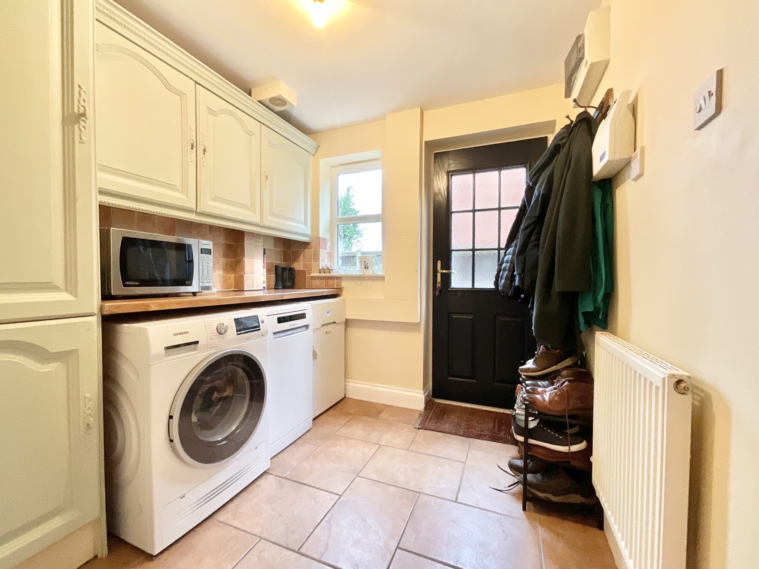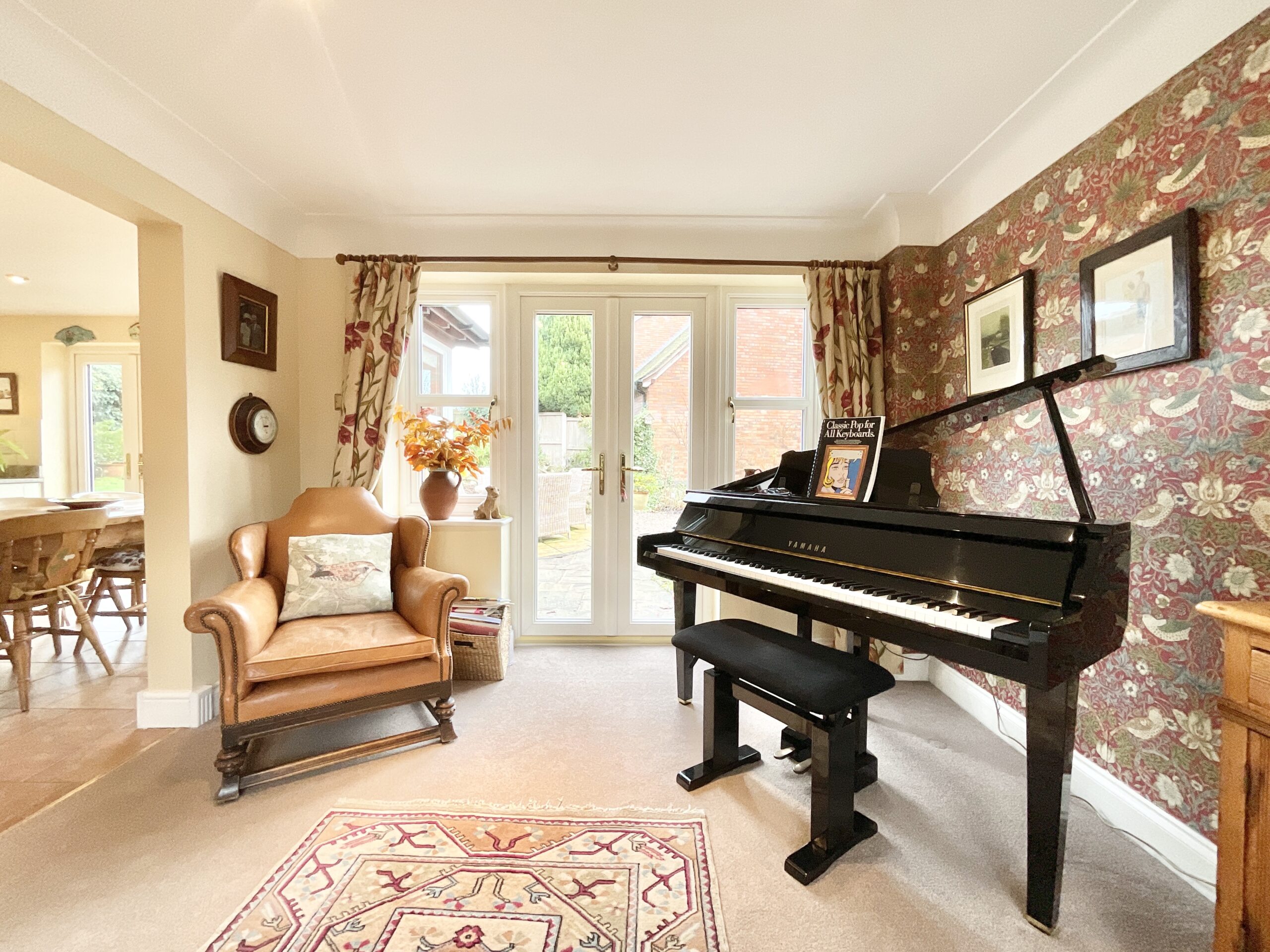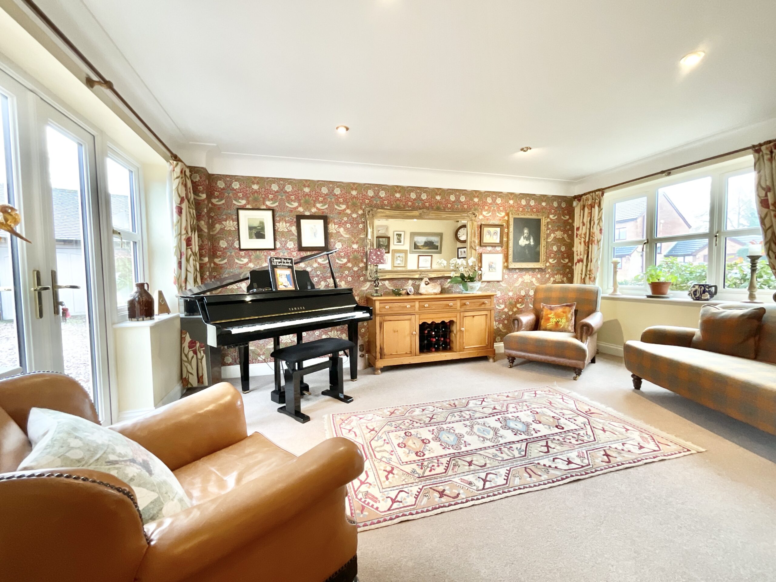 Across the hall, you are met with a substantial and impressive kitchen/dining room bathed in natural light and opening directly onto the rear garden through elegant French doors. The kitchen is thoughtfully arranged with wraparound cabinetry that incorporates a breakfast bar, creating a sociable heart of the home with integrated appliances including a range cooker, fridge and freezer. Adjoining the kitchen, the utility room offers space for white goods and a dishwasher whilst provides convenient access to the side garden, an ideal spot for growing vegetables or enjoying a quiet outdoor moment. Opposite the dining area, the sitting room forms a semi open-plan layout, offering a wonderfully versatile space that can be tailored to suit your lifestyle, whether as a hobbies room, music room, study, or a creative haven for children.