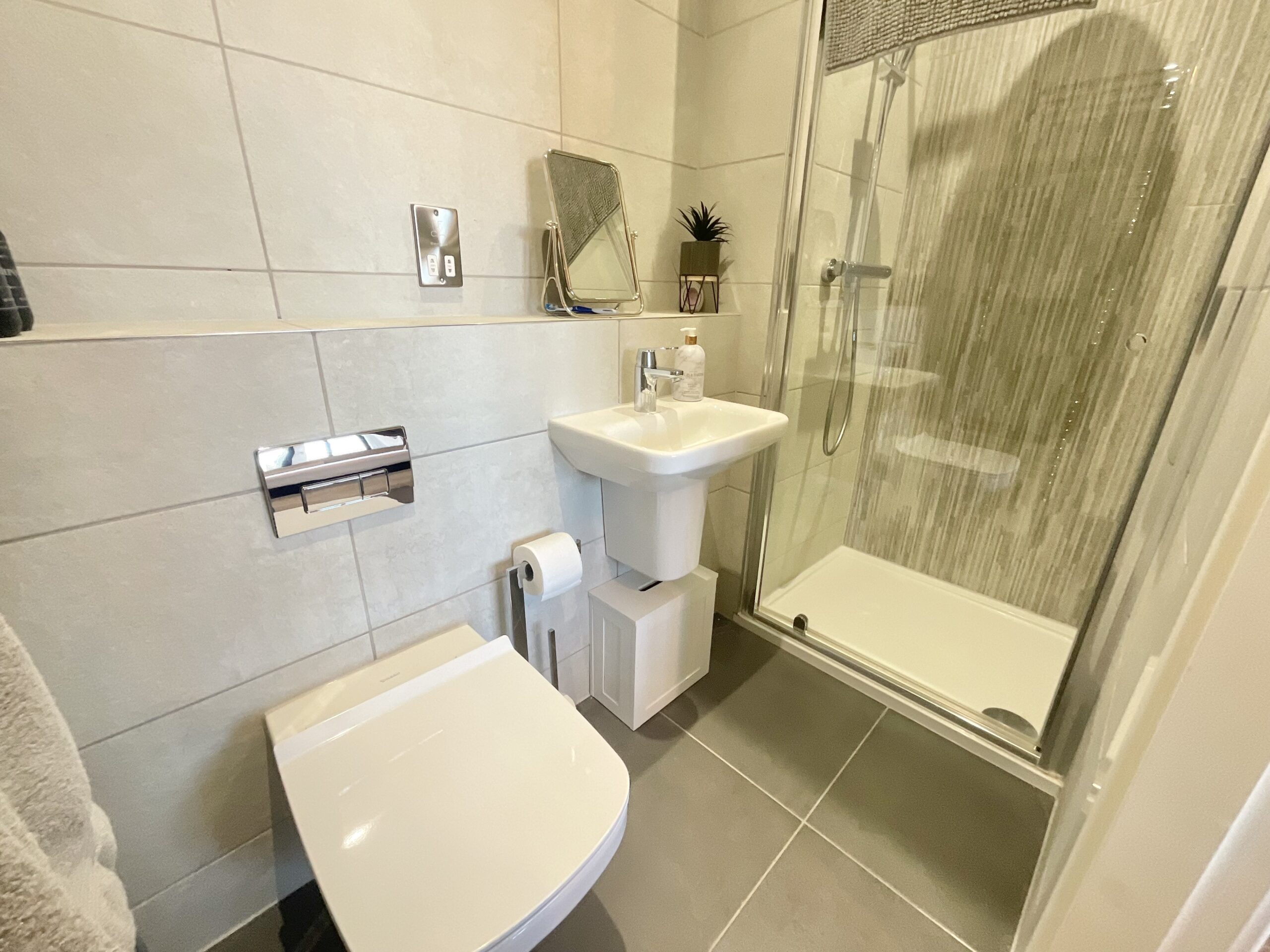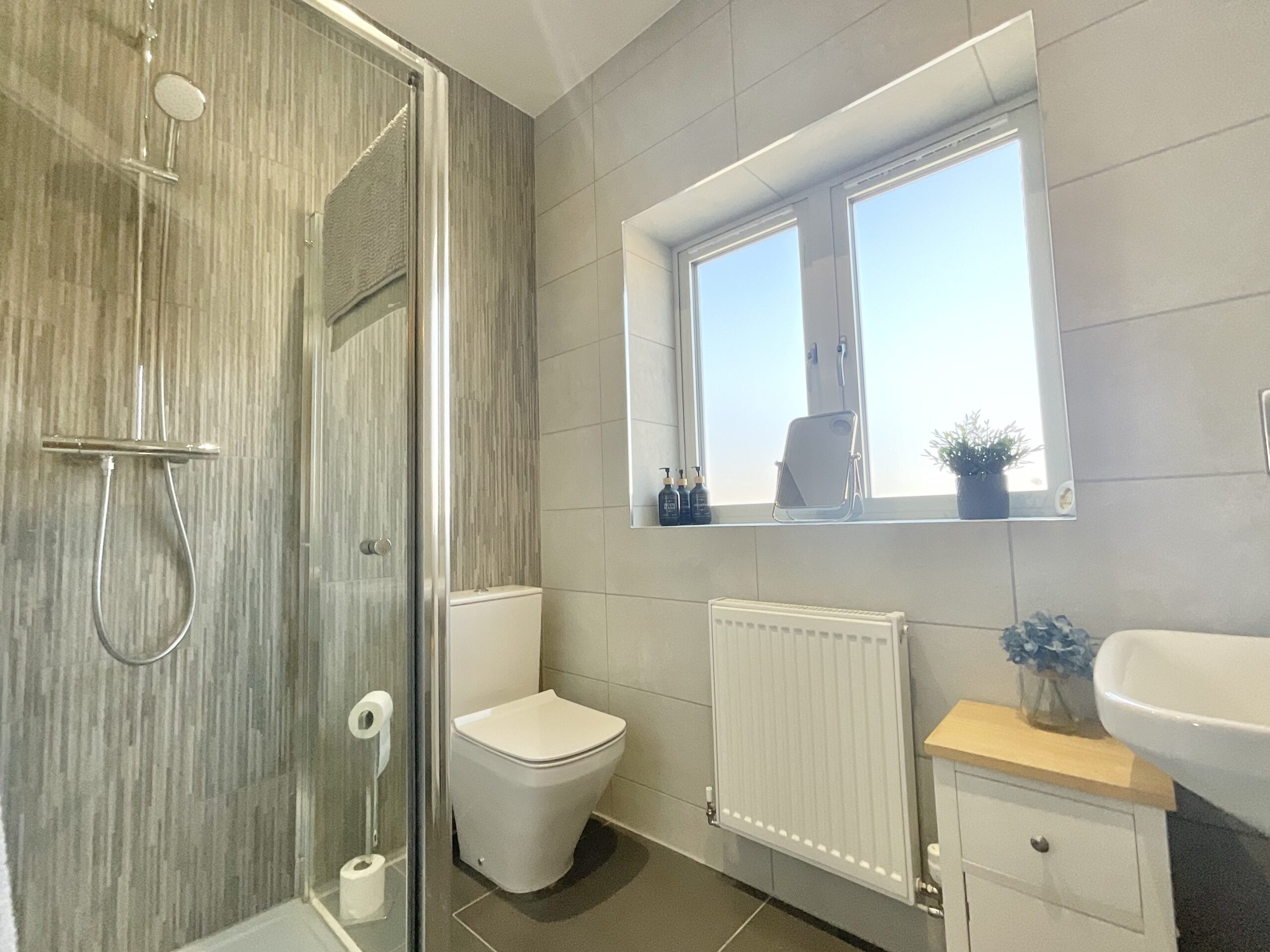 The contemporary family bathroom is well-appointed with both bath and shower over the bath for added convenience.