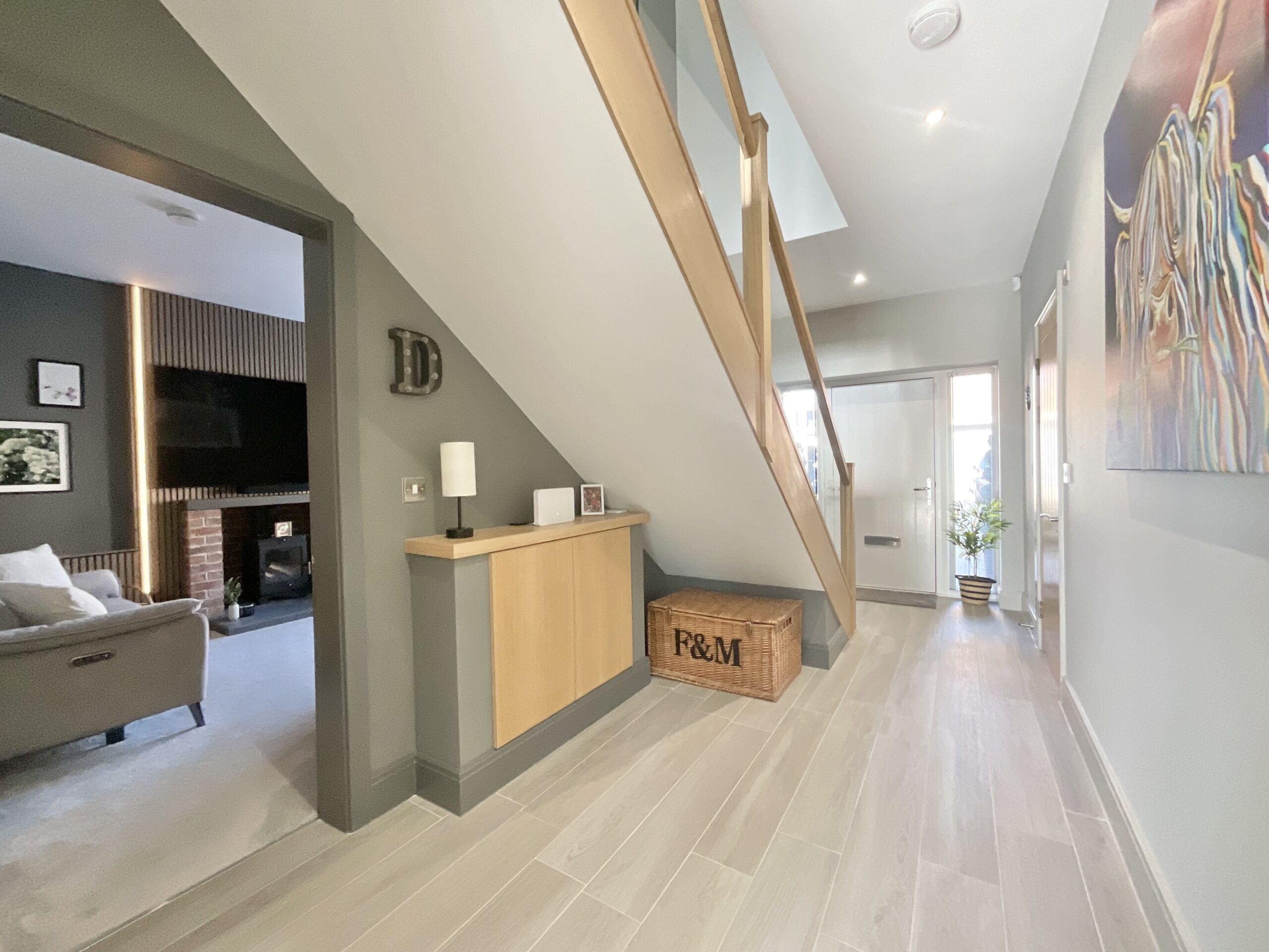 From the moment you step into the welcoming entrance hall, the quality of finish is immediately apparent, with underfloor heating throughout the ground floor, a composite front door, and contemporary touches including brushed chrome fittings and a striking glass and oak staircase. A cleverly utilised airing cupboard provides practical and stylish shoe storage.