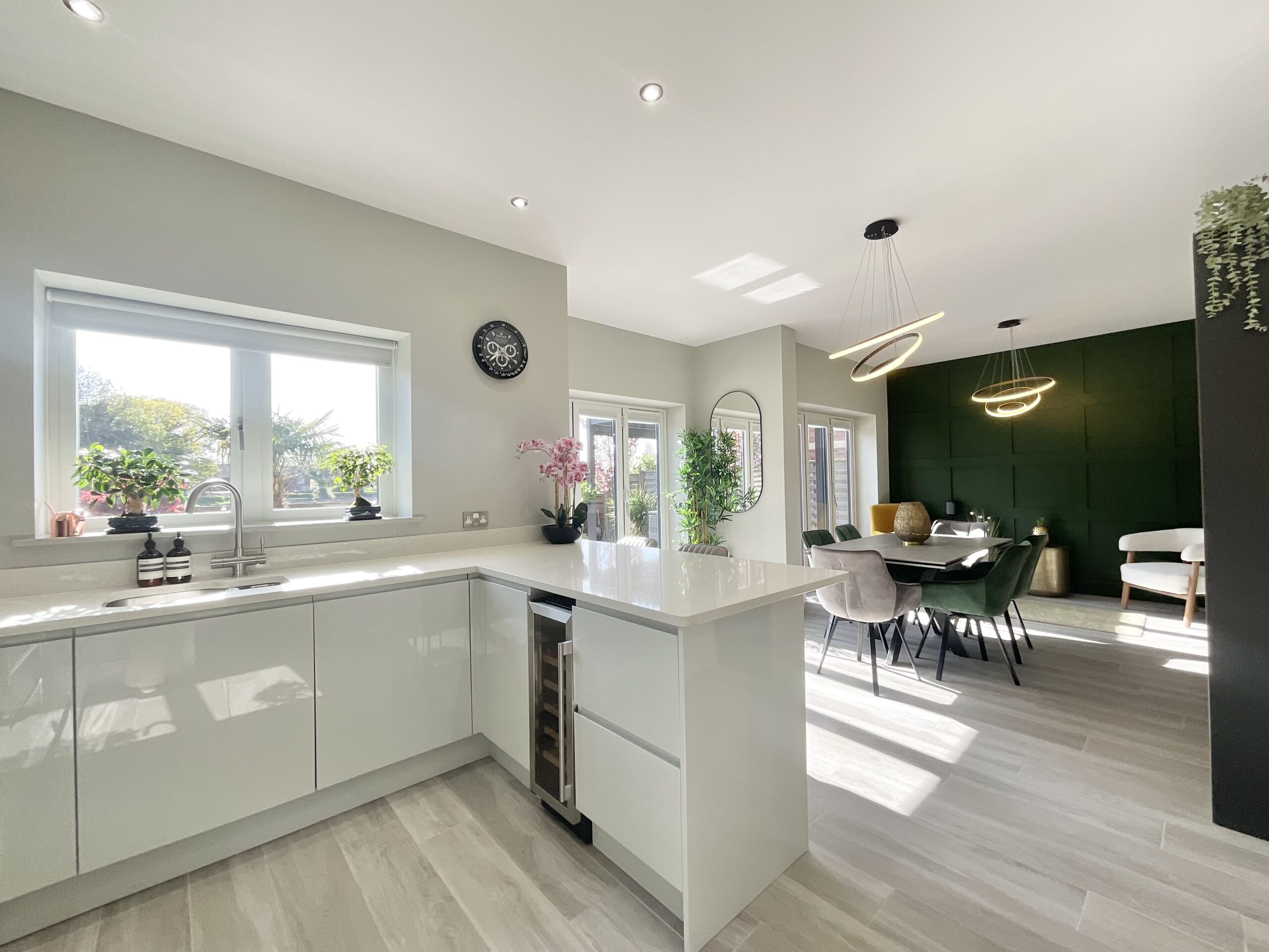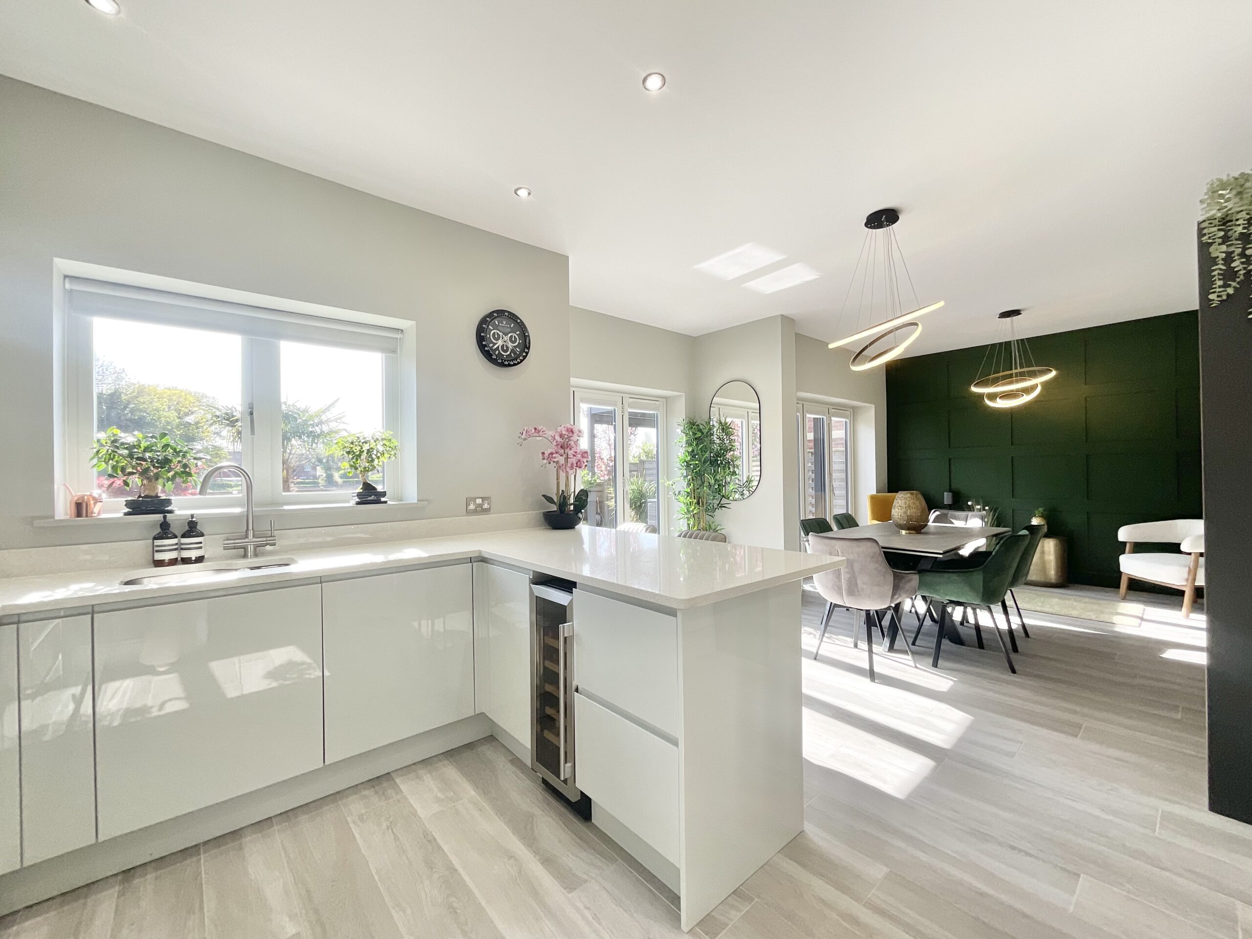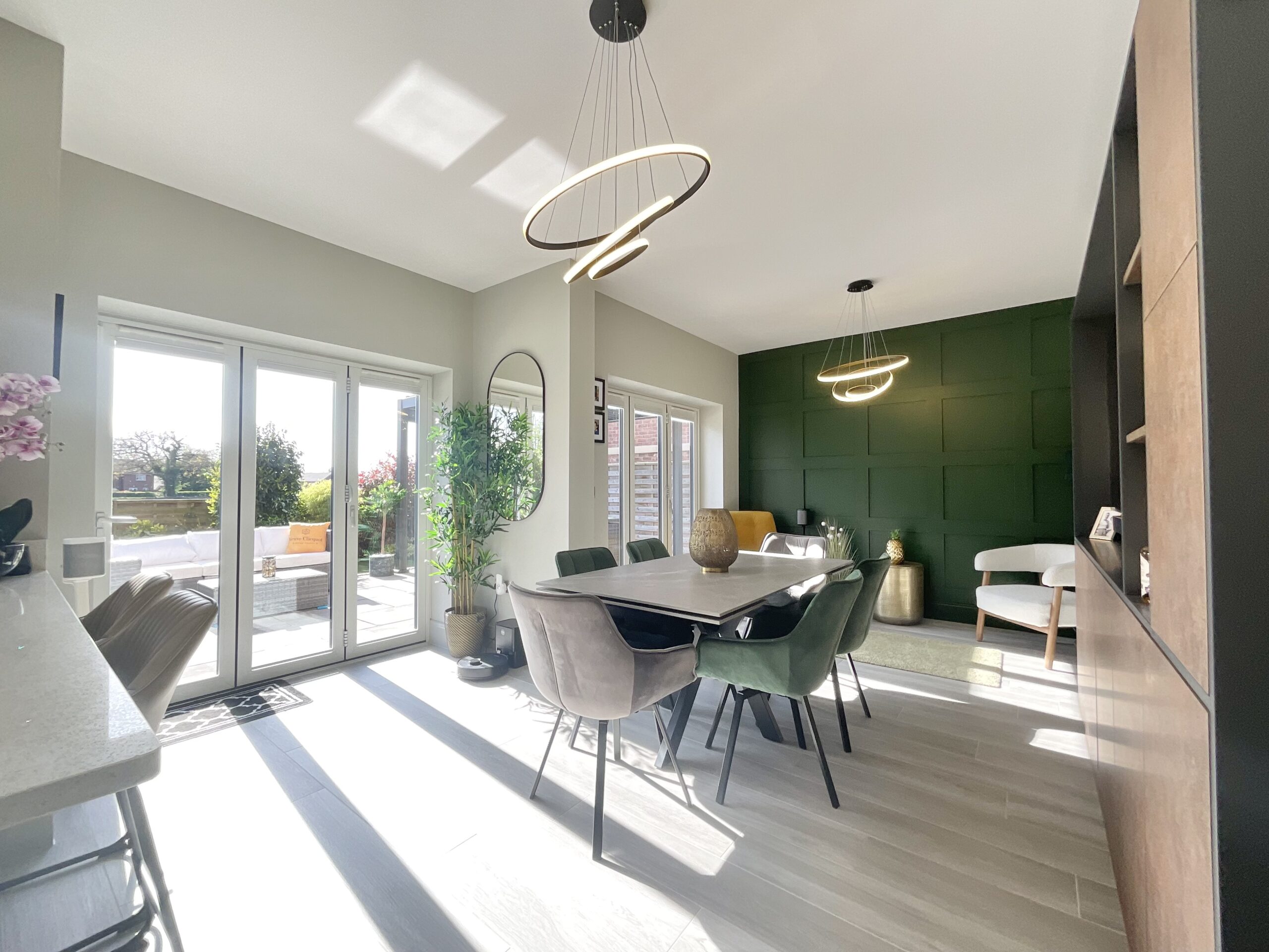 1. Impressive full-width open-plan kitchen, dining and family room with bi-fold doors, media wall and panelled features, ideal for modern living and entertaining