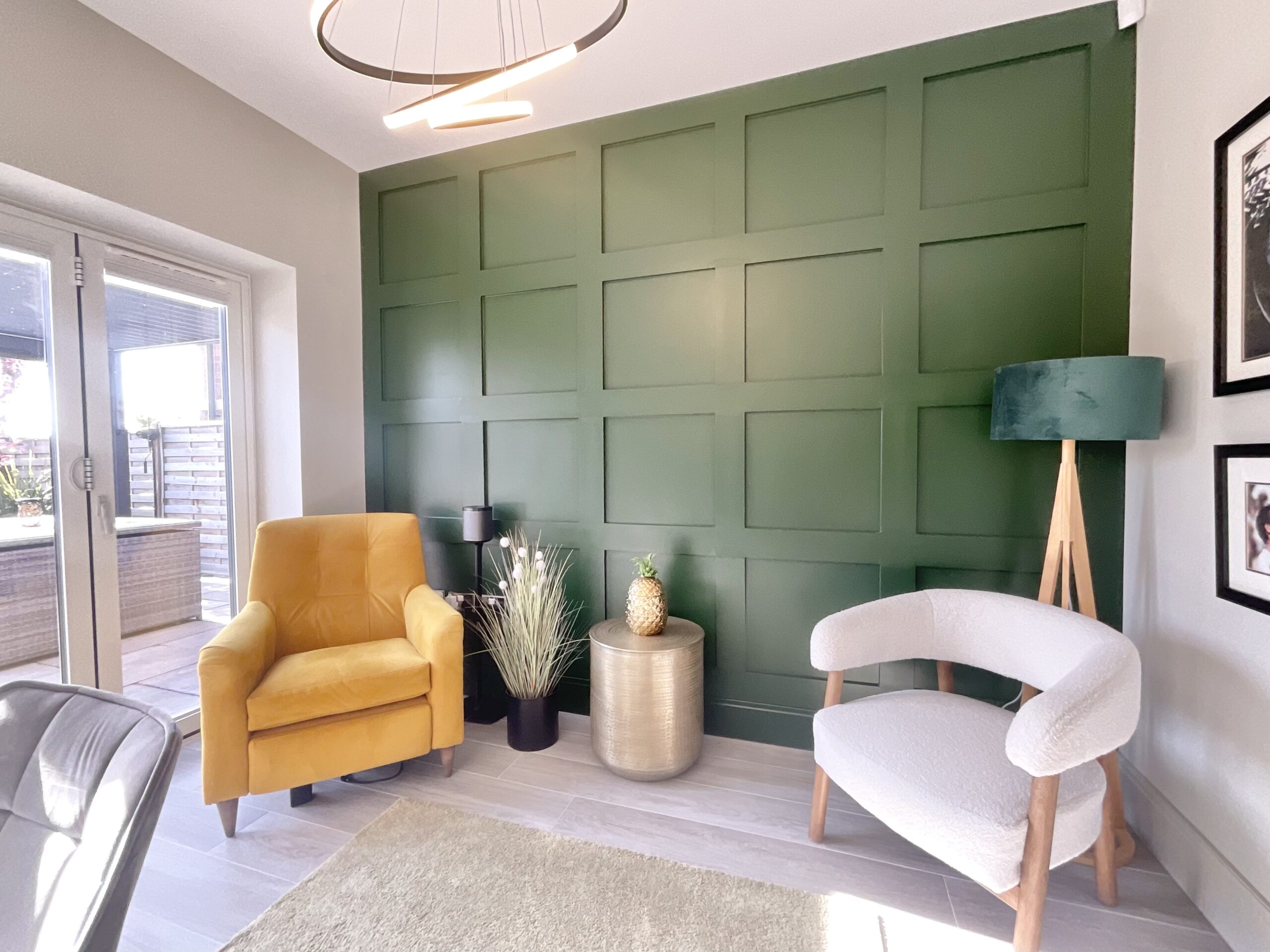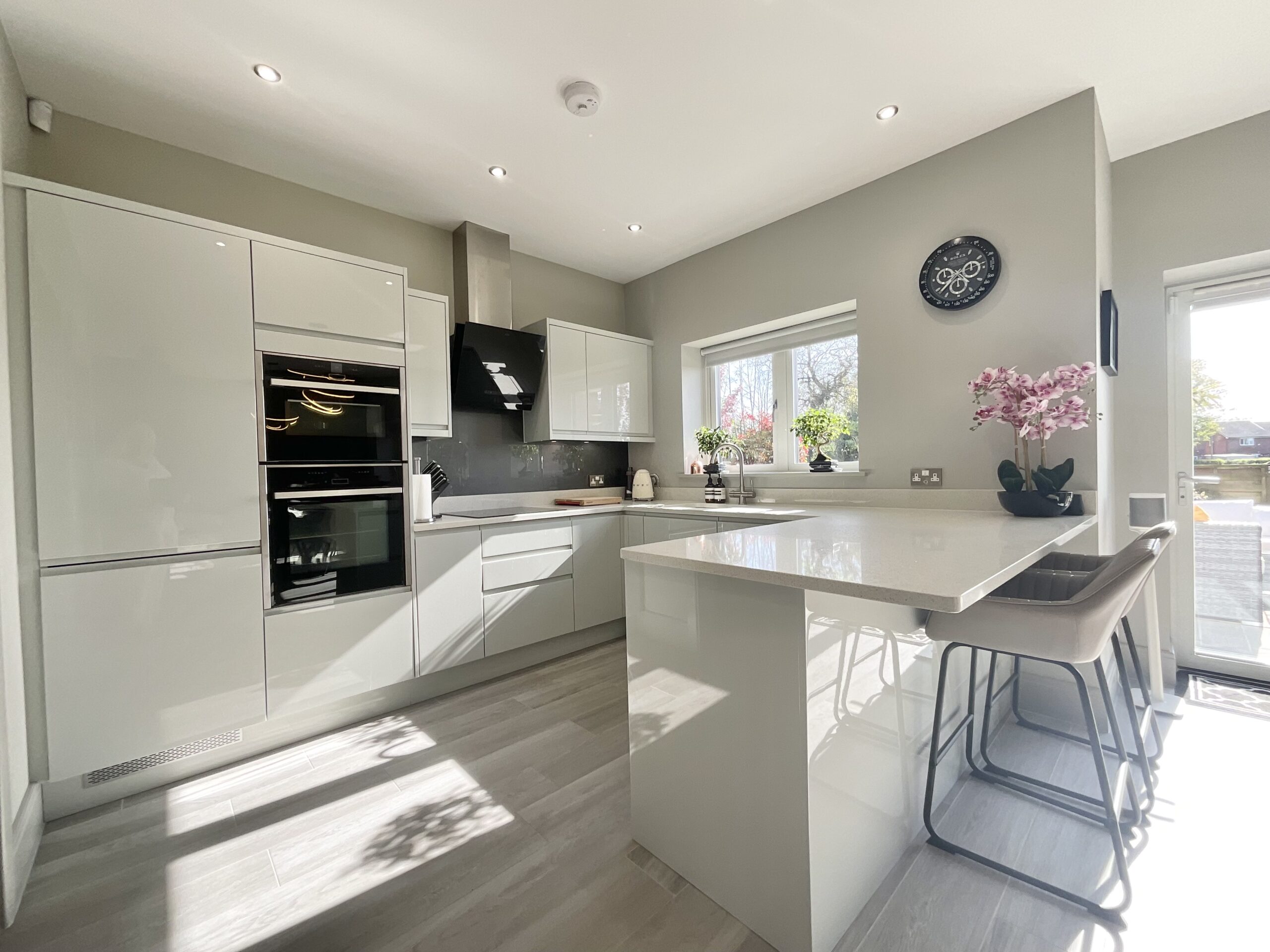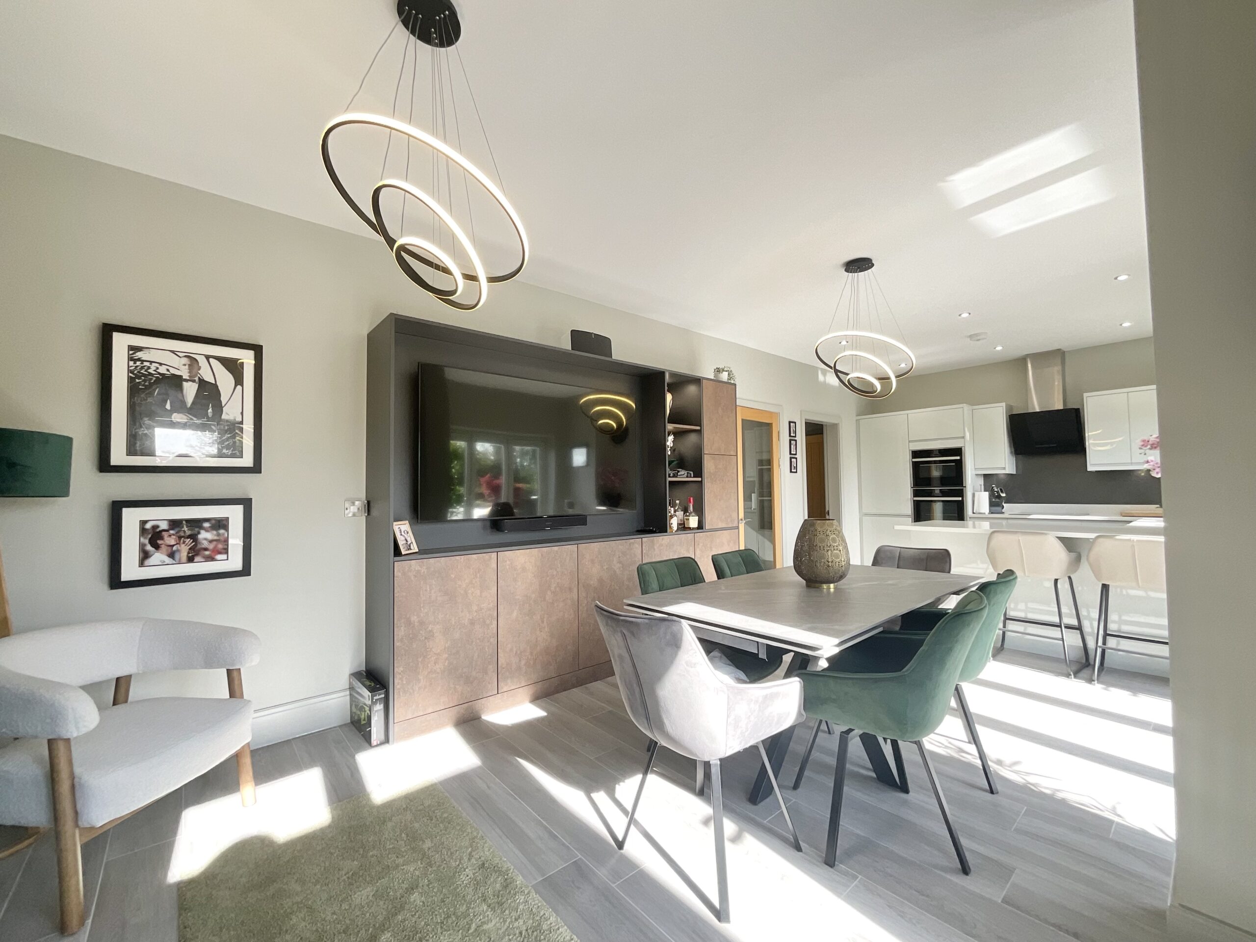 The lounge is a standout space, combining warmth and contemporary design. A feature log burner creates a cosy focal point, while bespoke wall panelling with integrated LED lighting adds a modern, ambient feel, perfect for relaxing evenings. Plantation shutters complete the look, giving the room a polished and high-end finish.