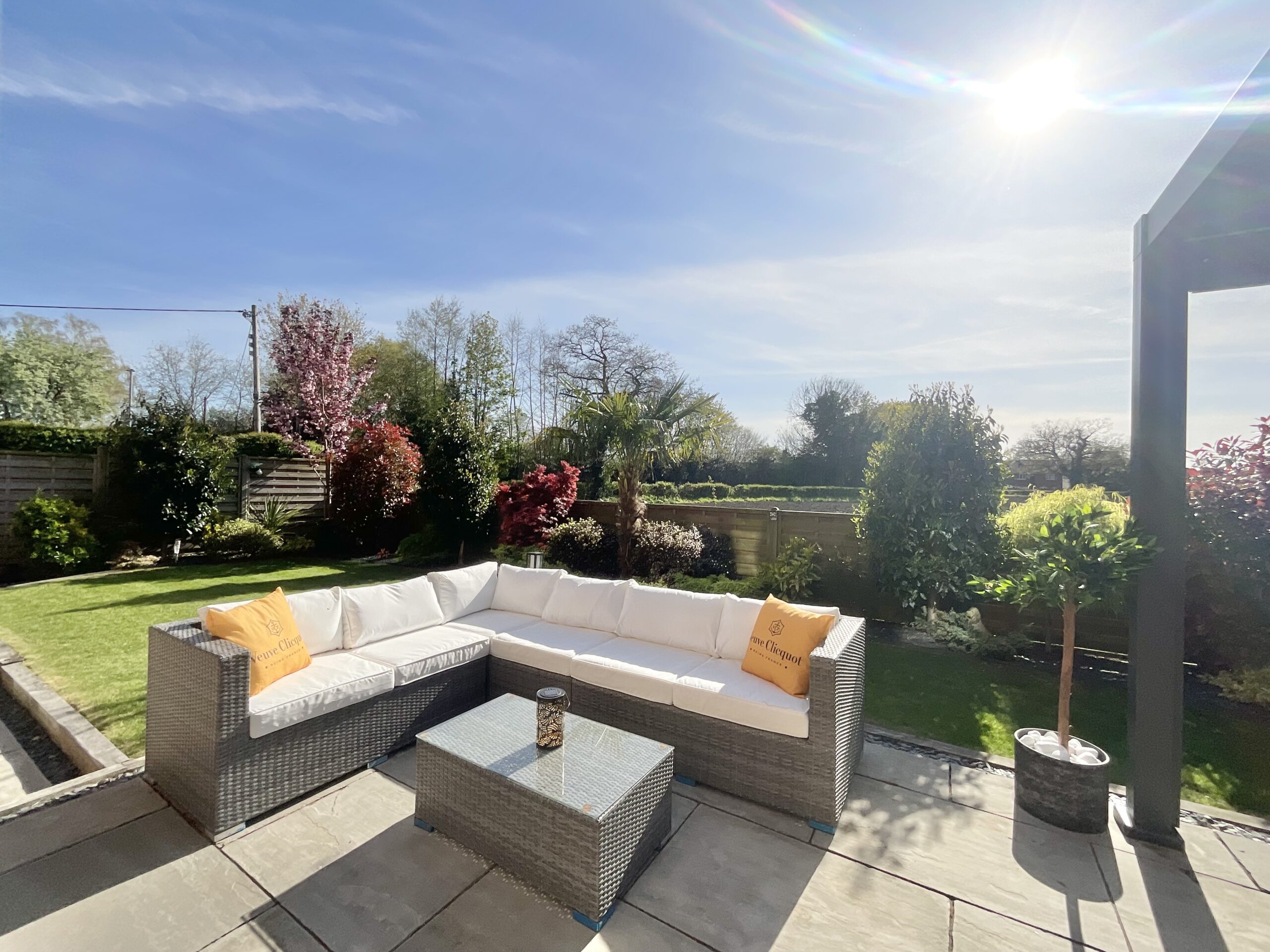 4. Beautifully landscaped rear garden with Indian stone patio, pergola and hot tub, enjoying unspoilt views over open farmers’ fields