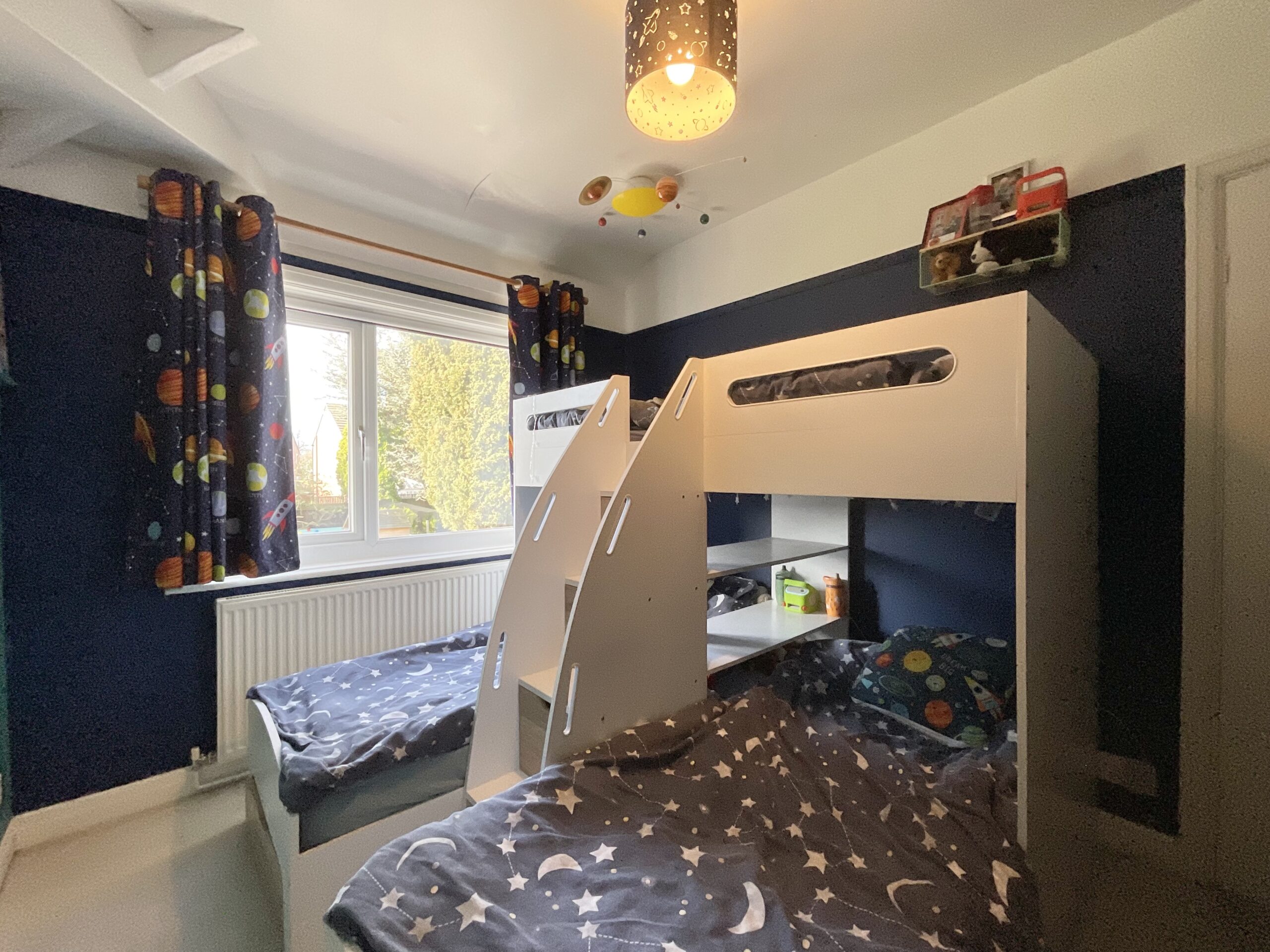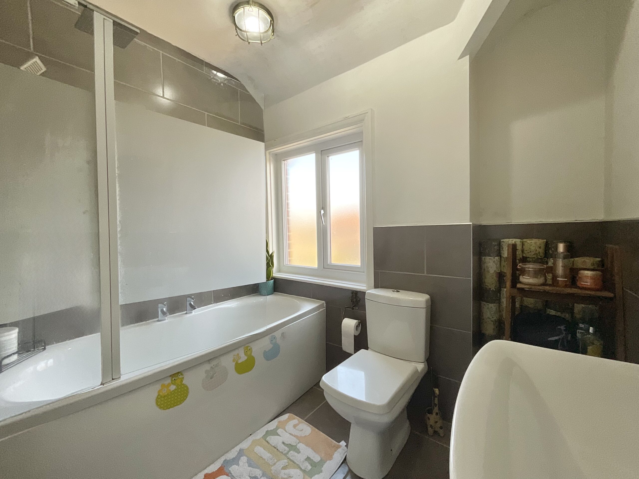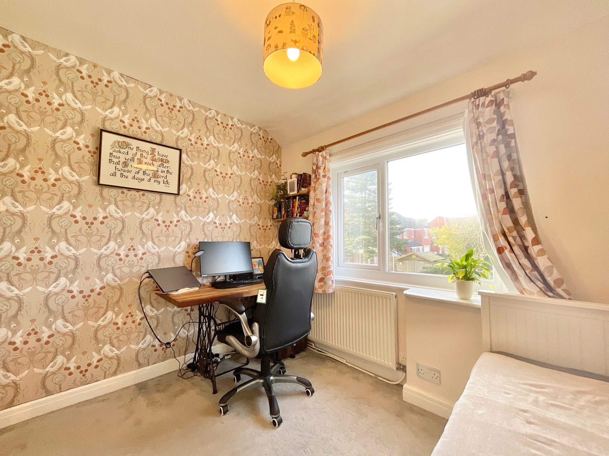 On the first floor, a central landing leads to three bedrooms and the family bathroom. The main bedroom is a generously sized room located at the front of the property. Bedroom two is another well-proportioned double room, while bedroom three is currently utilised as a home office/study, providing a practical workspace, though it would also function well as a single bedroom, nursery, or guest room. The family bathroom is positioned off the landing and serves all three bedrooms.