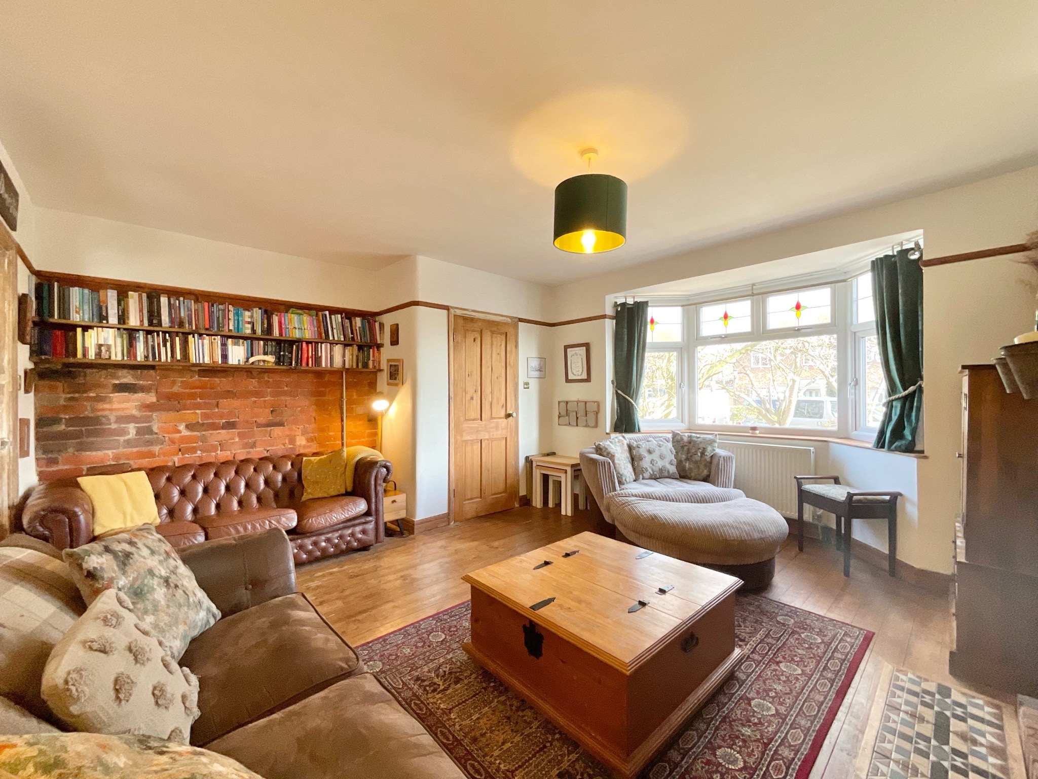The property is entered through an entrance hall, which provides access to the principal ground floor rooms and the staircase leading to the first floor. To the front of the house is a bright and spacious living room featuring a bay window and a wood burner, creating a warm and welcoming main reception space.