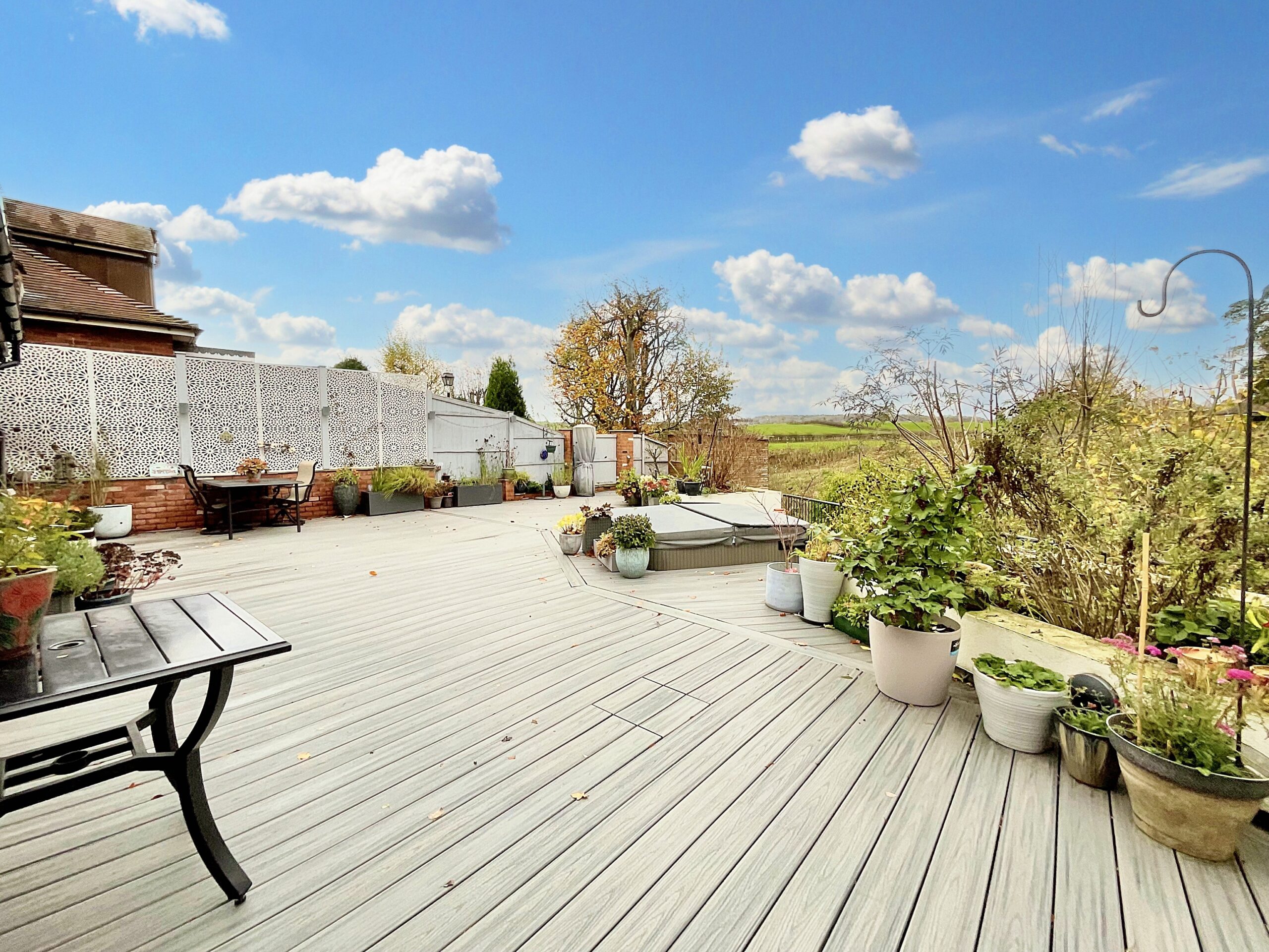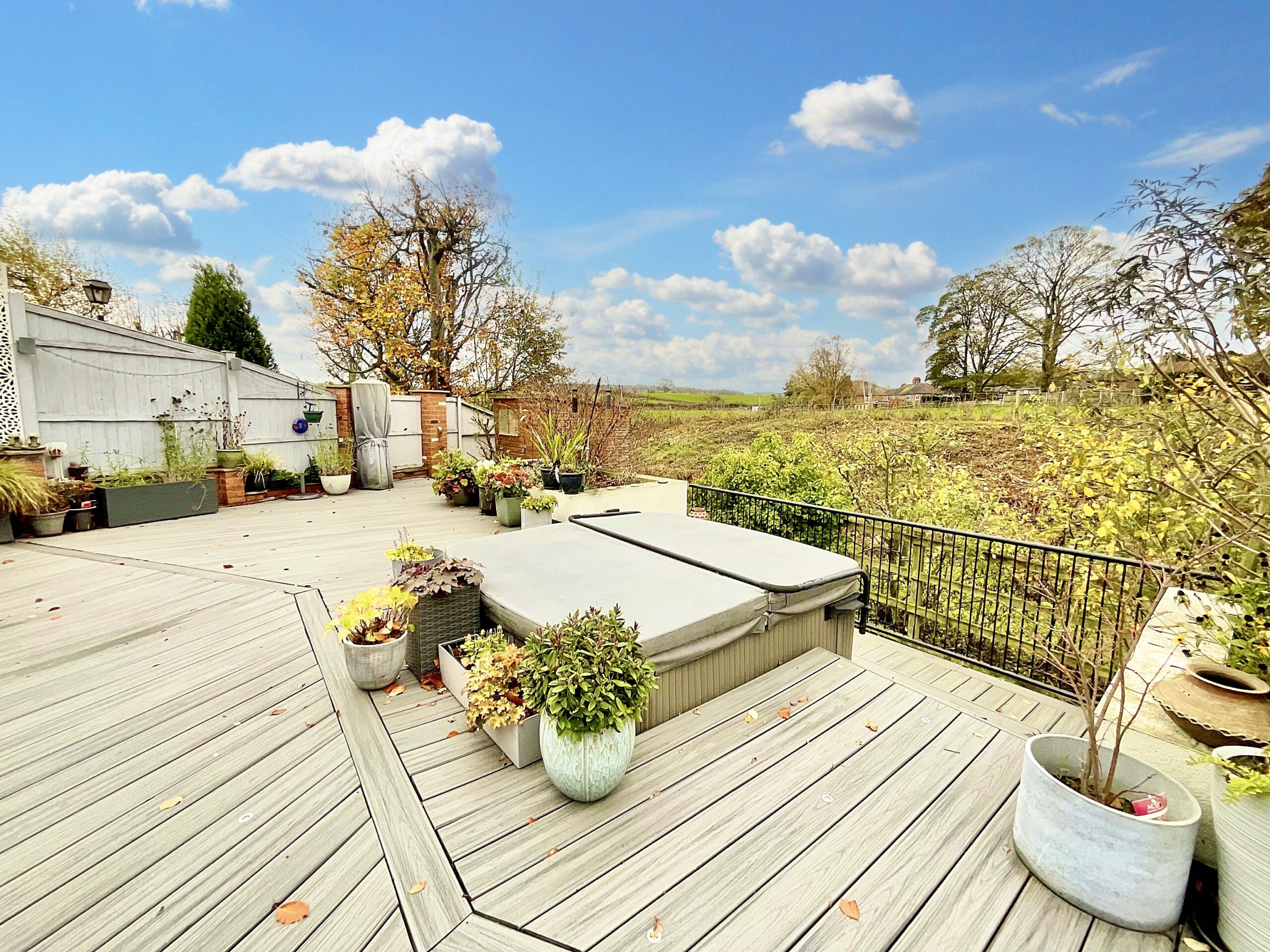 Outside, the rear garden enjoys open, unspoilt views across fields, with composite decking, a sunken hot tub (included in the sale), and two garden sheds providing ample storage. The front driveway is secured by electric gates and provides off-road parking for up to three cars.