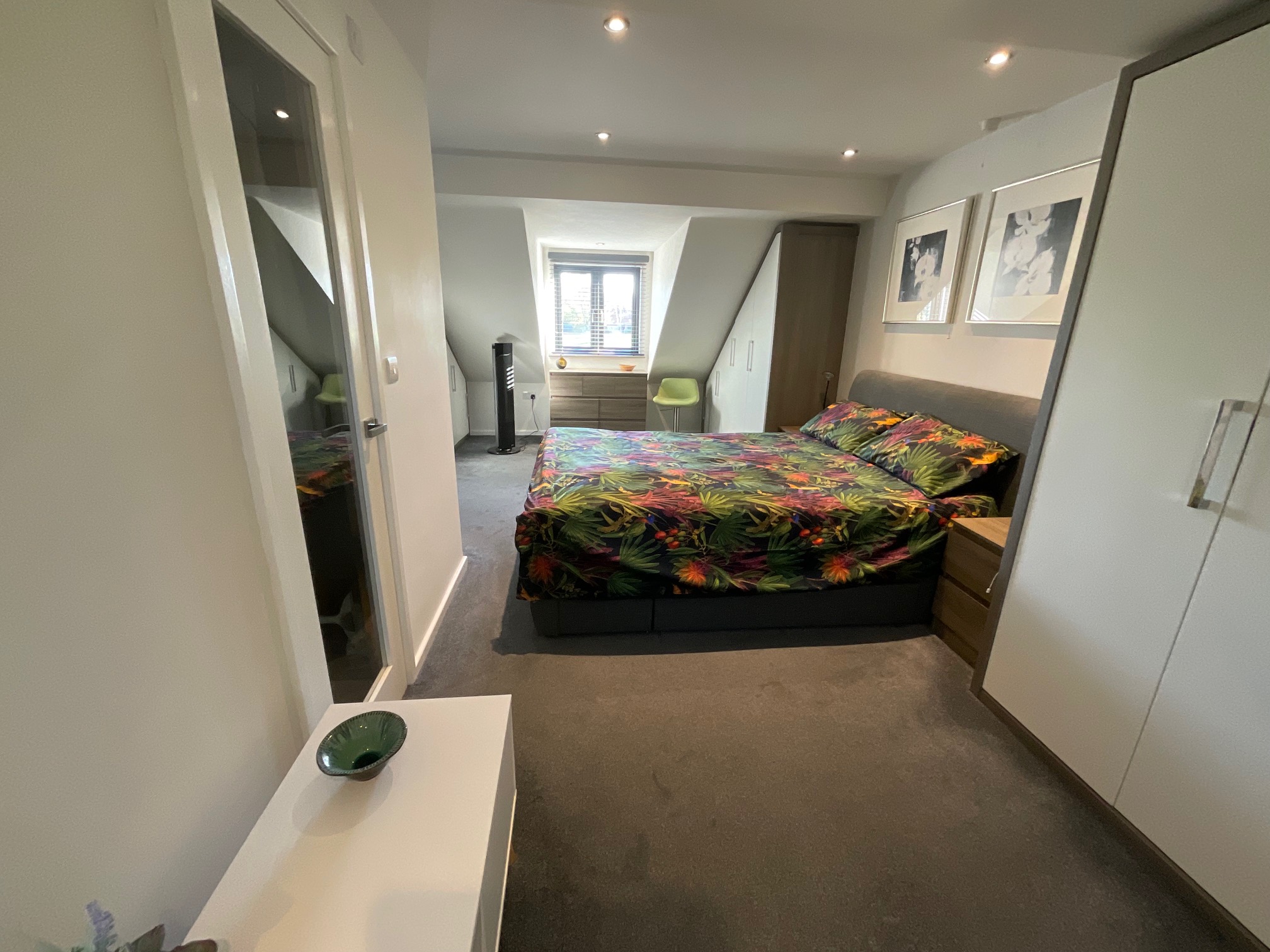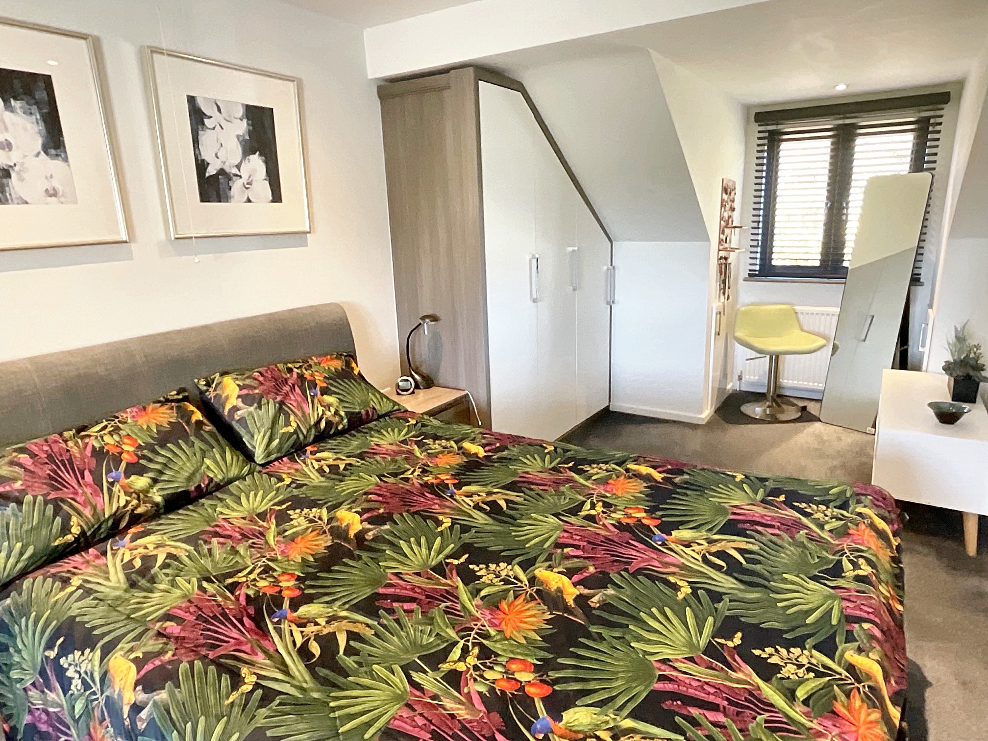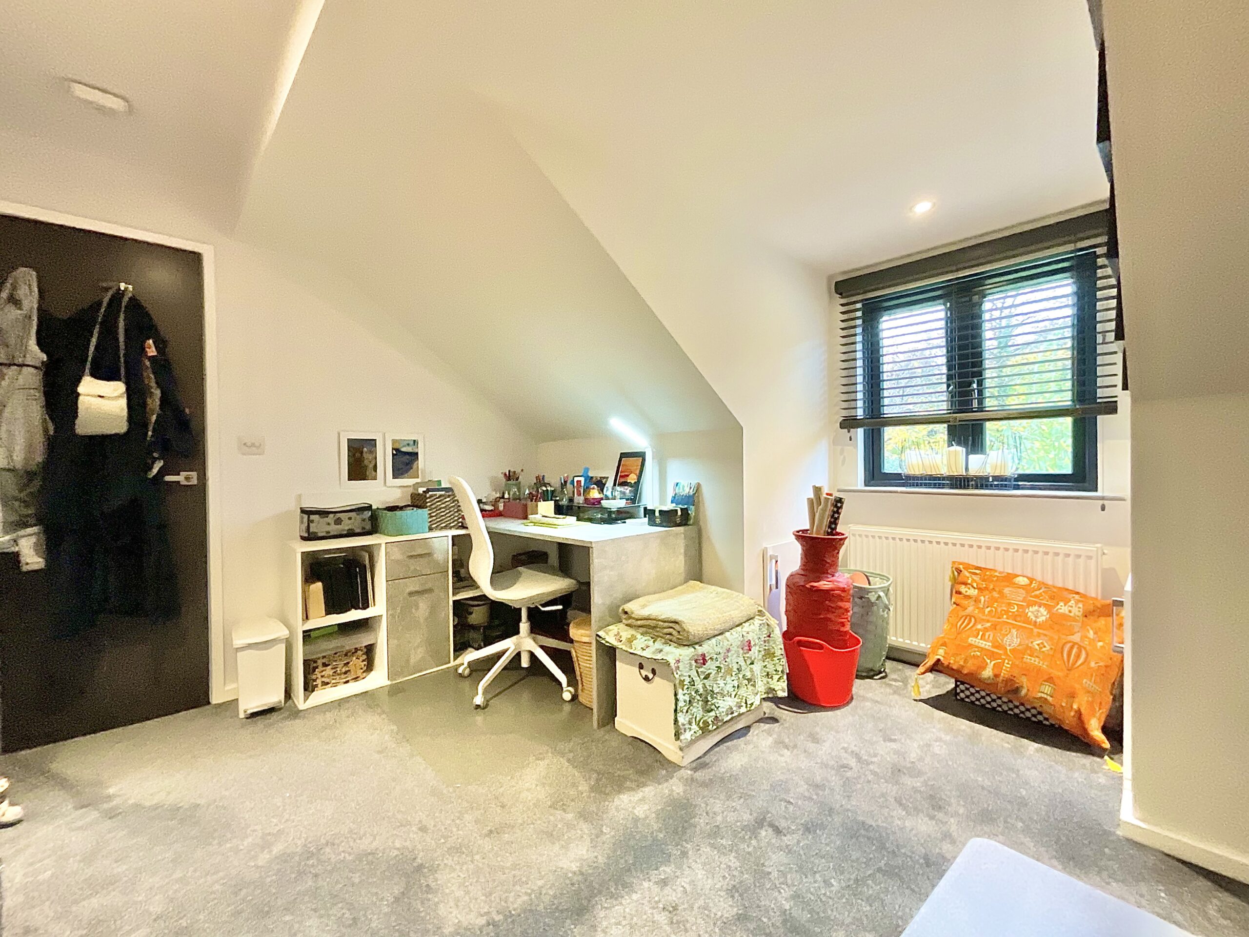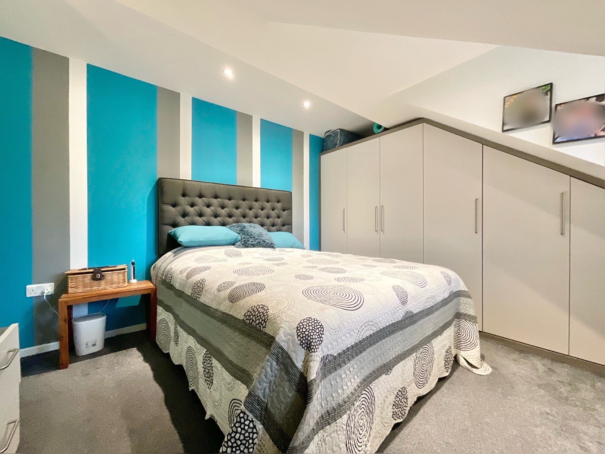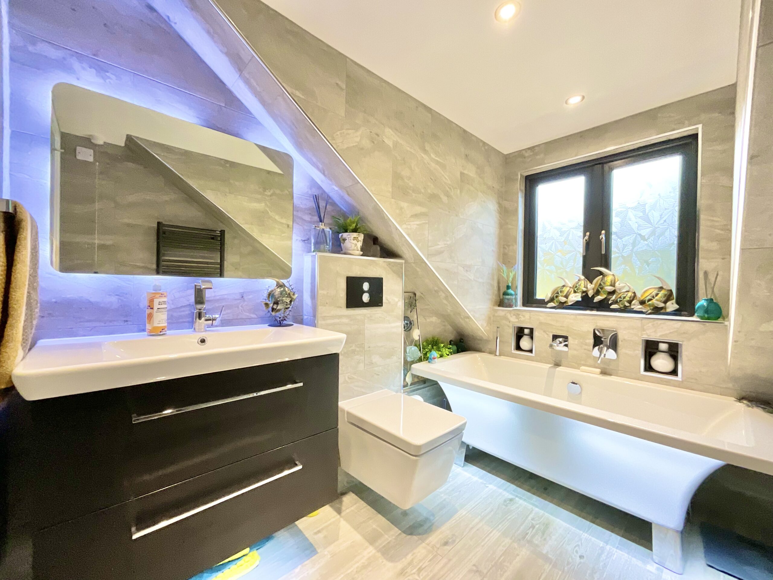 Upstairs, the master bedroom features a range of bespoke fitted wardrobes and a modern en-suite with mains-fed shower, wall-hung vanity sink, and WC. Bedroom 3 offers clever eaves storage, while Bedroom 4 includes built-in wardrobes. The family bathroom is stylish and contemporary, boasting a freestanding LED-lit bath, separate shower hose, wall-hung WC and sink, and an LED backlit mirror.