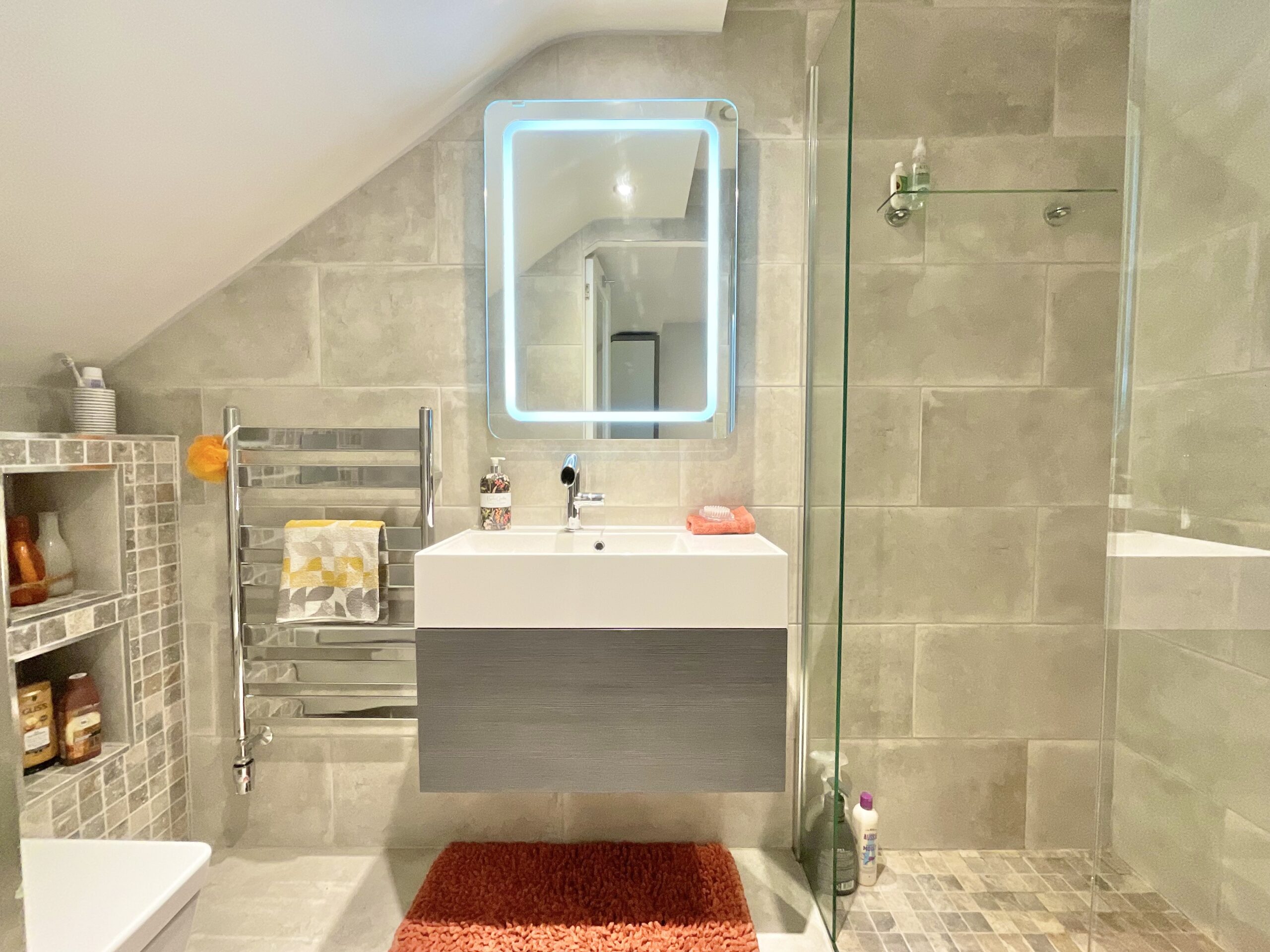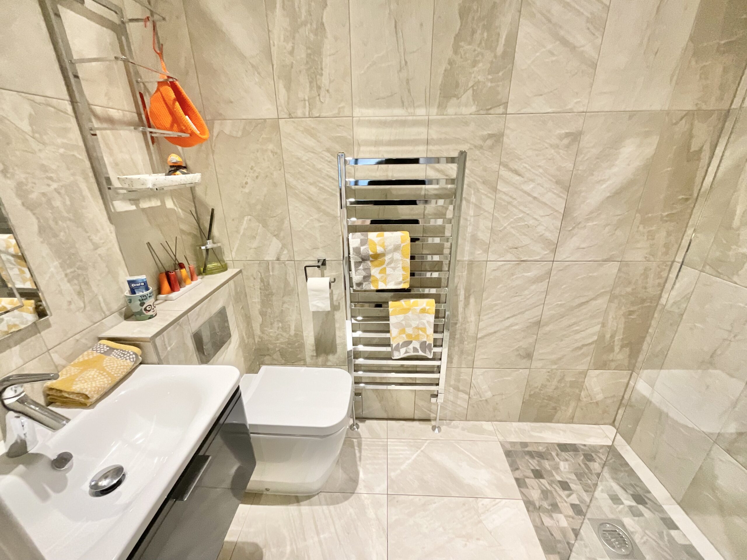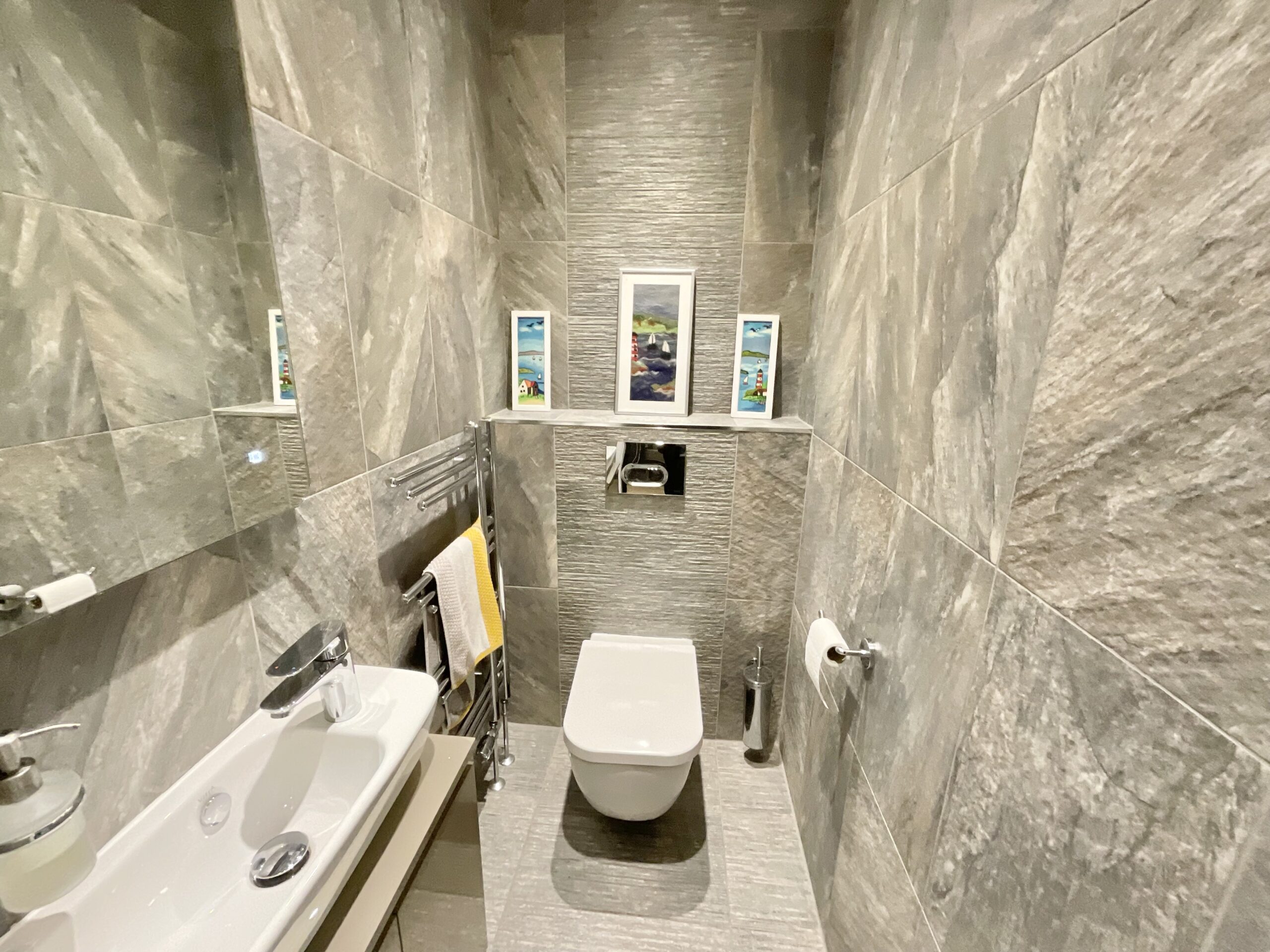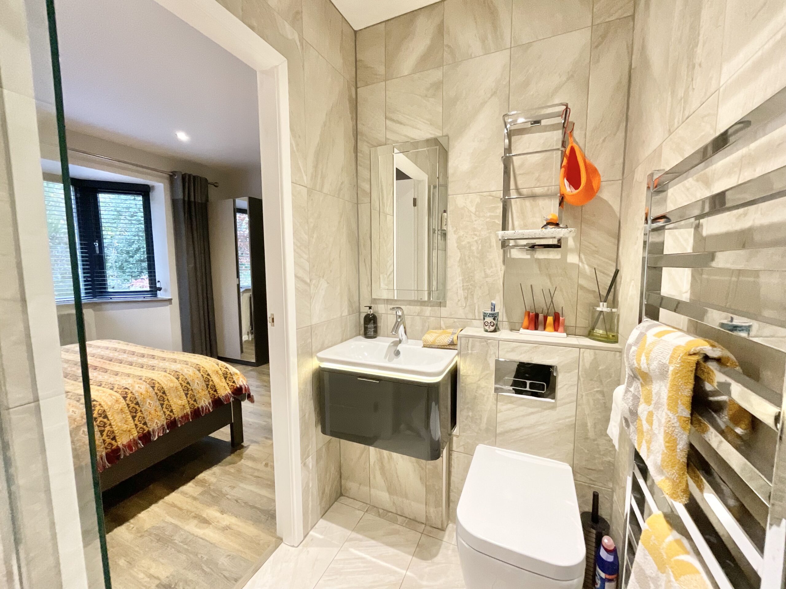 A second downstairs bedroom offers flexibility for guests or multi-generational living, complete with a stylish en-suite featuring a mains-fed walk-in shower, wall-hung vanity sink, and WC. There is also a convenient downstairs WC.