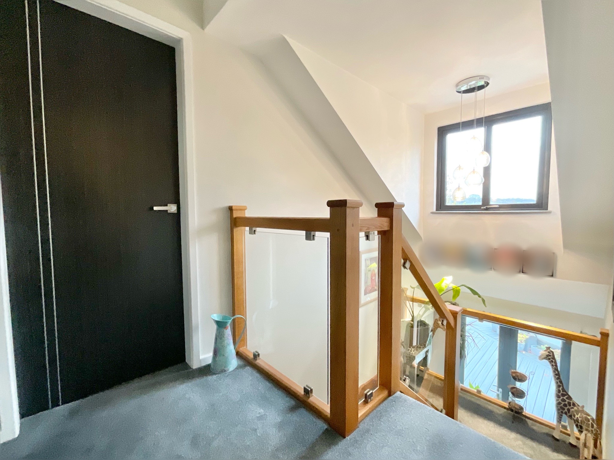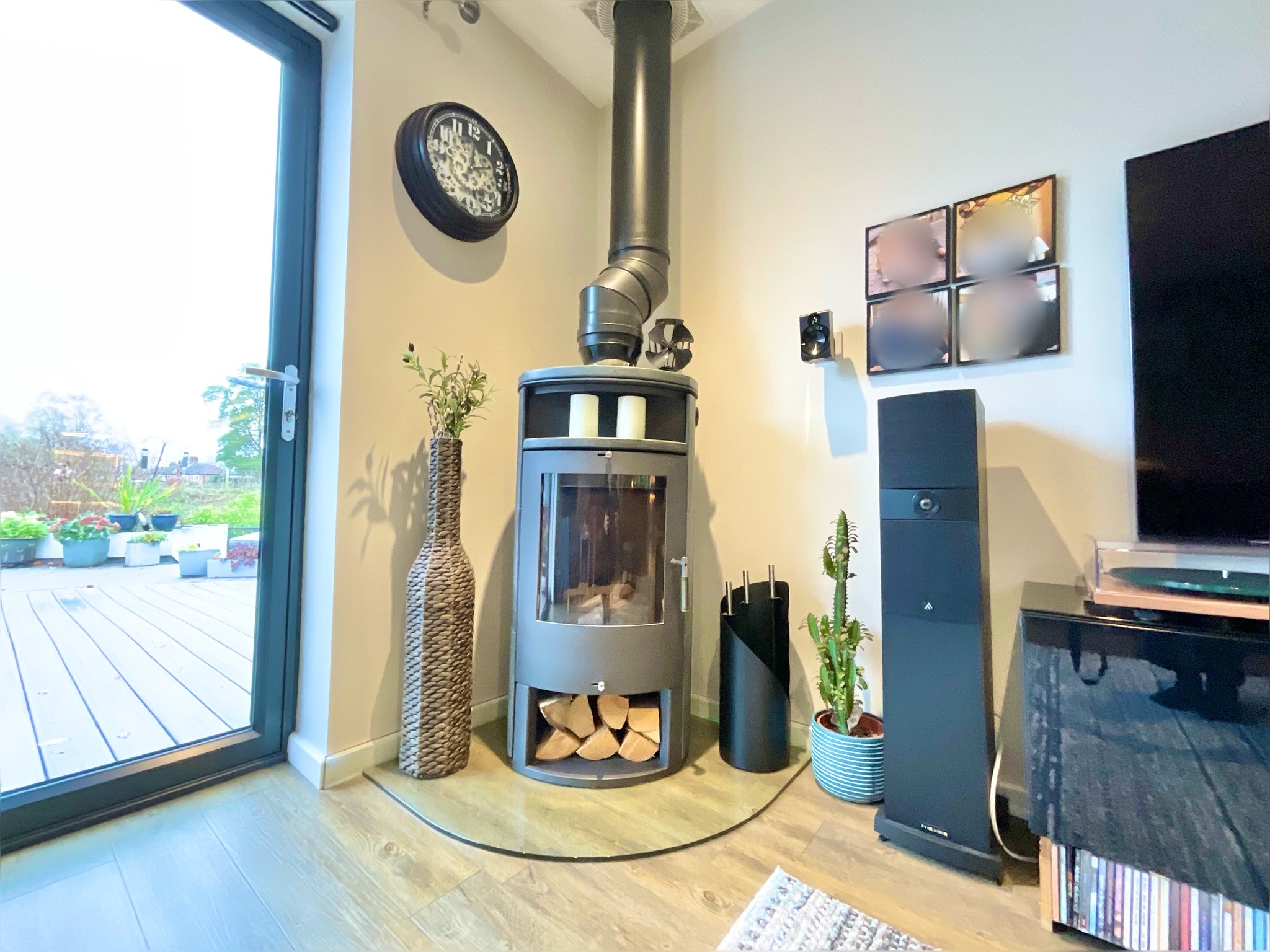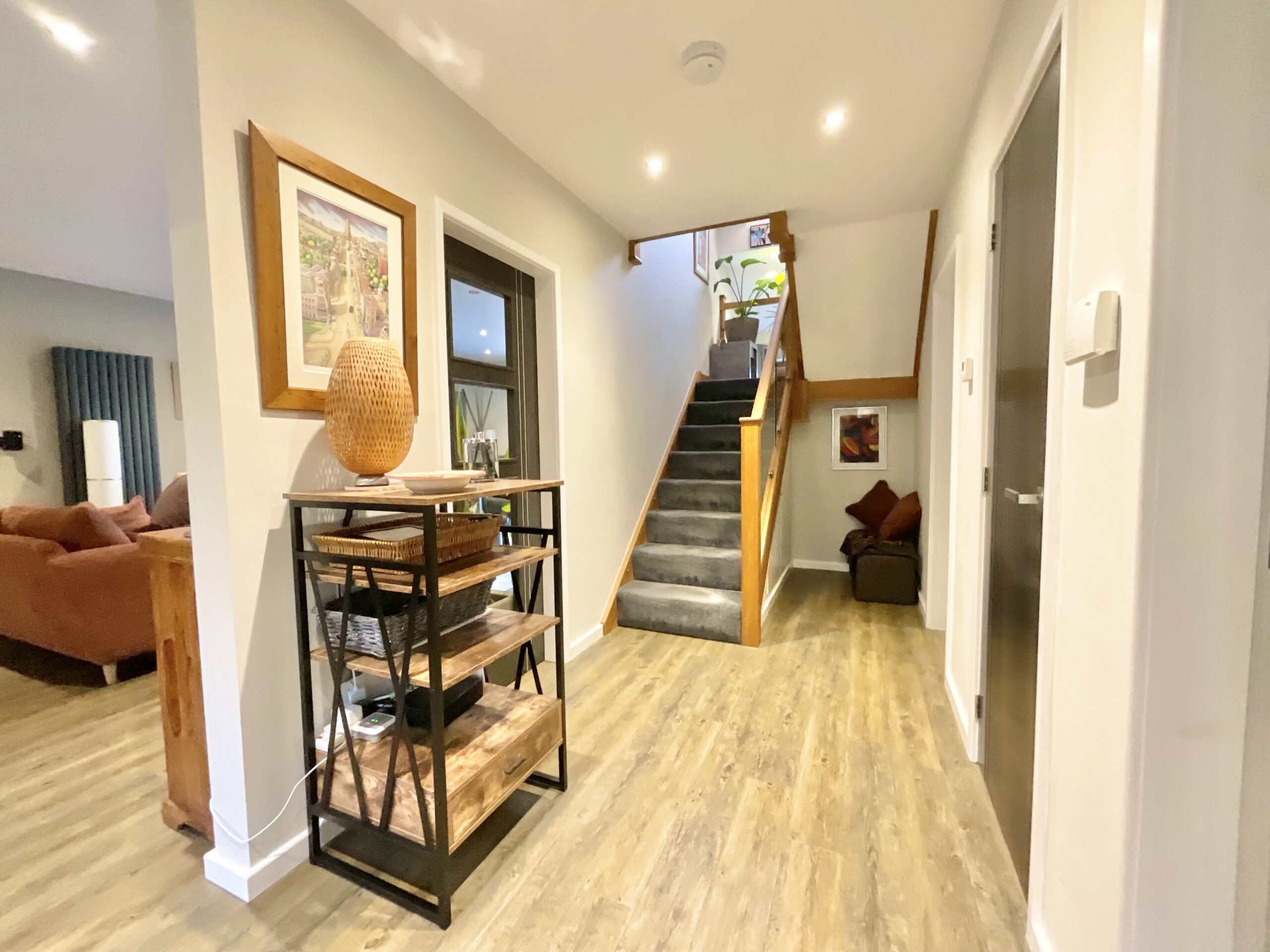 Step into the welcoming entrance hall featuring wood-effect flooring and a contemporary glass balustrade staircase with clever pull-out storage for shoes and accessories. The spacious lounge/diner is ideal for entertaining, boasting a multi-fuel burner, built-in Panasonic surround sound system, and bi-fold doors opening onto composite decking that overlooks the garden and fields beyond.