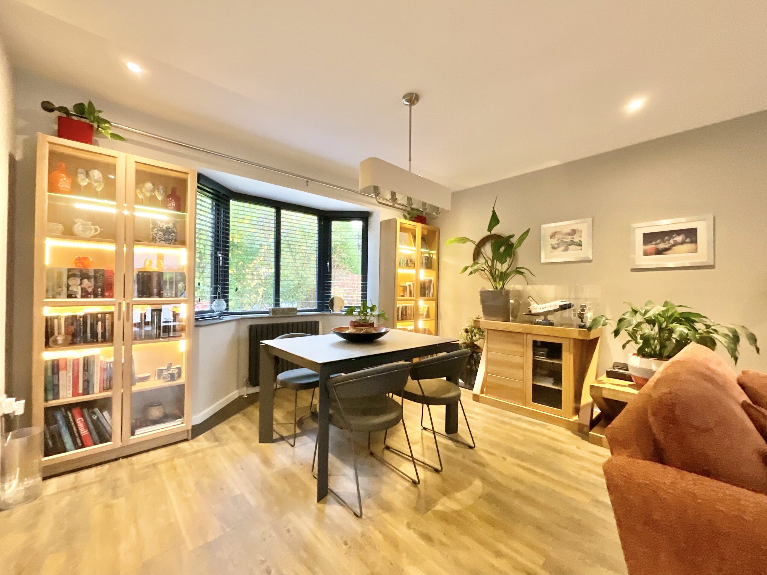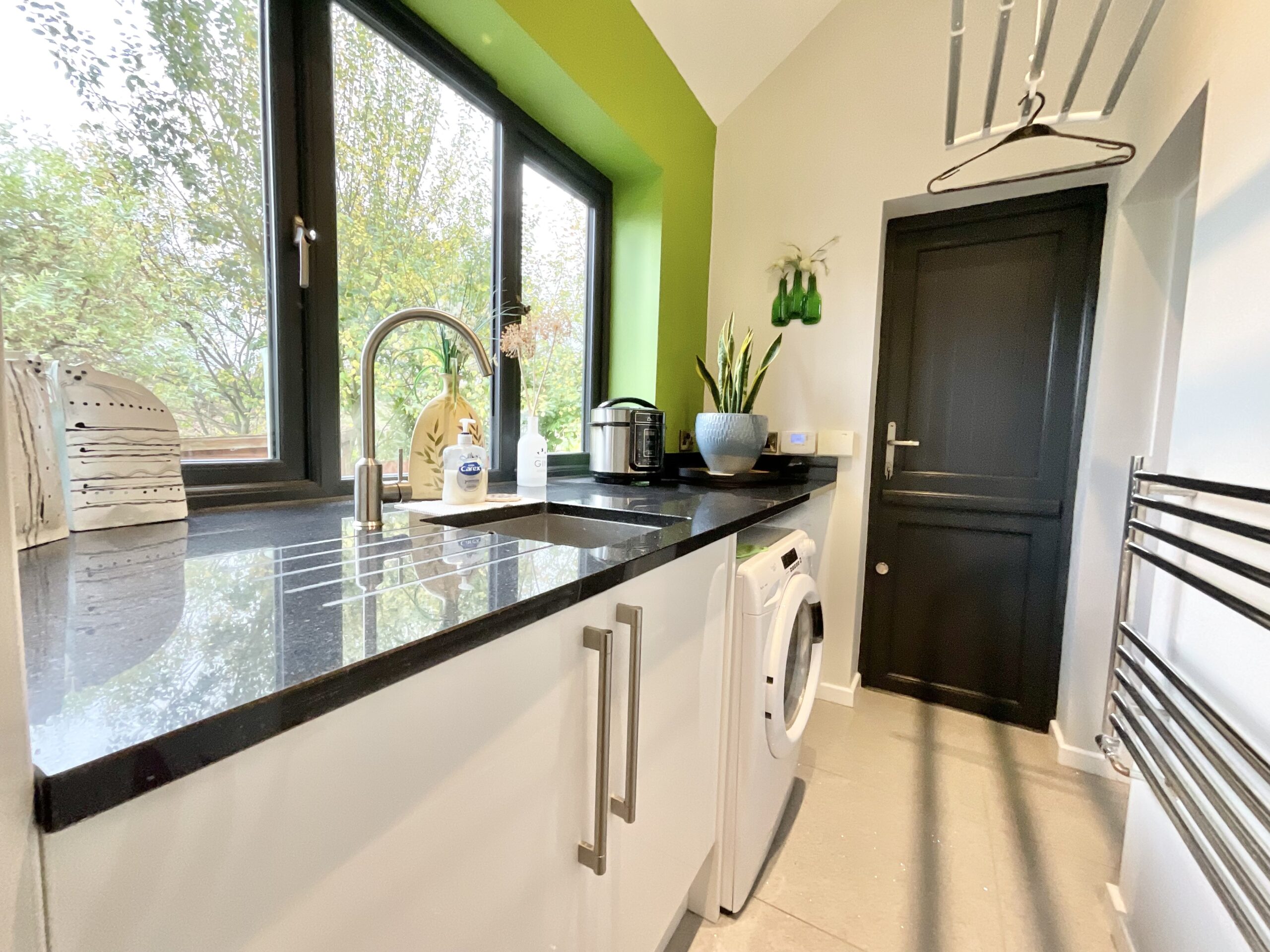 The kitchen/breakfast room is a real showstopper – fitted with grey gloss units, granite worktops, sparkly tiled flooring, and a central island. Integrated appliances include a wine cooler, fridge/freezer, double oven with combination oven/microwave, 4-ring induction hob, and dishwasher. The underfloor heating ensures comfort all year round. A charming small sun room provides the perfect space to enjoy morning coffee while overlooking the garden.