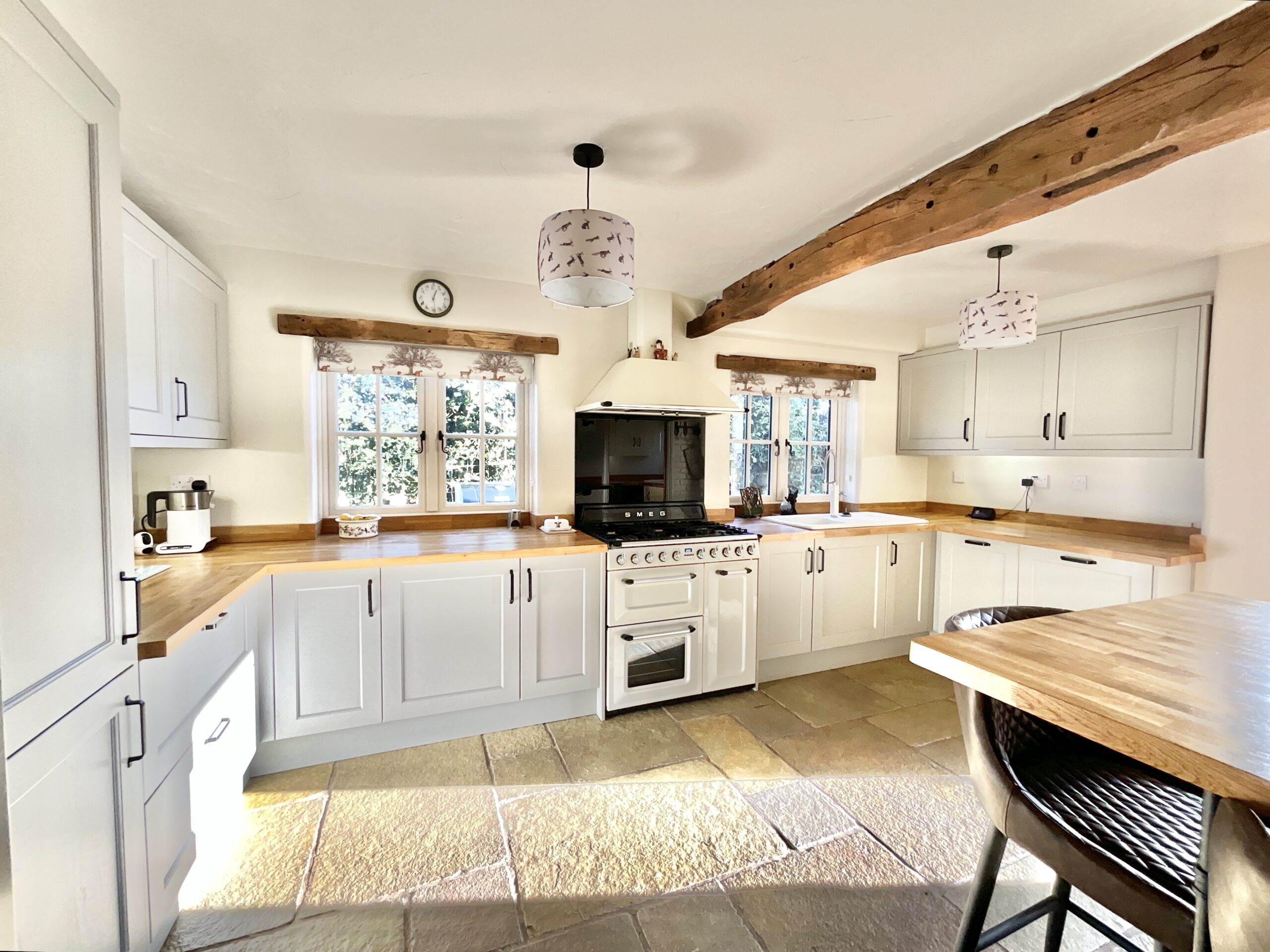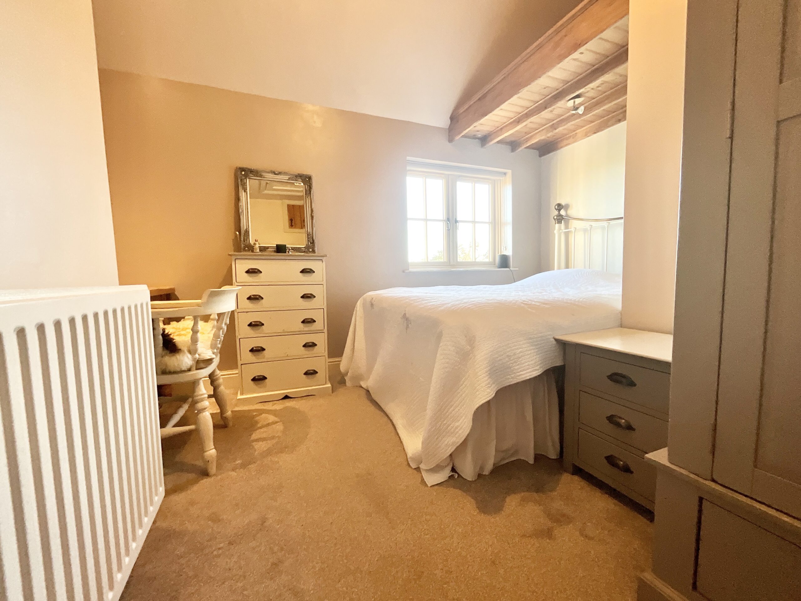 At the heart of the castle lies the kitchen/breakfast room, truly the keep of the home, proudly showcasing an array of cabinetry, oak worktops, a breakfast bar and integrated appliances. A cleverly tucked-away utility room keeps daily life running smoothly, while rear garden access invites you to step straight into your kingdom. Throughout the home, exposed beams and cottage details weave a tale of heritage and warmth, giving every room its own chapter. The living and dining rooms grace the front of the cottage, nestled within the original architecture. A multi-fuel burner commands centre stage in the living room, perfect for cosy evenings by the fire, while the charming front porch, accessible from both the living room and the front of the house, offers a storybook welcome. The dining room is a grand hall in its own right, ready for feasts, celebrations and entertaining loyal guests. A ground-floor cloakroom completes the level with royal practicality. Ascend the stairs to discover four bedrooms and two bathrooms. The master bedroom is a regal retreat, boasting built-in storage and a private en-suite. Bedrooms two and three are both generously sized doubles, while the fourth bedroom offers flexibility, ideal as a study, dressing room or nursery. The family bathroom features a walk-in shower, WC and vanity unit, while the en-suite tempts with a luxurious bathtub for indulgent soaks.