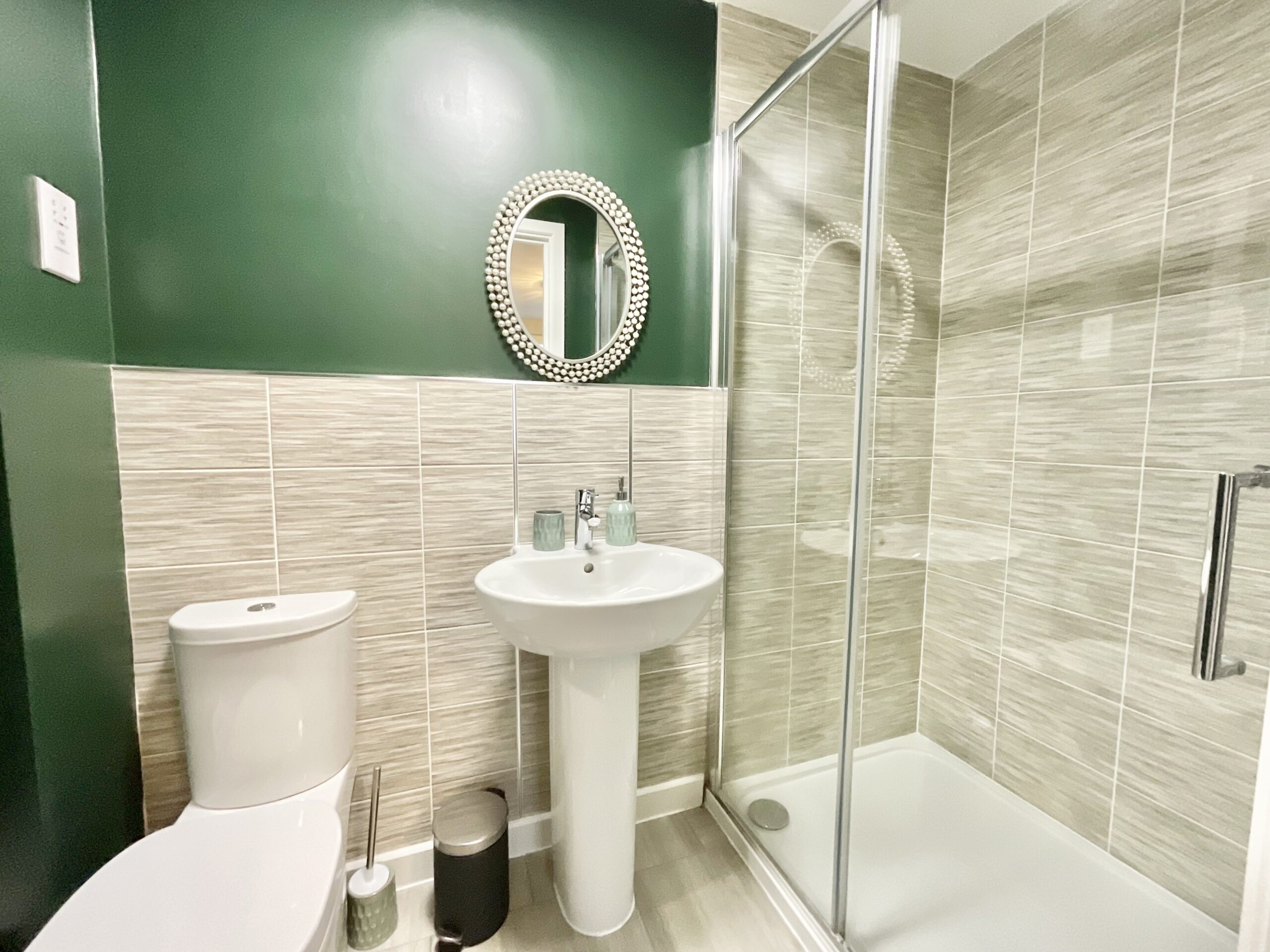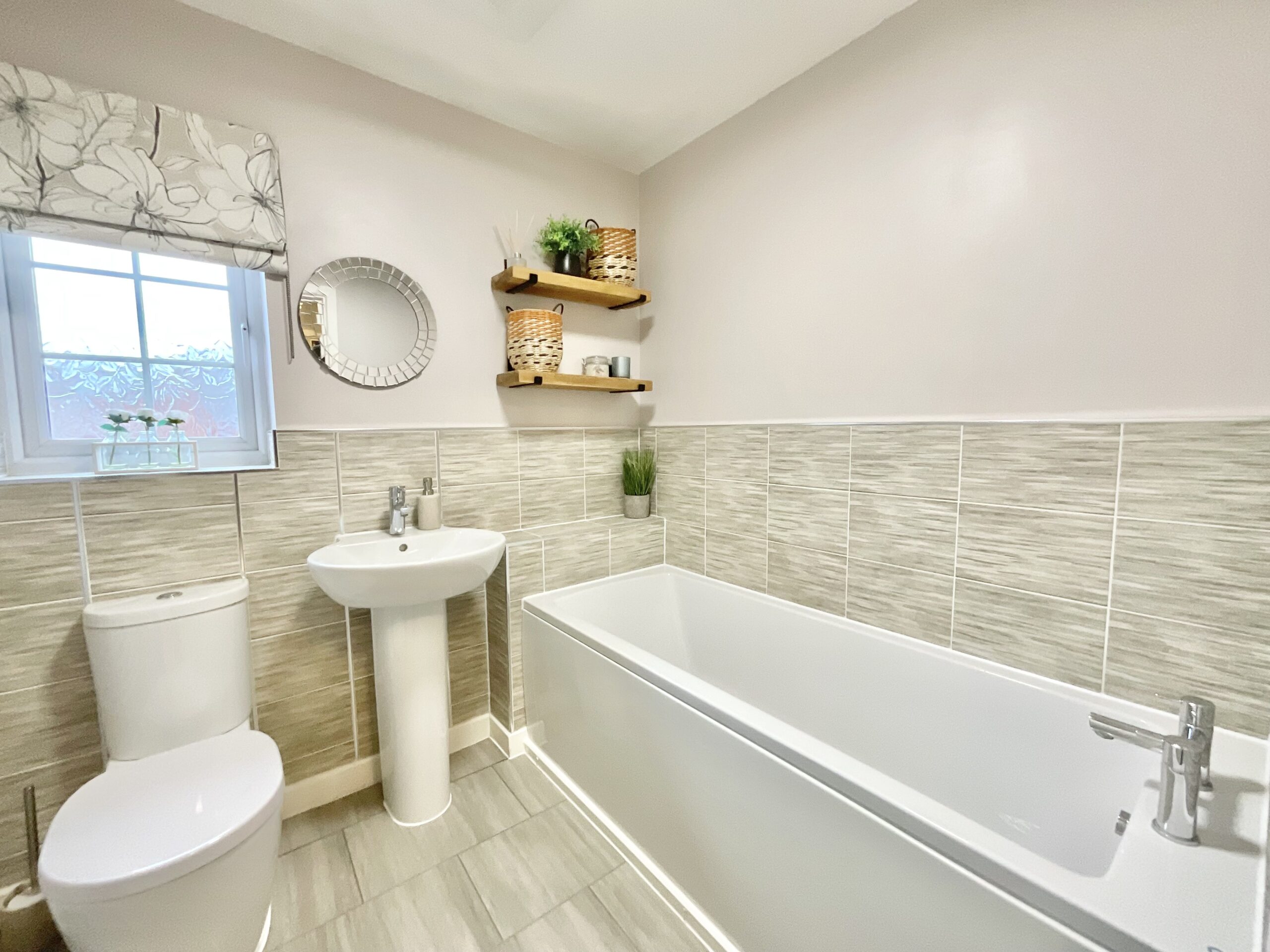 - Four generously sized bedrooms including a master bedroom with its own fitted wardrobes and en suite shower room. The bathroom offers sleek tiles, a bath, a sink, and a W/C.