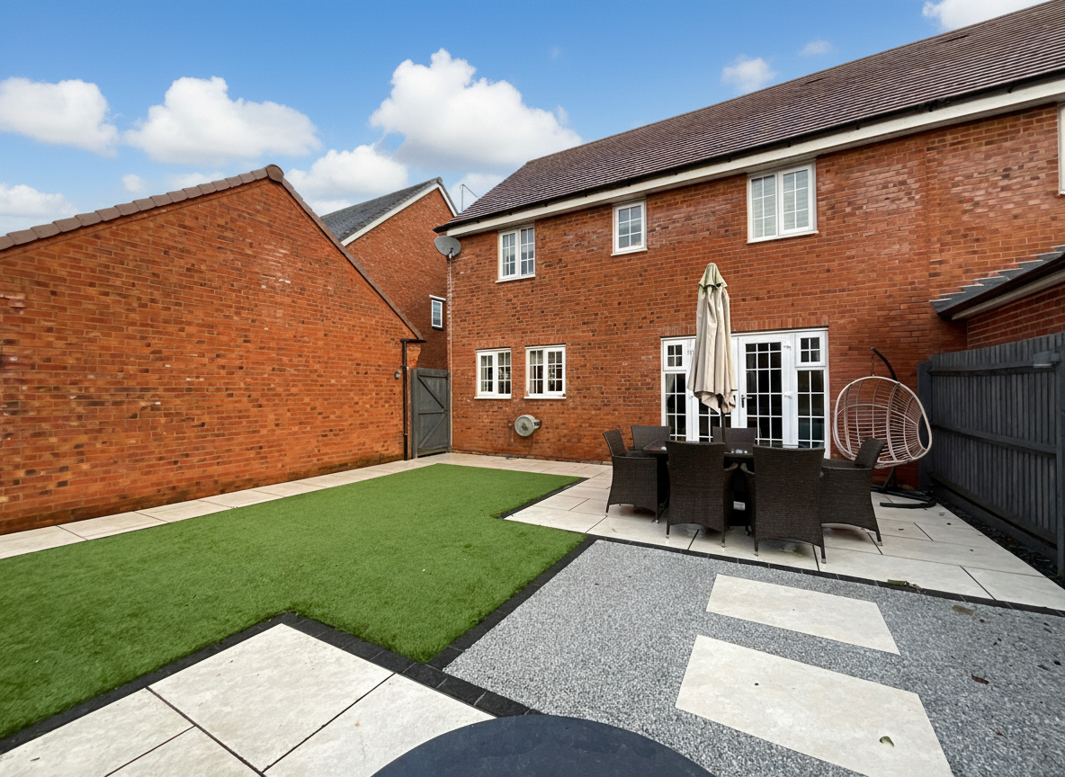 - Landscaped, South-facing rear garden boasting contemporary patio seating spaces and a lush artificial lawn.