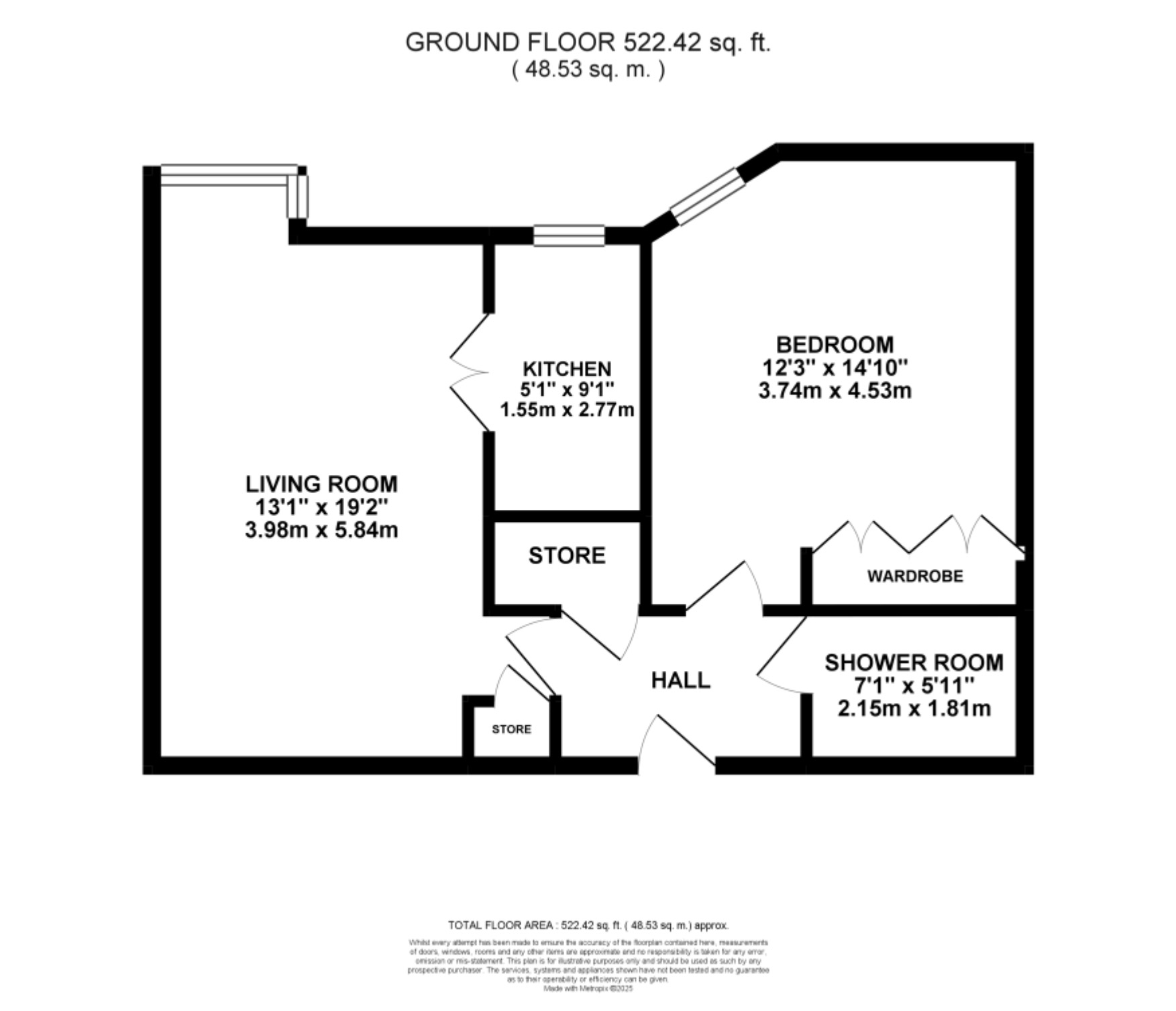 - Bright and spacious living room with floor-to-ceiling window, a practical U-shaped kitchen, and a generous shower room.